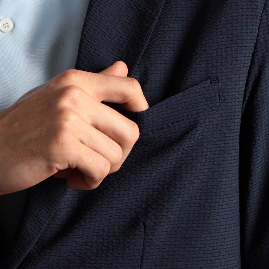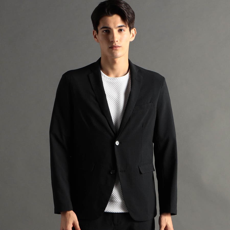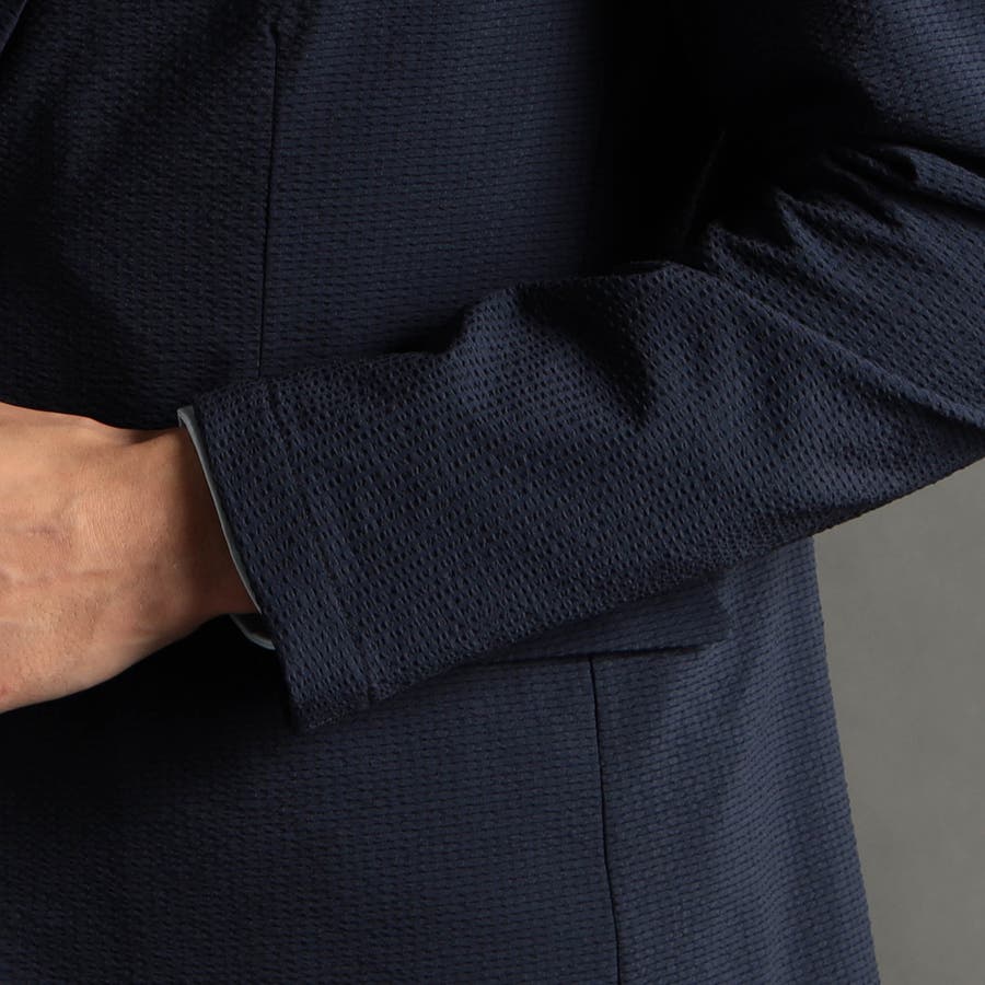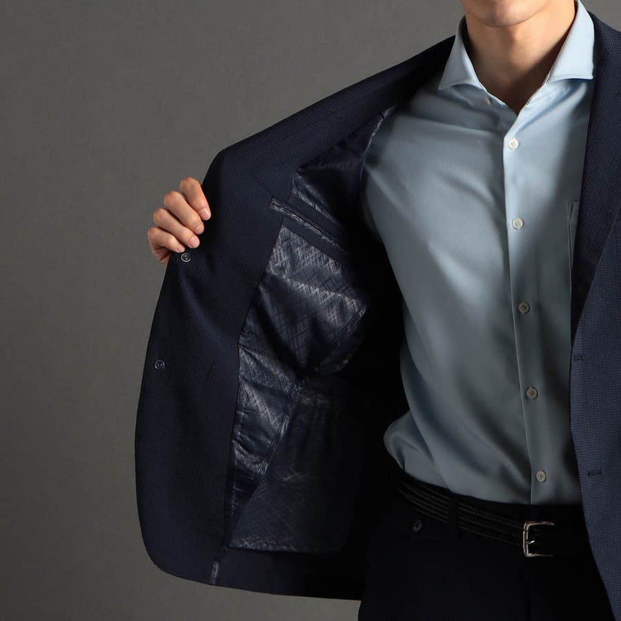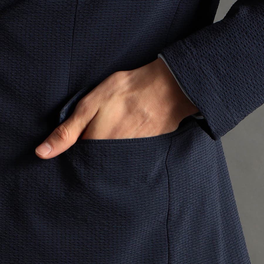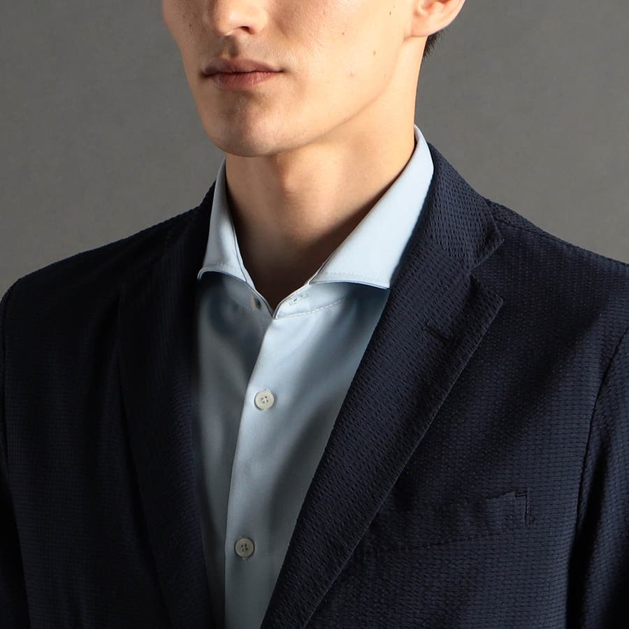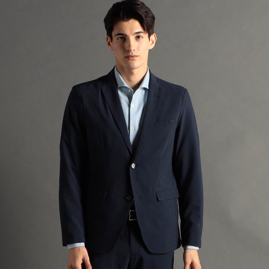 ミニマルなナローラペルに、ややスクエアラウンドしたフロントカットのベーシック二つボタンシングルジャケットです。ON/OFF兼用セットアップです。