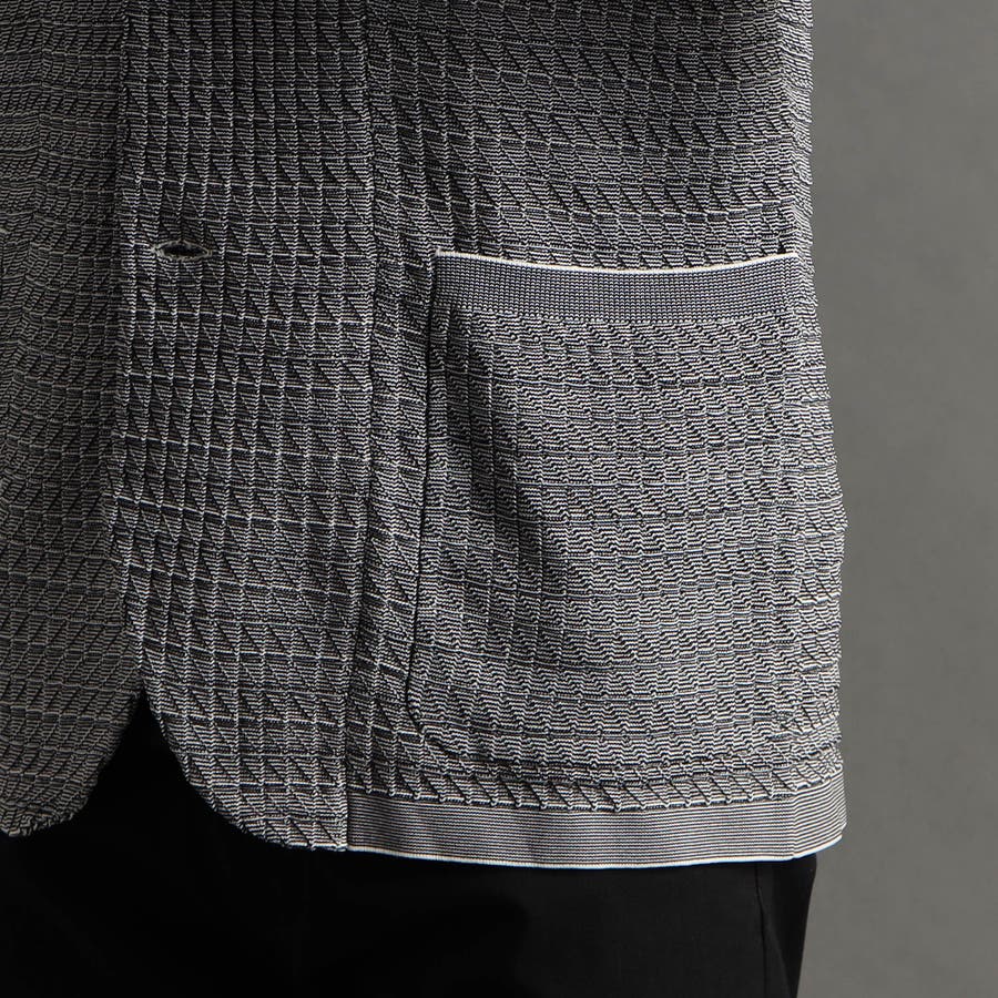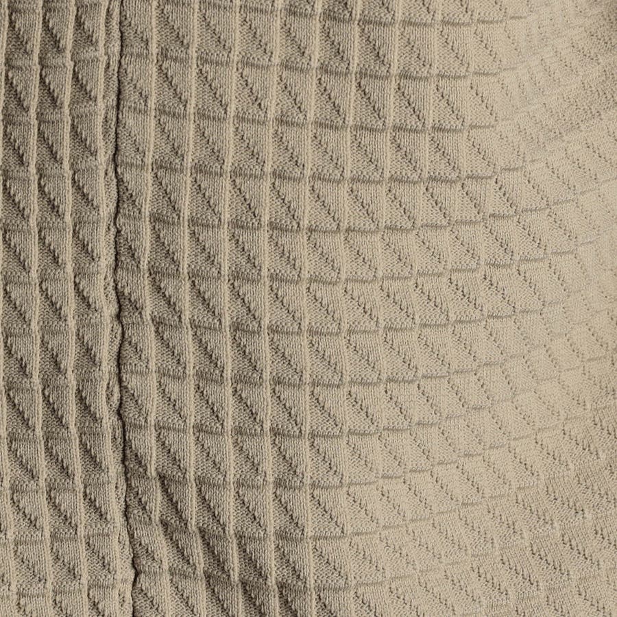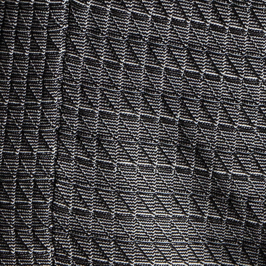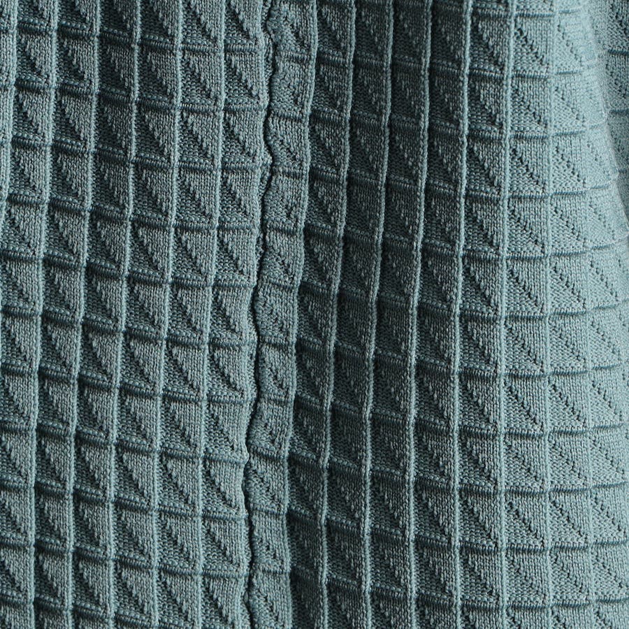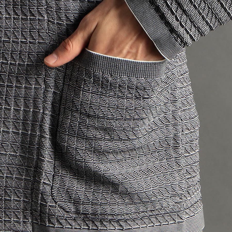 リンクスジャカードで立体感のあるジオメトリック柄を表現。ニットならではの軽さと通気性の良さが魅力です。今季は、縦柄に刷新し、モードに仕上げました。