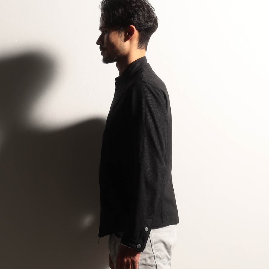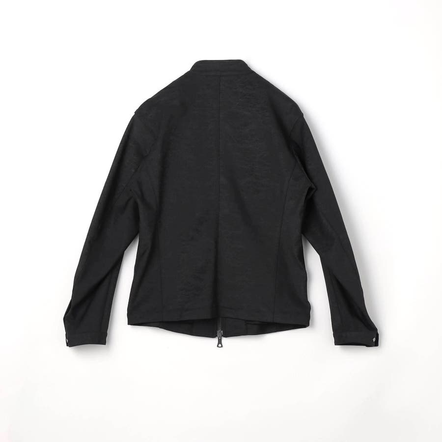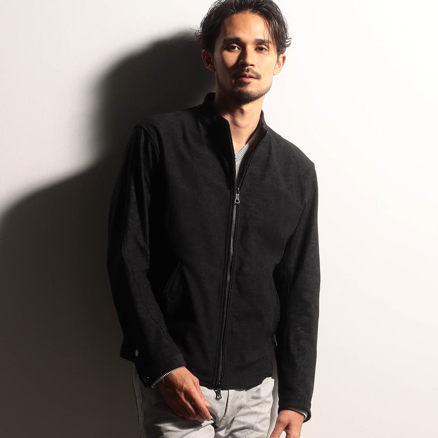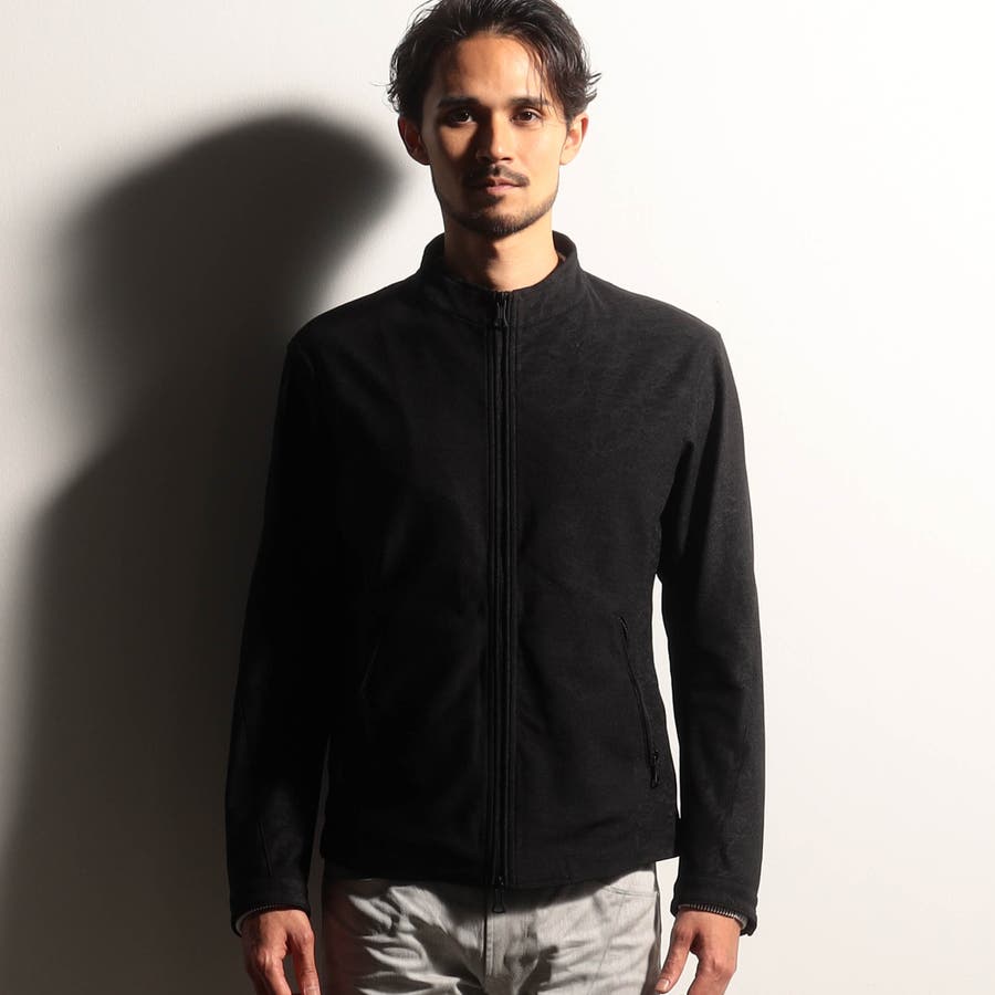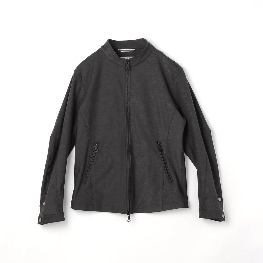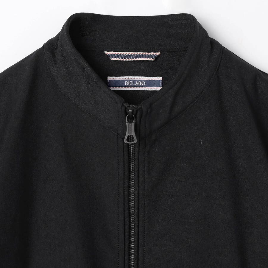 シャープなシルエットのショートスタンドブルゾン。ウエストをシェイプさせた綺麗なシルエットと切り替えを利用した立体的なライダース袖が特徴です。衿端にはワイヤーを入れ、リエラボ別注ファスナーやオリジナルドット釦を使いアクセントにしています。ハイテンションのカットソー素材になりますのでとても着やすく、レザーブルゾン感覚でスタリングも合わせやすいです。