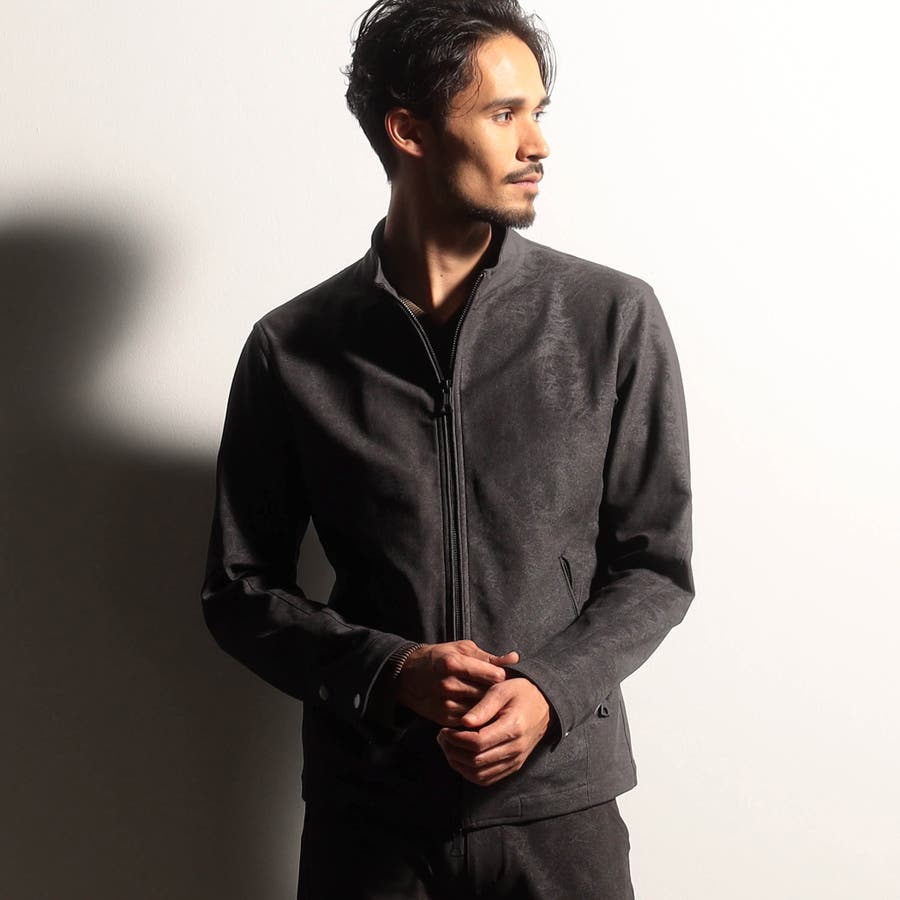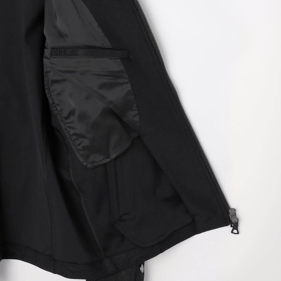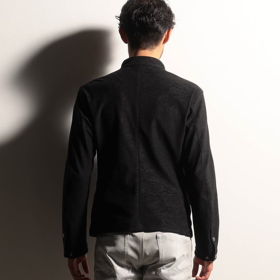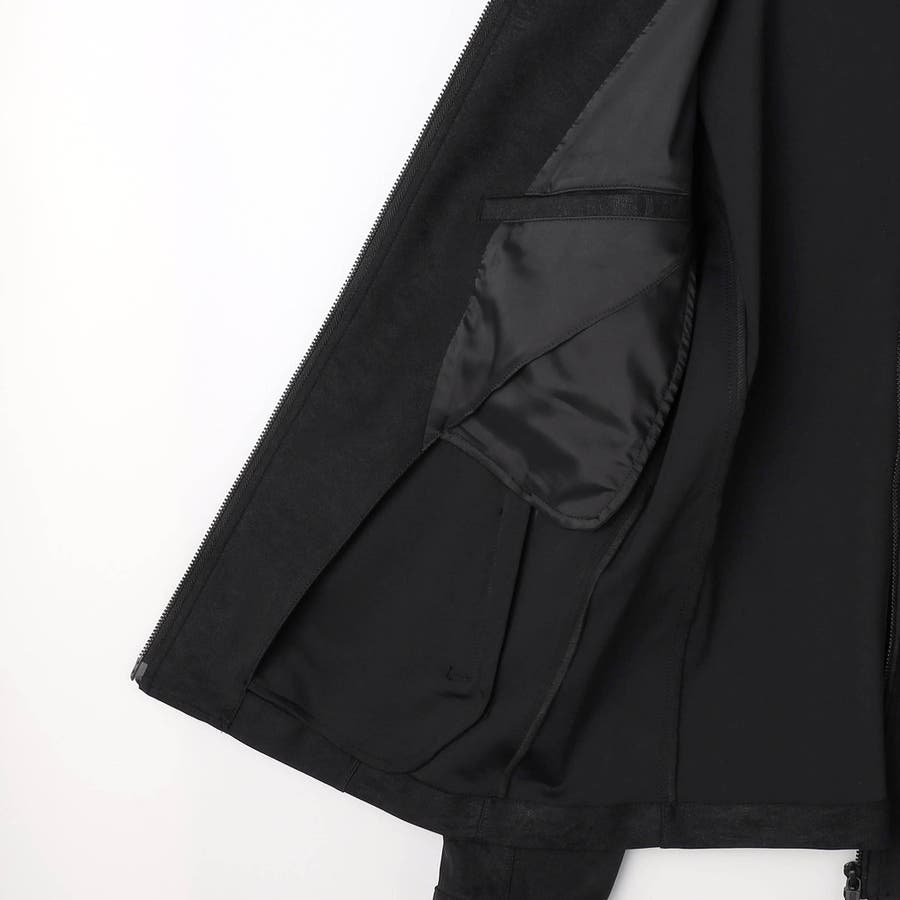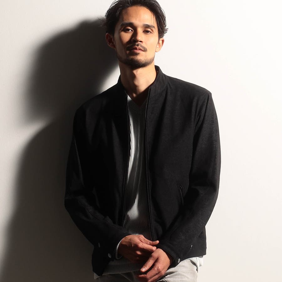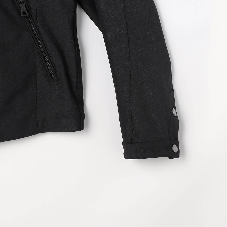 シャープなシルエットのショートスタンドブルゾン。ウエストをシェイプさせた綺麗なシルエットと切り替えを利用した立体的なライダース袖が特徴です。衿端にはワイヤーを入れ、リエラボ別注ファスナーやオリジナルドット釦を使いアクセントにしています。ハイテンションのカットソー素材になりますのでとても着やすく、レザーブルゾン感覚でスタリングも合わせやすいです。