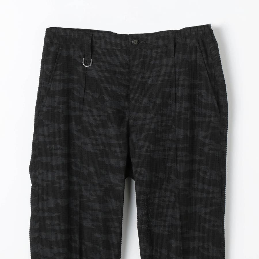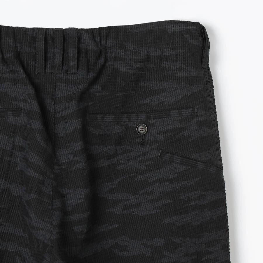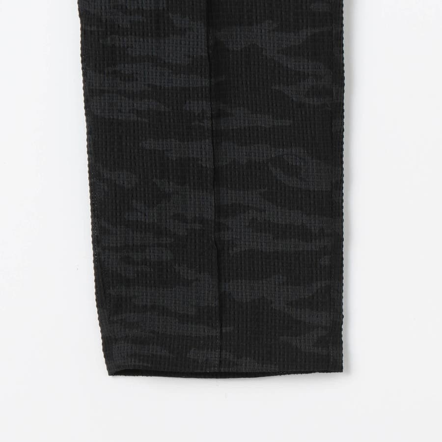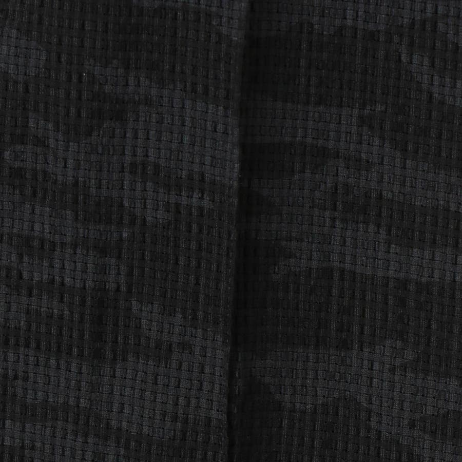 ポリエステルとレーヨンの混紡糸を使用したオウトツ感のある変わり織り素材をベースに、オリジナルの迷彩柄を転写プリントしました。オウトツ感ある素材感は肌離れが良く、メッシュの様な通気孔による高通気性は夏でもサラッとした快適な着心地を提供してくれます。家庭洗濯出来て、シワになり辛く、乾きやすいイージーケア性も魅力です。薄っすらと控え目な迷彩柄は上品で大人っぽい感じです。