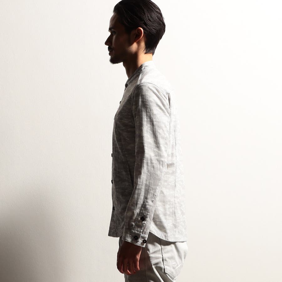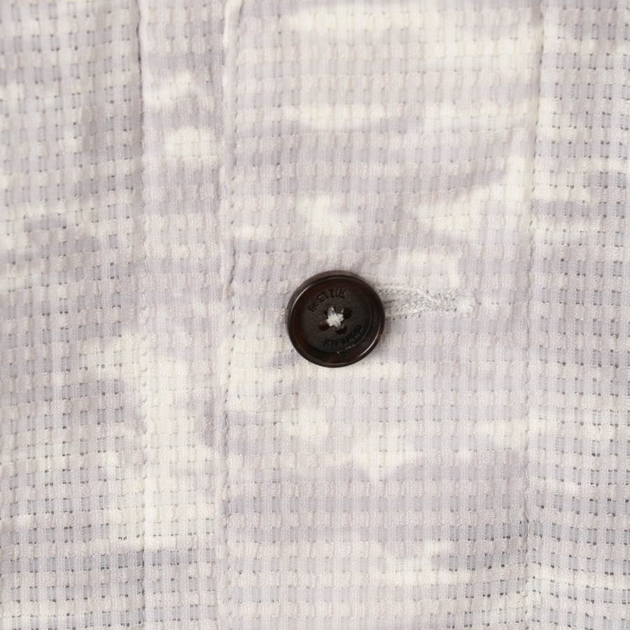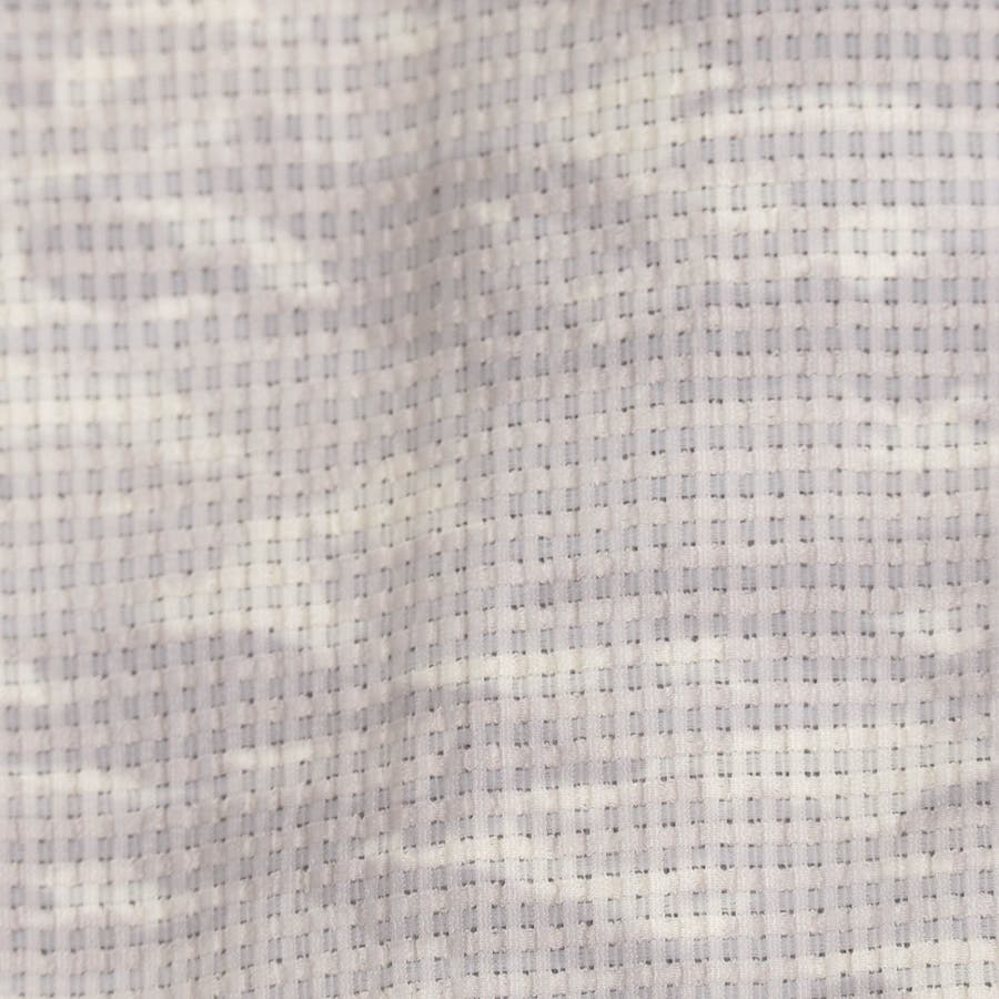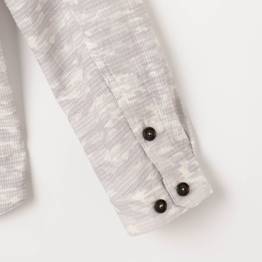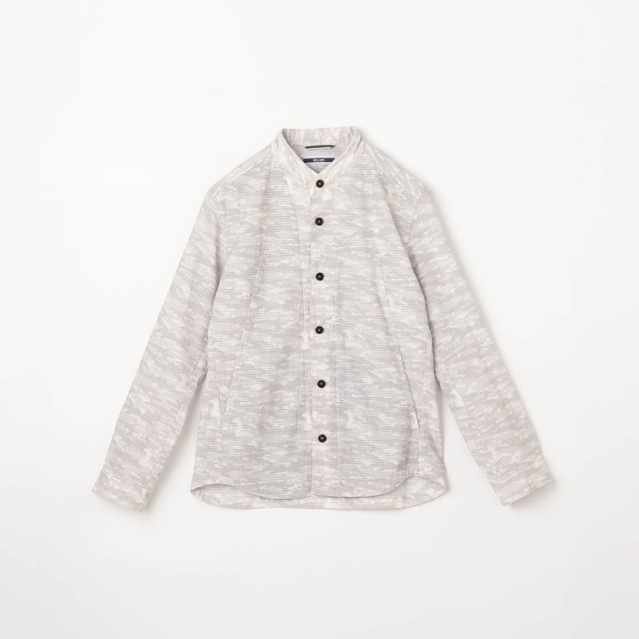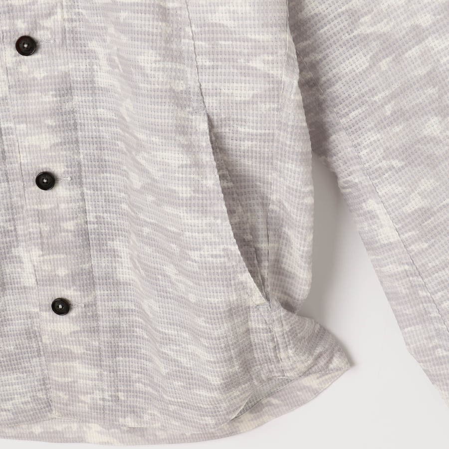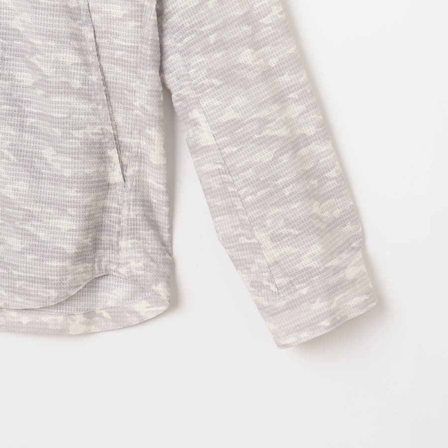 ポリエステルとレーヨンの混紡糸を使用したオウトツ感のある変わり織り素材をベースに、オリジナルの迷彩柄を転写プリントしました。オウトツ感ある素材感は肌離れが良く、メッシュの様な通気孔による高通気性は夏でもサラッとした快適な着心地を提供してくれます。家庭洗濯出来て、シワになり辛く、乾きやすいイージーケア性も魅力です。薄っすらと控え目な迷彩柄は上品で大人っぽい感じです。