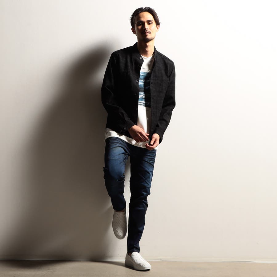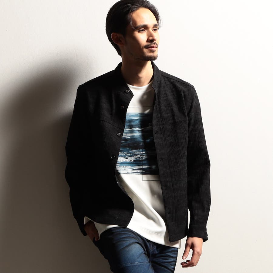 衿端にワイヤ-を仕込んだショートスタンドカラ-シャツ。脇ポケットを作り、軽いシャツブルゾン感覚に作りました。台衿から身頃のつながり、釦を開けた時の見え方が綺麗に見える様にしています。身頃に入れた切り替え利用のスラッシュポケットでスッキリ見せ、リエラボ別注の水牛釦を採用してアクセントにしています。