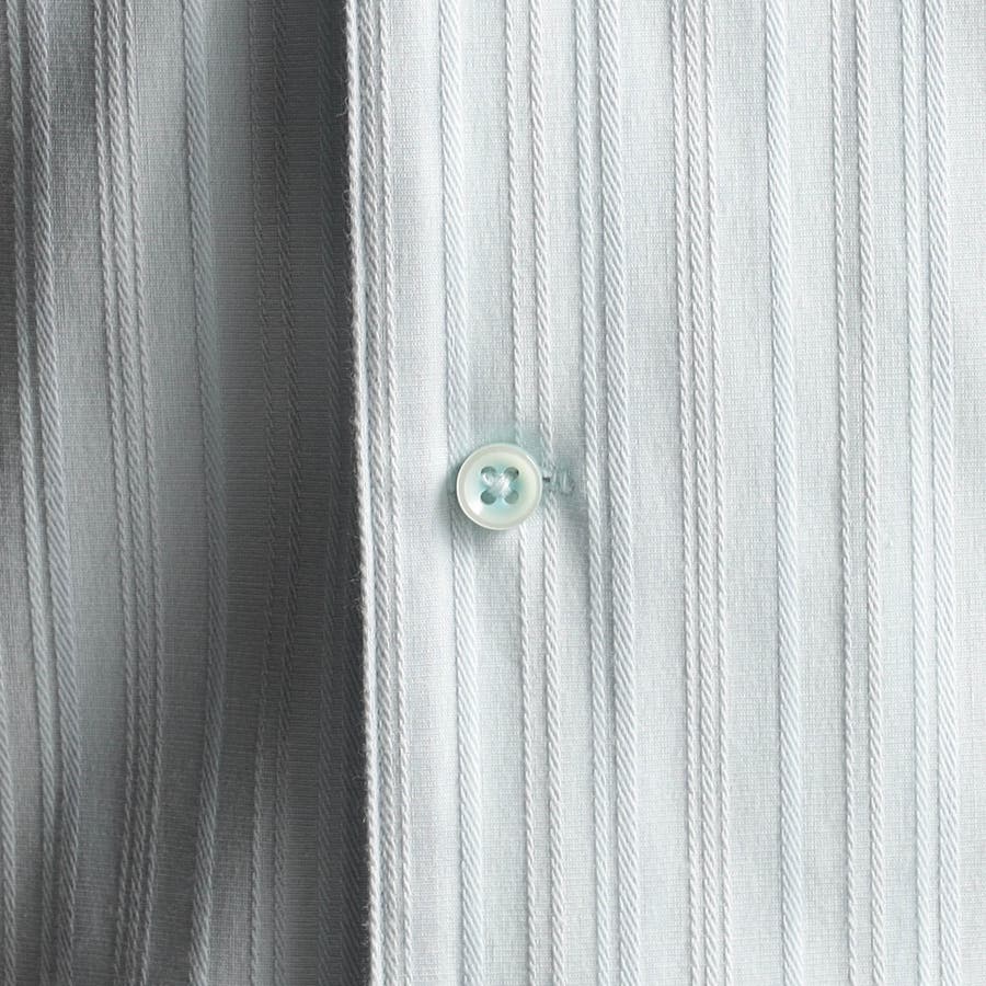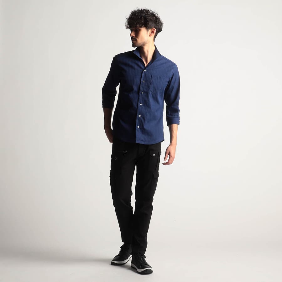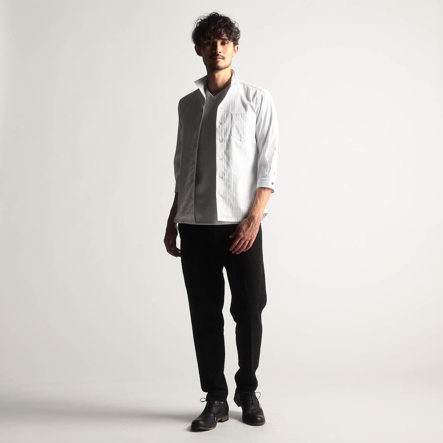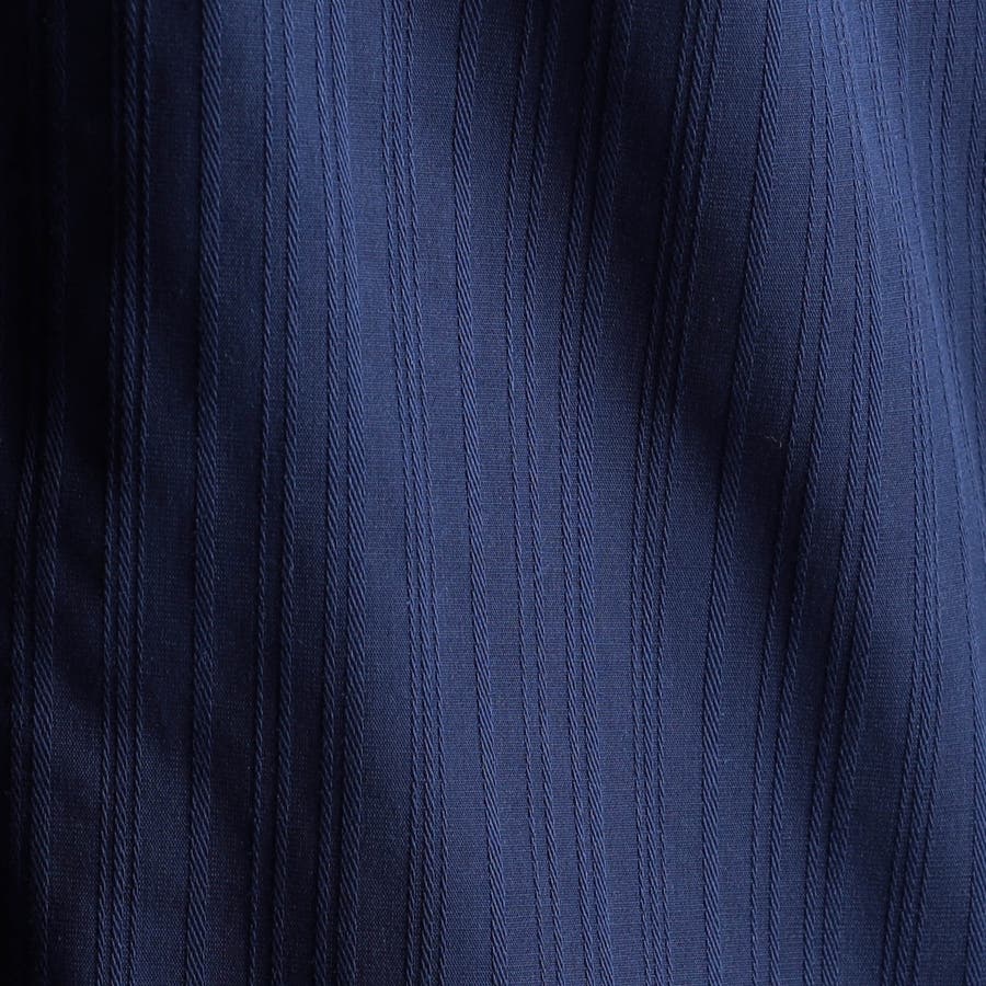 人気定番、衿端にワイヤ-を仕込んだスタンドカラ-シャツ。袖丈は肘下の7分丈デザイン。カフス裏や裾裏には裏面のストライプ柄を使いアクセントになる様にしています。生地の配色とリンクした釦も、ちょっとしたアクセントになっています。