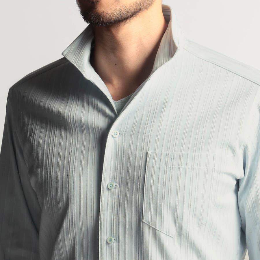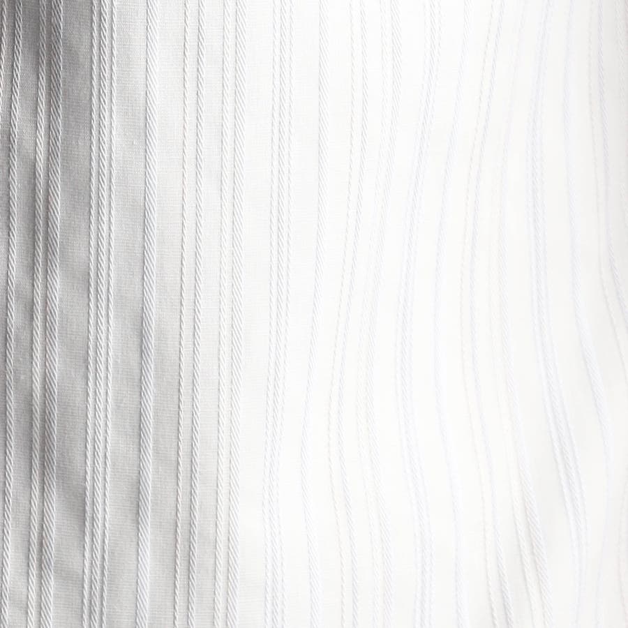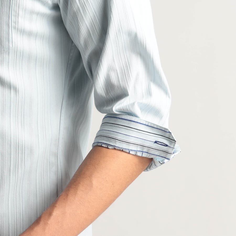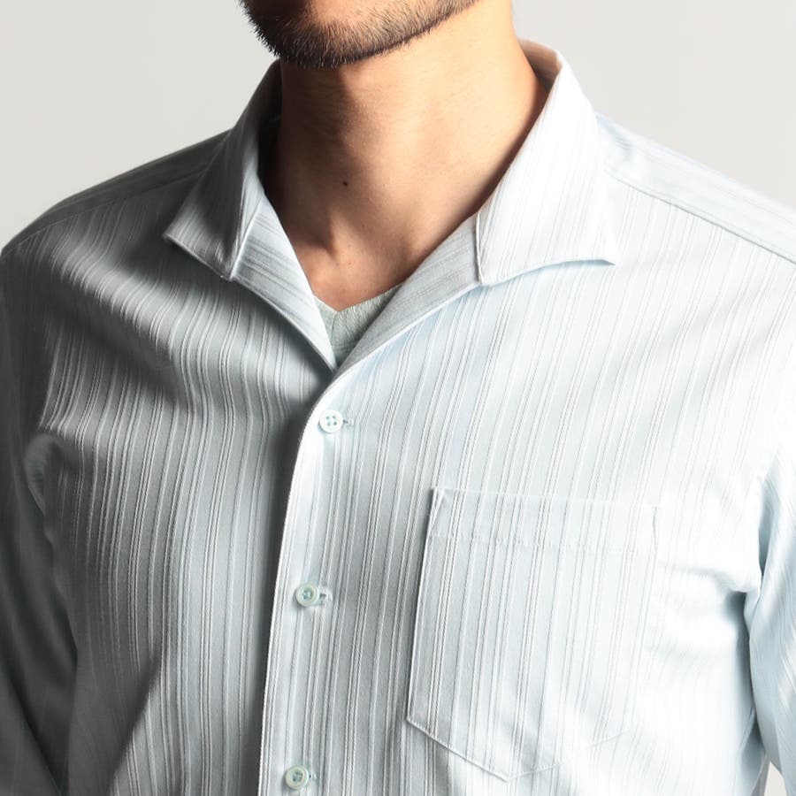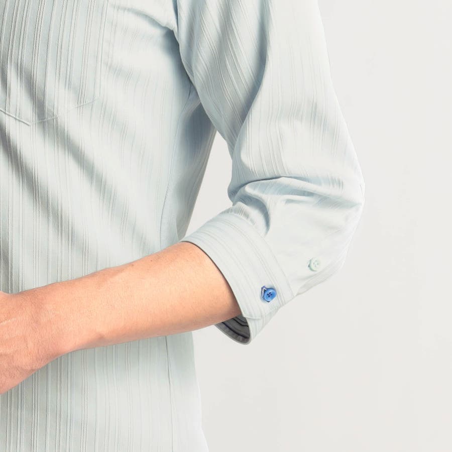 人気定番、衿端にワイヤ-を仕込んだスタンドカラ-シャツ。袖丈は肘下の7分丈デザイン。カフス裏や裾裏には裏面のストライプ柄を使いアクセントになる様にしています。生地の配色とリンクした釦も、ちょっとしたアクセントになっています。