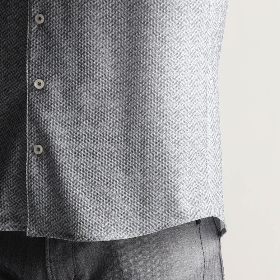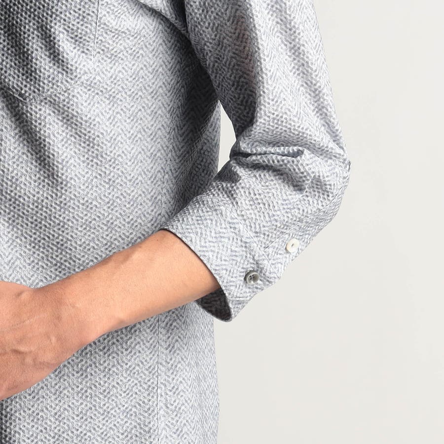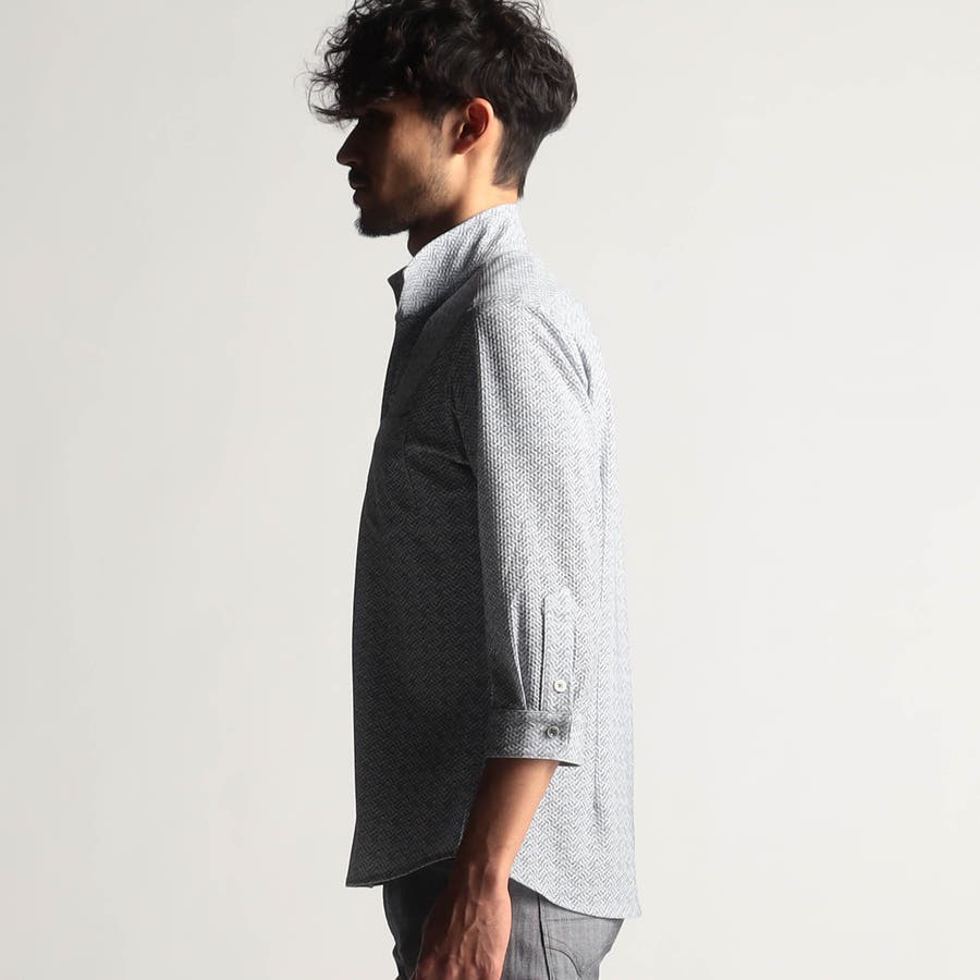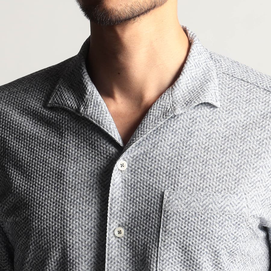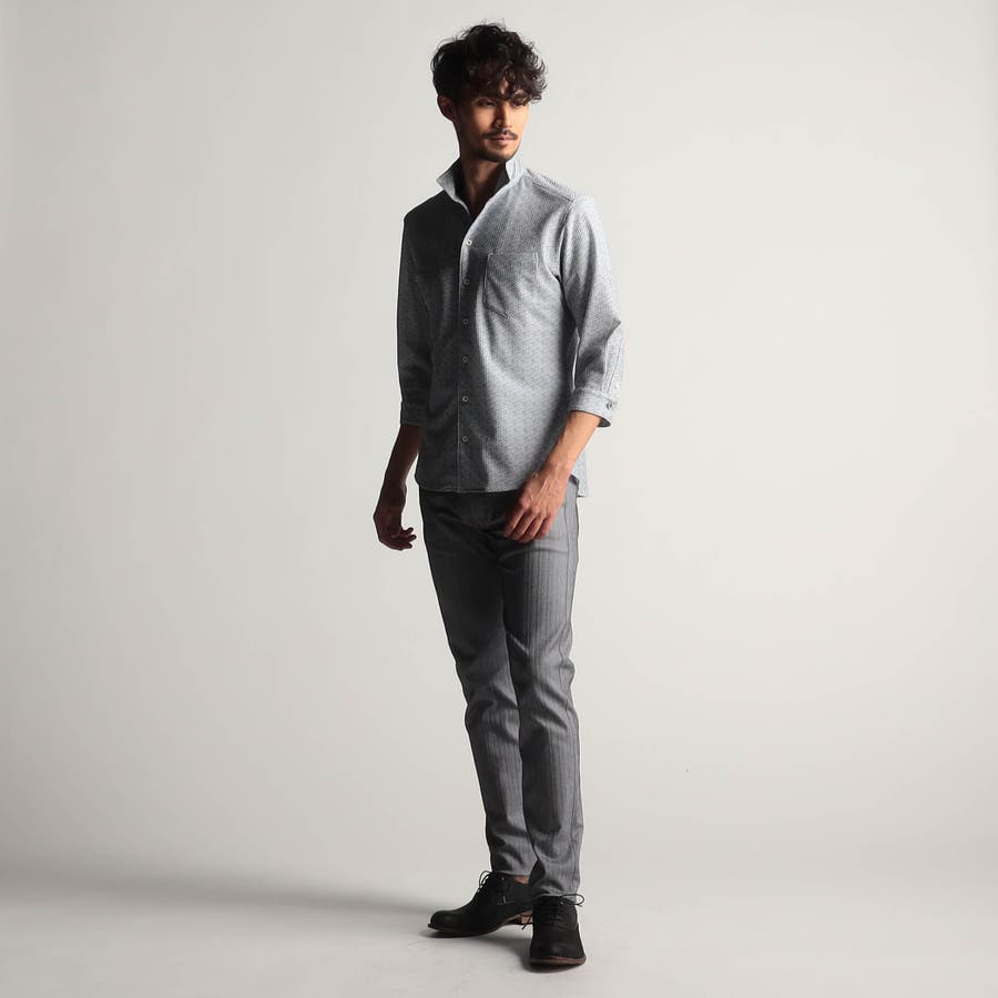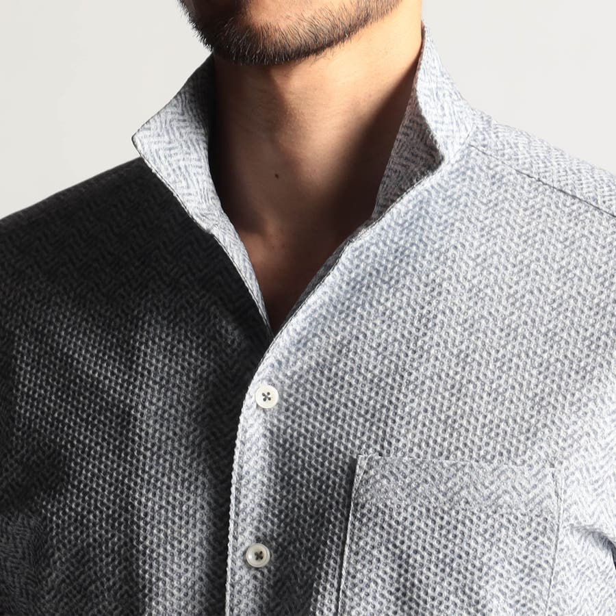 衿端にワイヤ-を仕込んだスタンドカラ-シャツ。袖丈は肘下の7分丈デザイン。左胸にパッチポケットを付け、後身頃でダーツを入れてシルエットを細く見せています。プリントの配色に合わせた釦付け糸と袖口の配色釦はちょっとしたアクセントになっています。