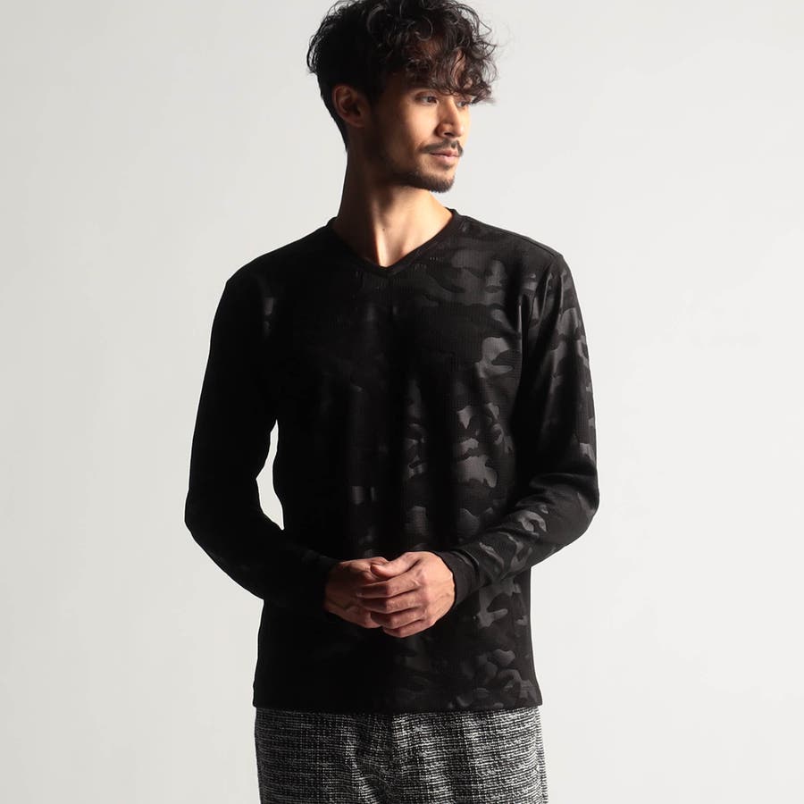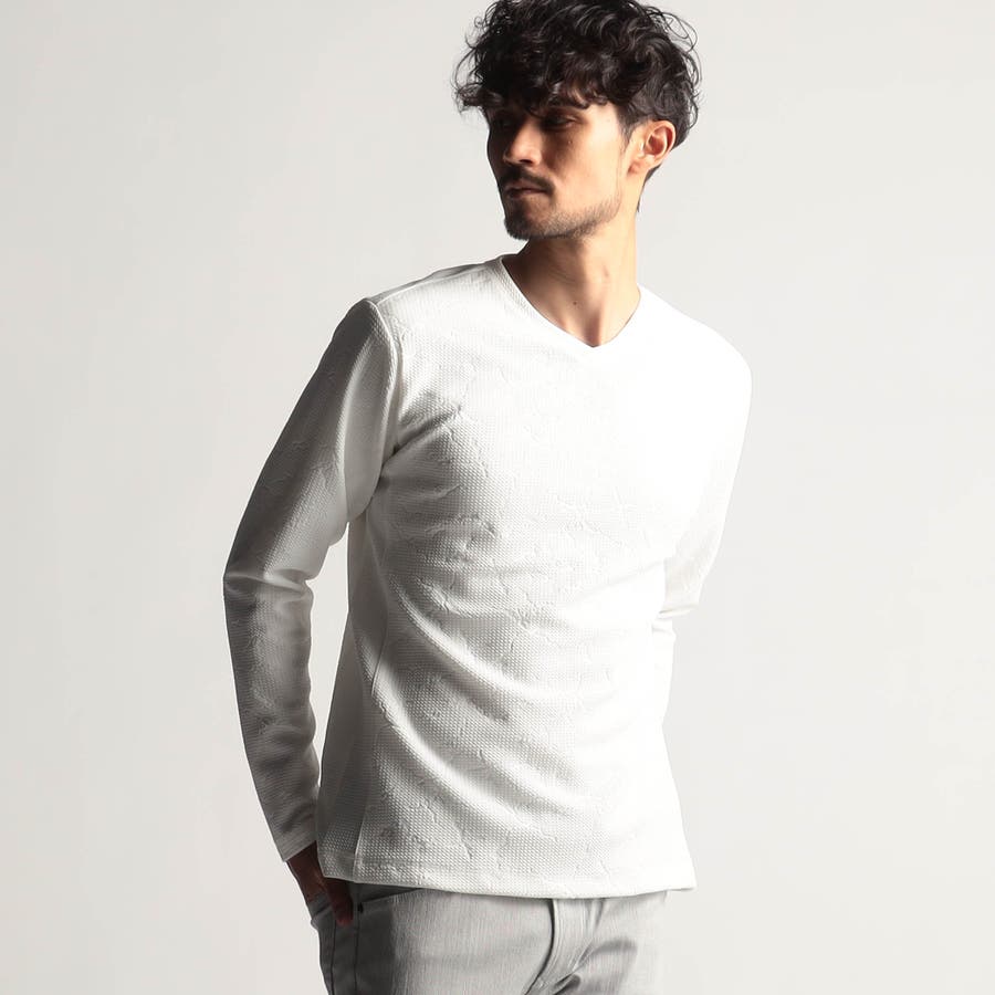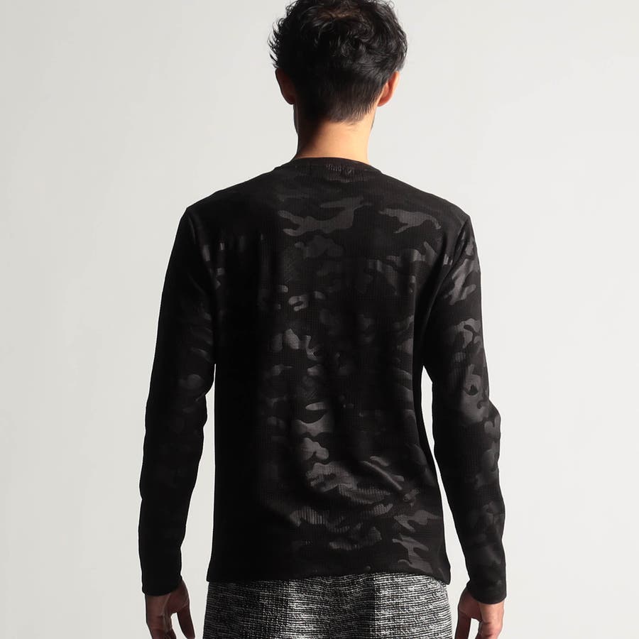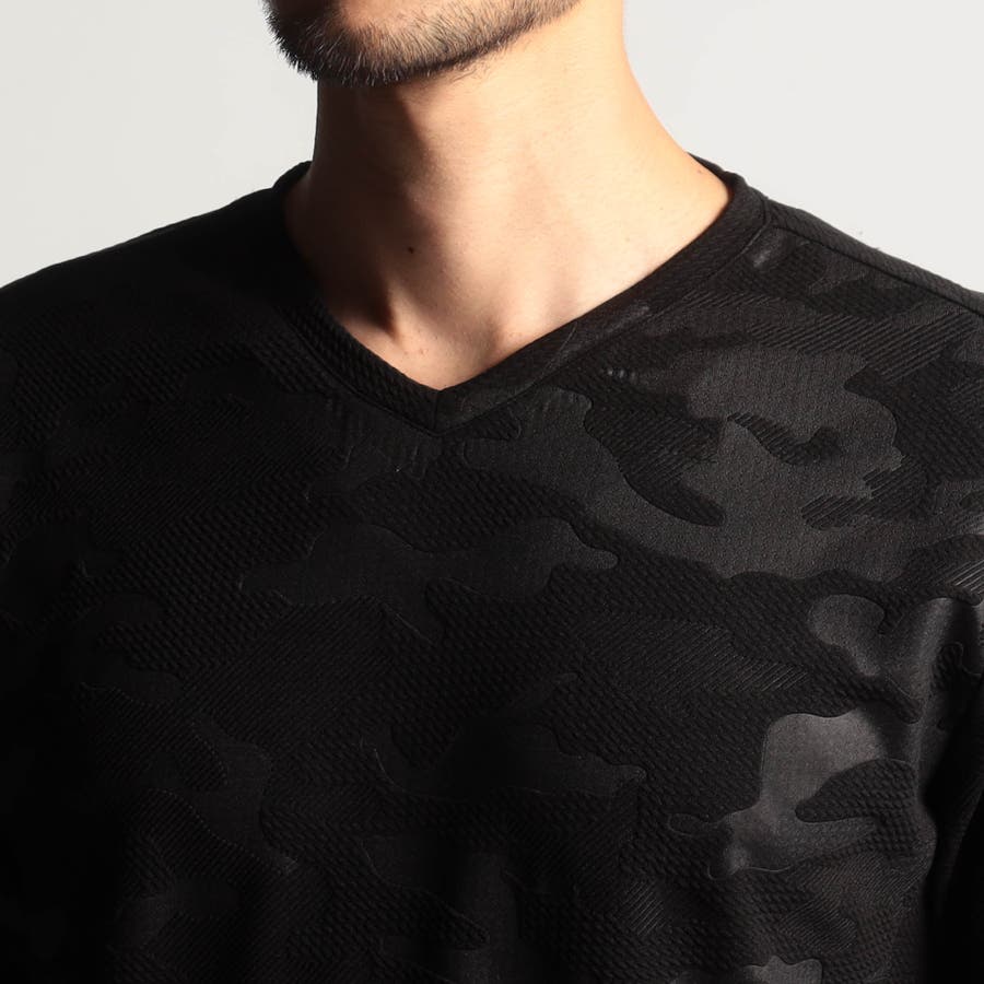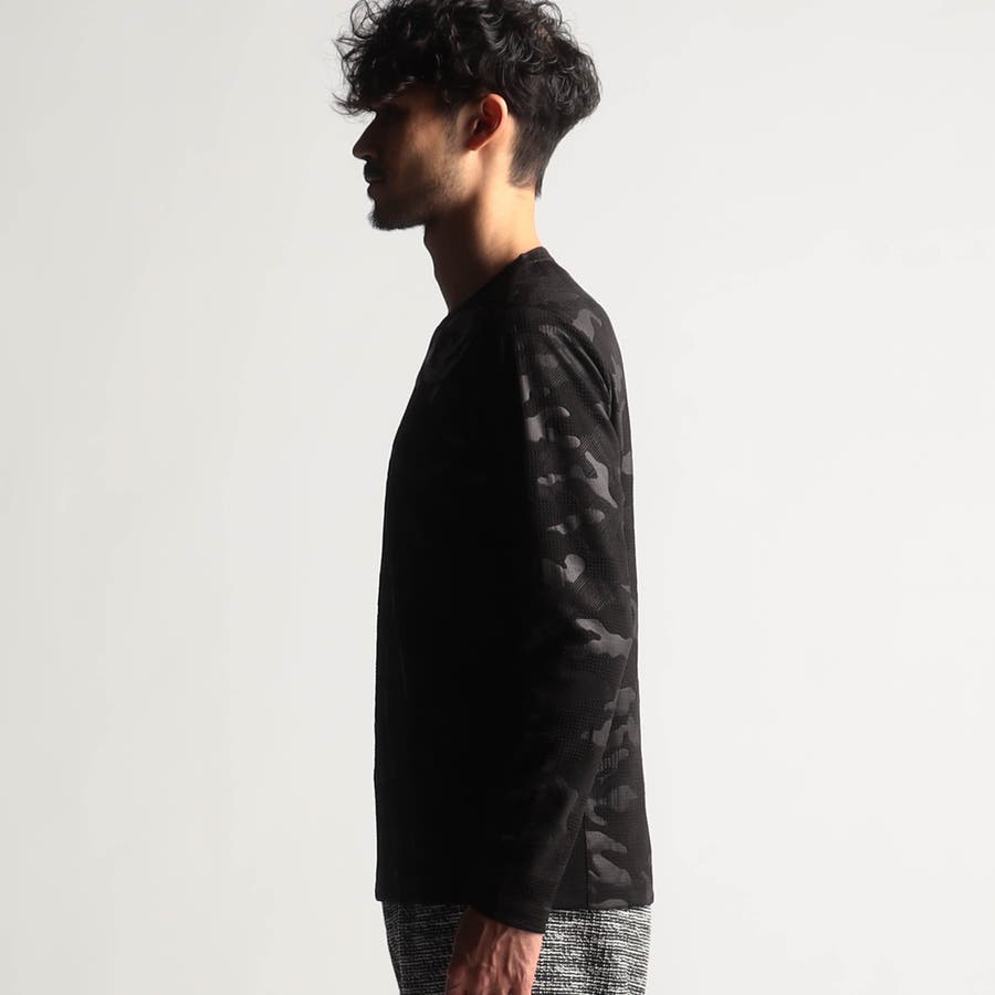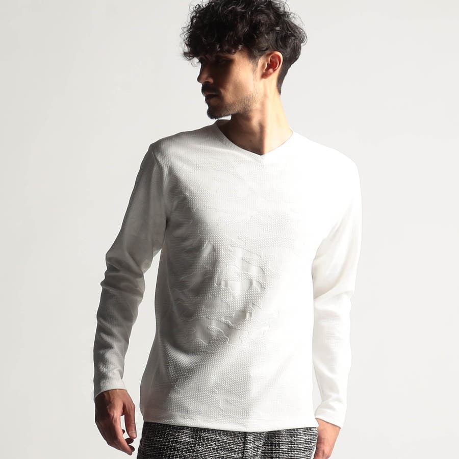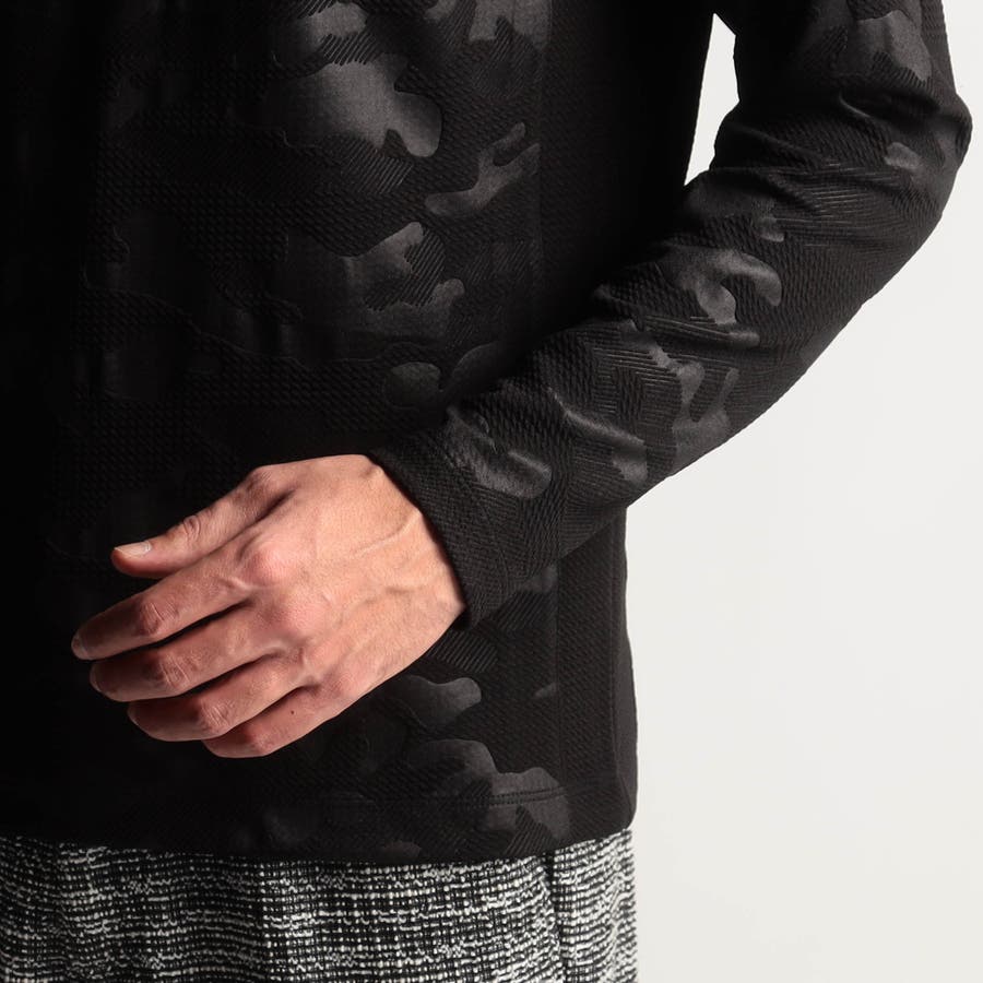 身頃・袖にカモフラ・クラック柄のエンボス生地、細腹パ-ツにエンボスなしの生地を切替えに使用することで、視覚的ギミックと着用時の立体的なフォルムを演出しています。