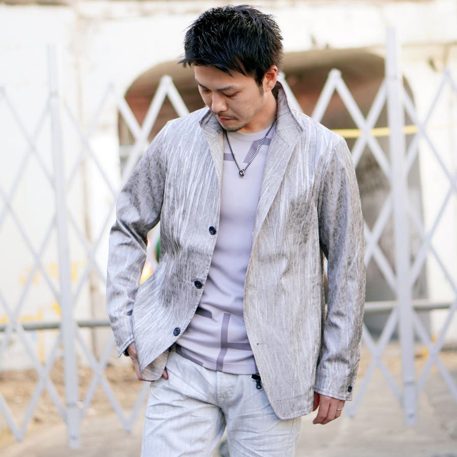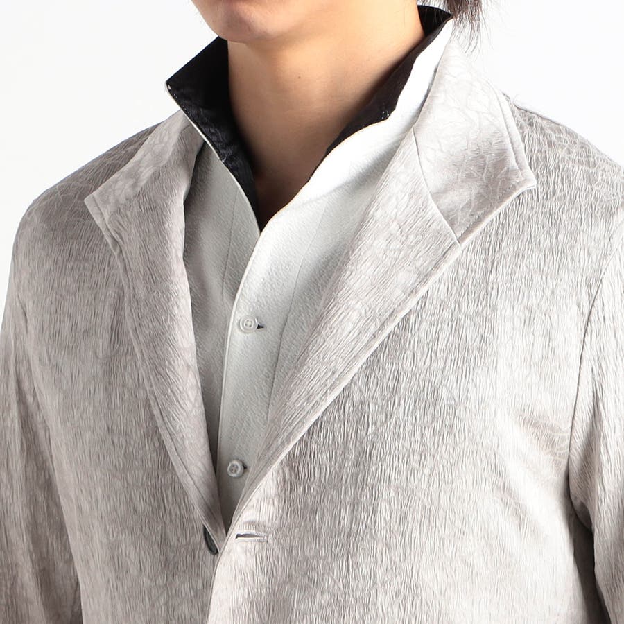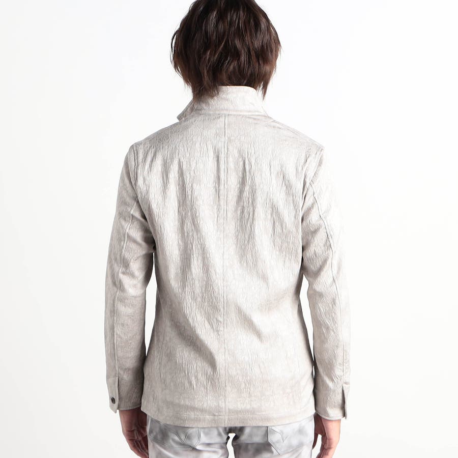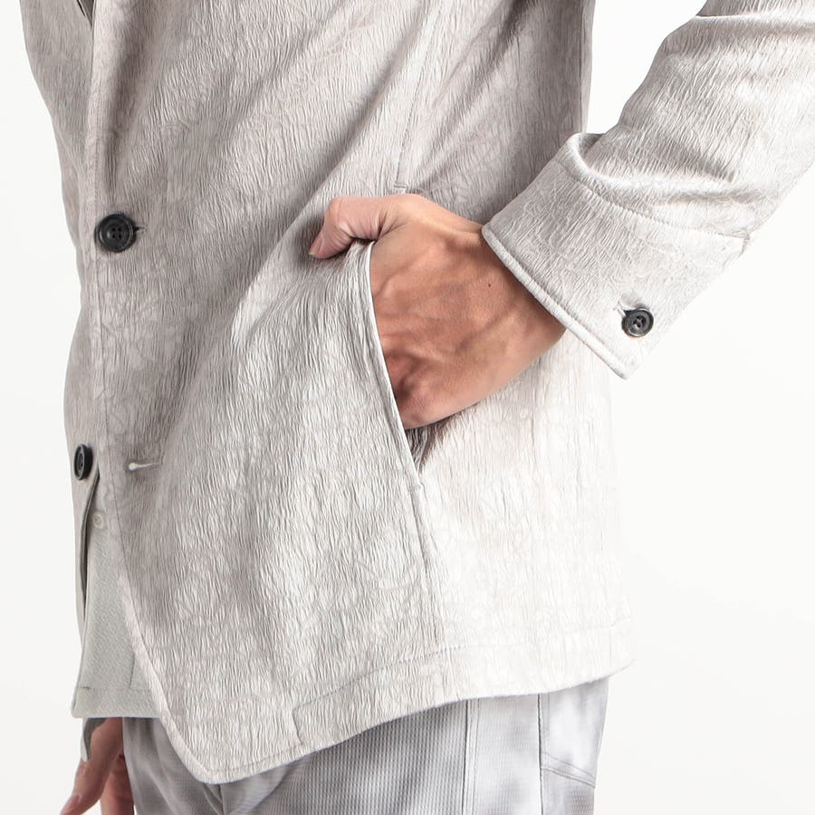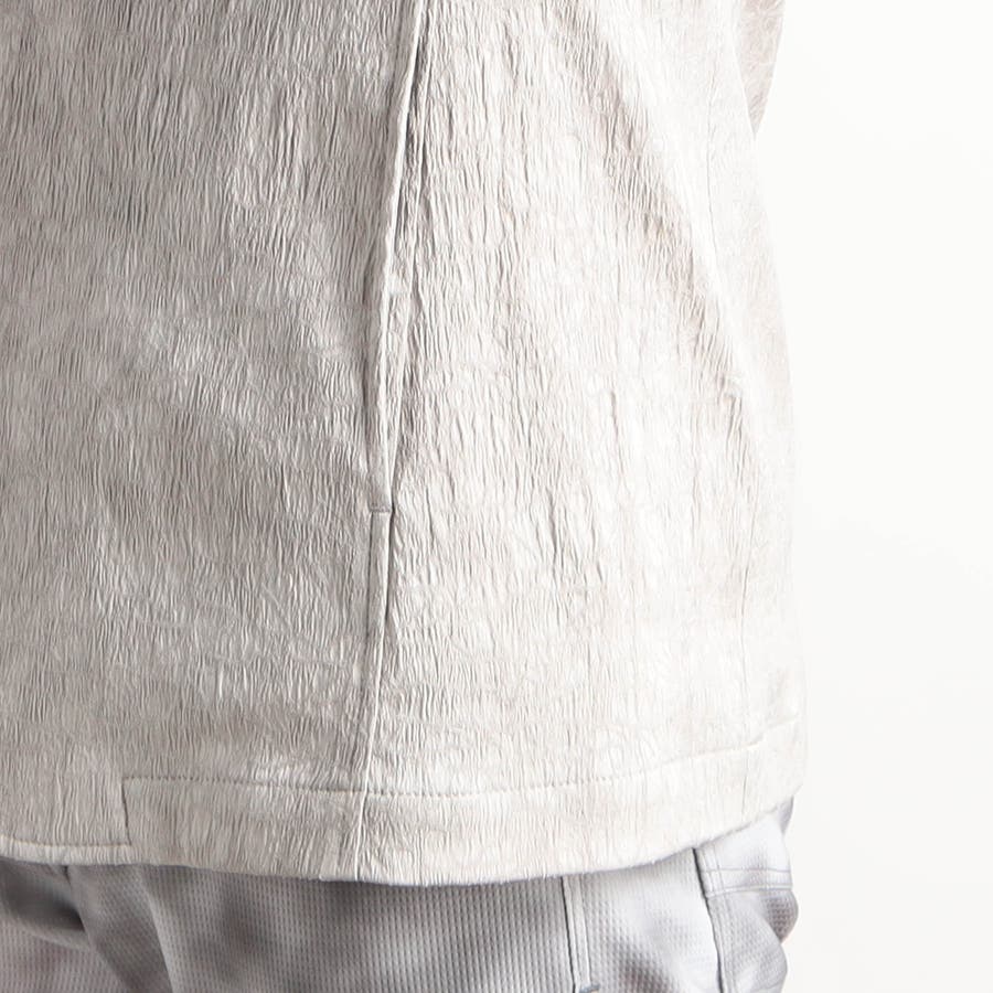 ポリエステルとナイロンの混紡糸を使用したジャカード素材の表面に顔料系のカラーコーティングを施しました。合繊特有の上品な光沢があり、しなやかさタッチ感とストレッチ性が快適な着心地を提供してくれます。素材のシワと凹凸で色の差が出る面白い素材です。
