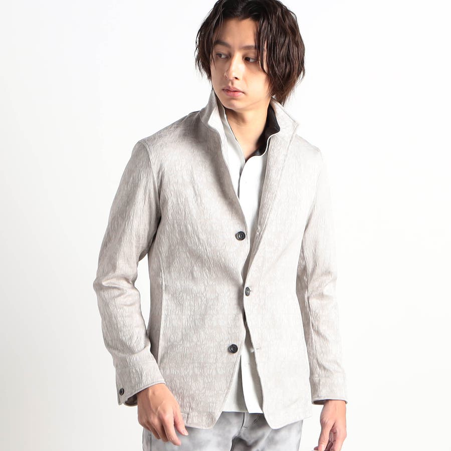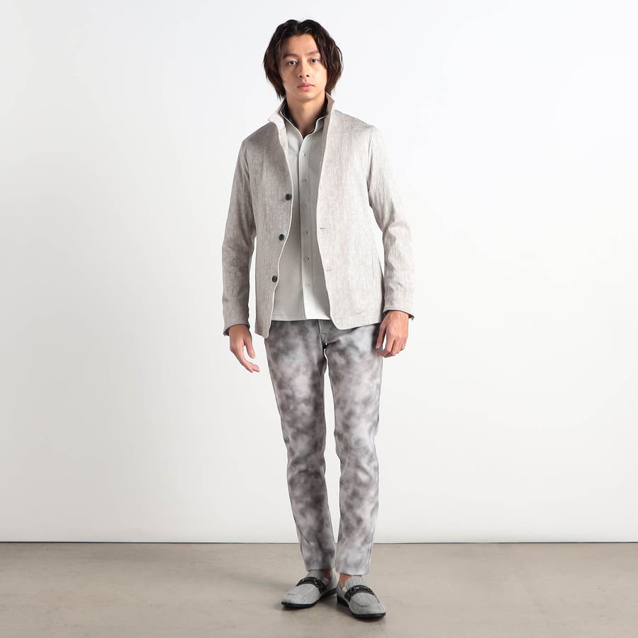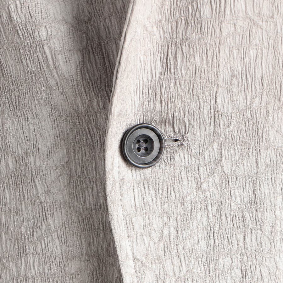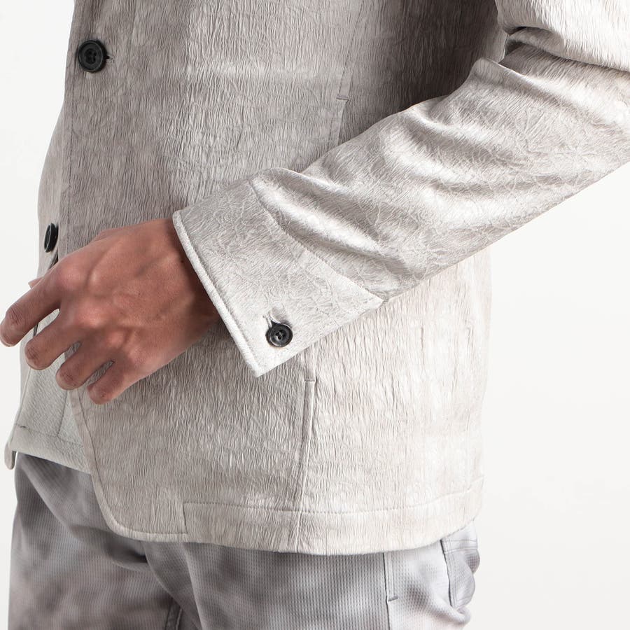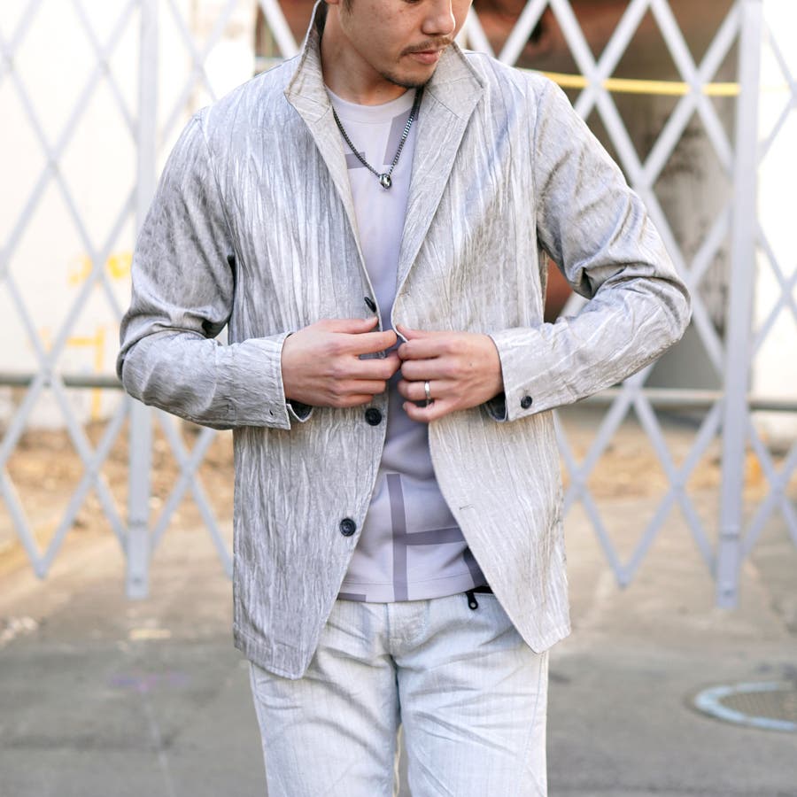 ポリエステルとナイロンの混紡糸を使用したジャカード素材の表面に顔料系のカラーコーティングを施しました。合繊特有の上品な光沢があり、しなやかさタッチ感とストレッチ性が快適な着心地を提供してくれます。素材のシワと凹凸で色の差が出る面白い素材です。