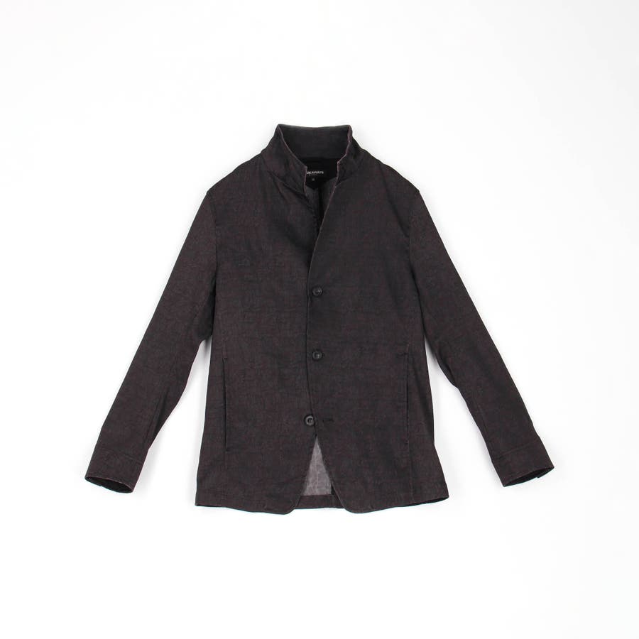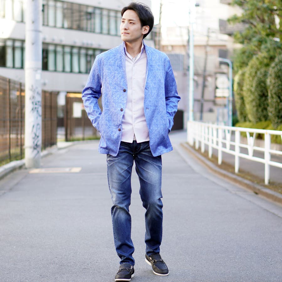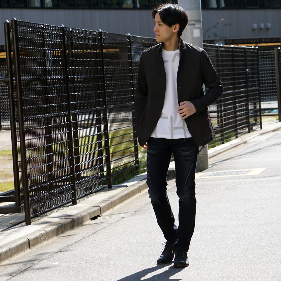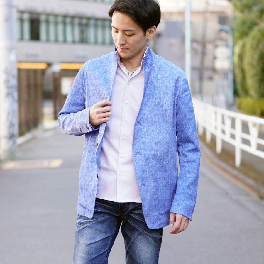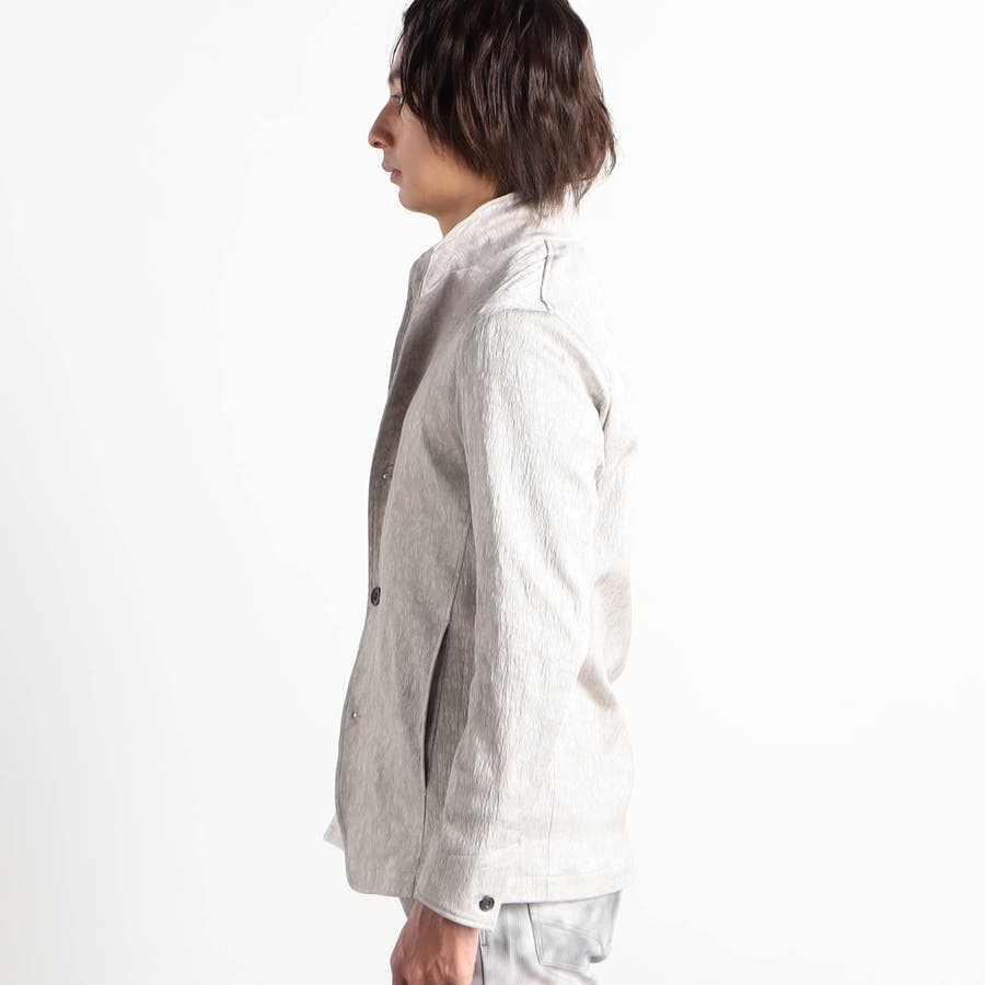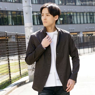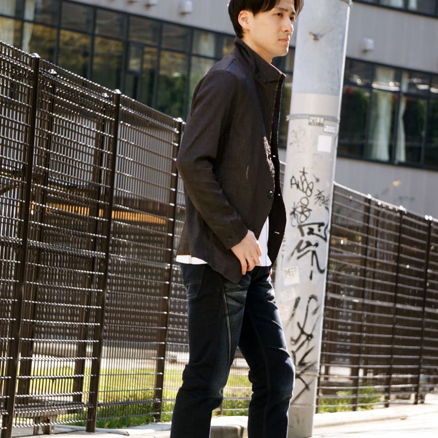 スタンドカラーのカバーオールジャケット。衿は通常よりも低めのスッキリとした設定にしております。