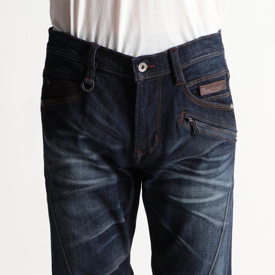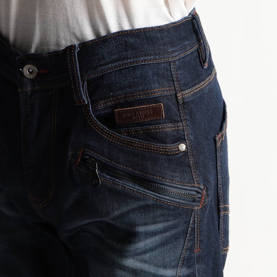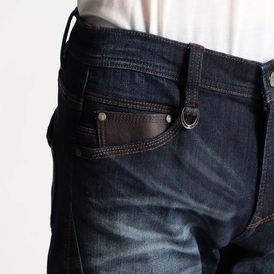5ポケットデザインをベースにファスナーポケットとオリジナル牛革パーツをアクセントにした高品質デニムです。