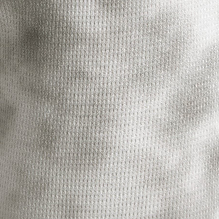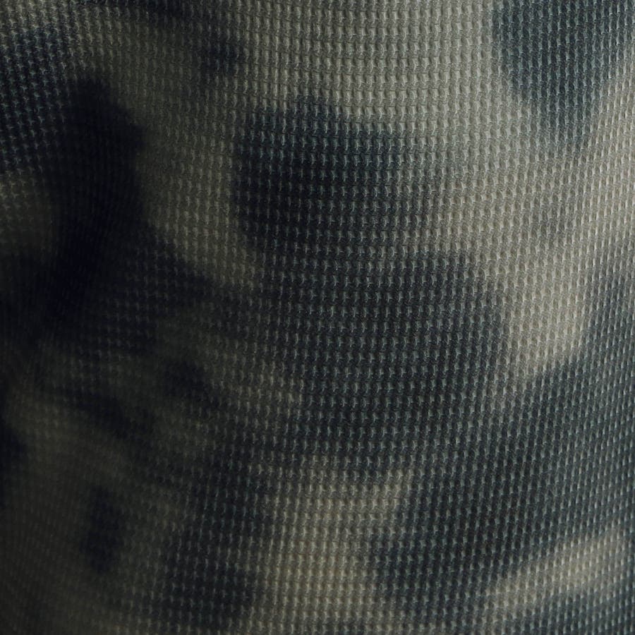 オリジナルのムラプリントを施したポリエステルのマイクロワッフル素材を使用。細かな凹凸が肌に当たる面を減らしてくれるので、さらっとした肌触り。軽量でハリがありながら、よく伸びるストレッチ性が特長。洗濯してもシワになりづらい取り扱いのしやすさも魅力の素材です。