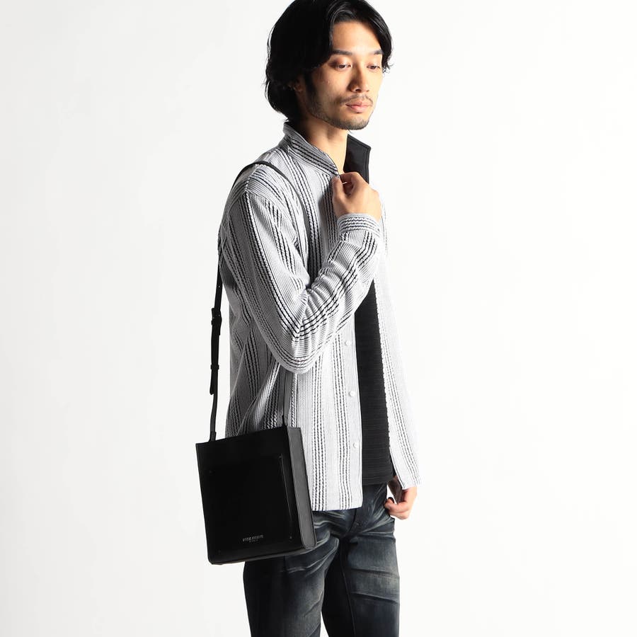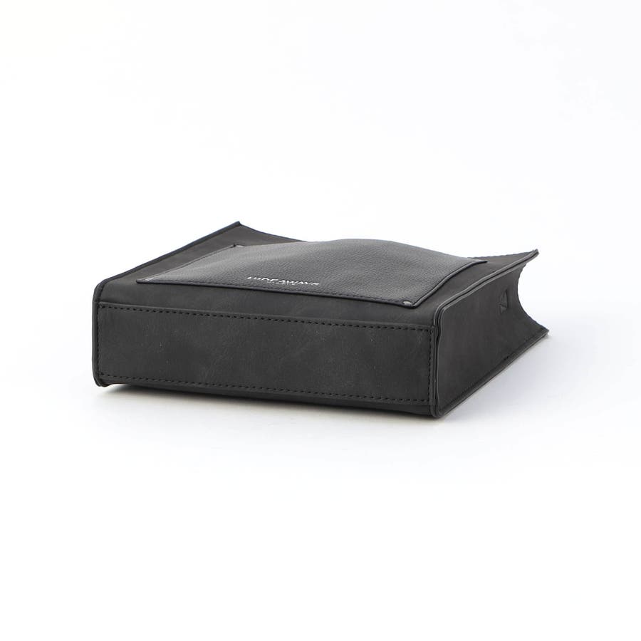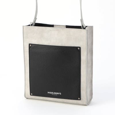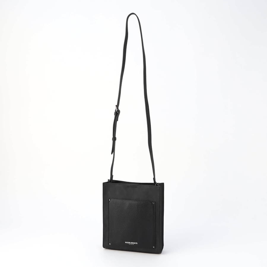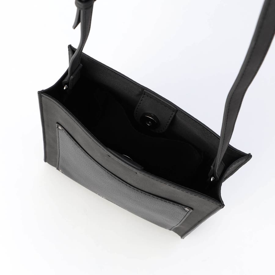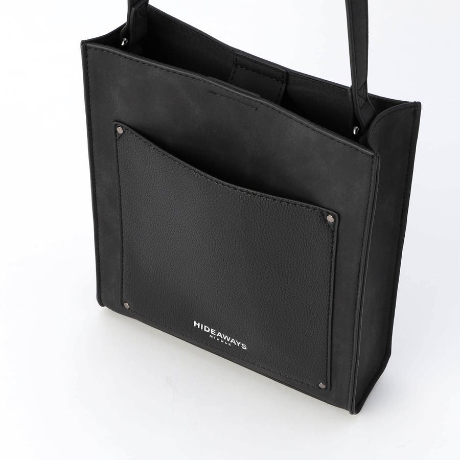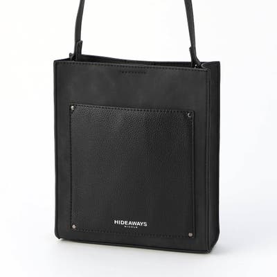 モードな雰囲気を演出するスクエア型ショルダーバッグです。フロントポケットの素材を大胆に切り替え、見た目にもインパクトがあります。箔押しのブランドロゴがアクセントになっています。