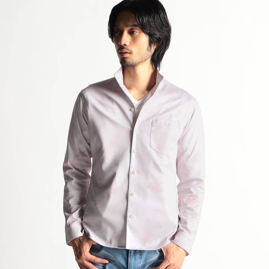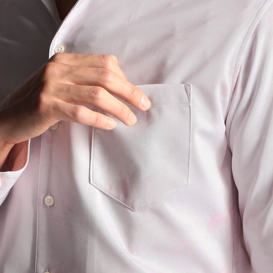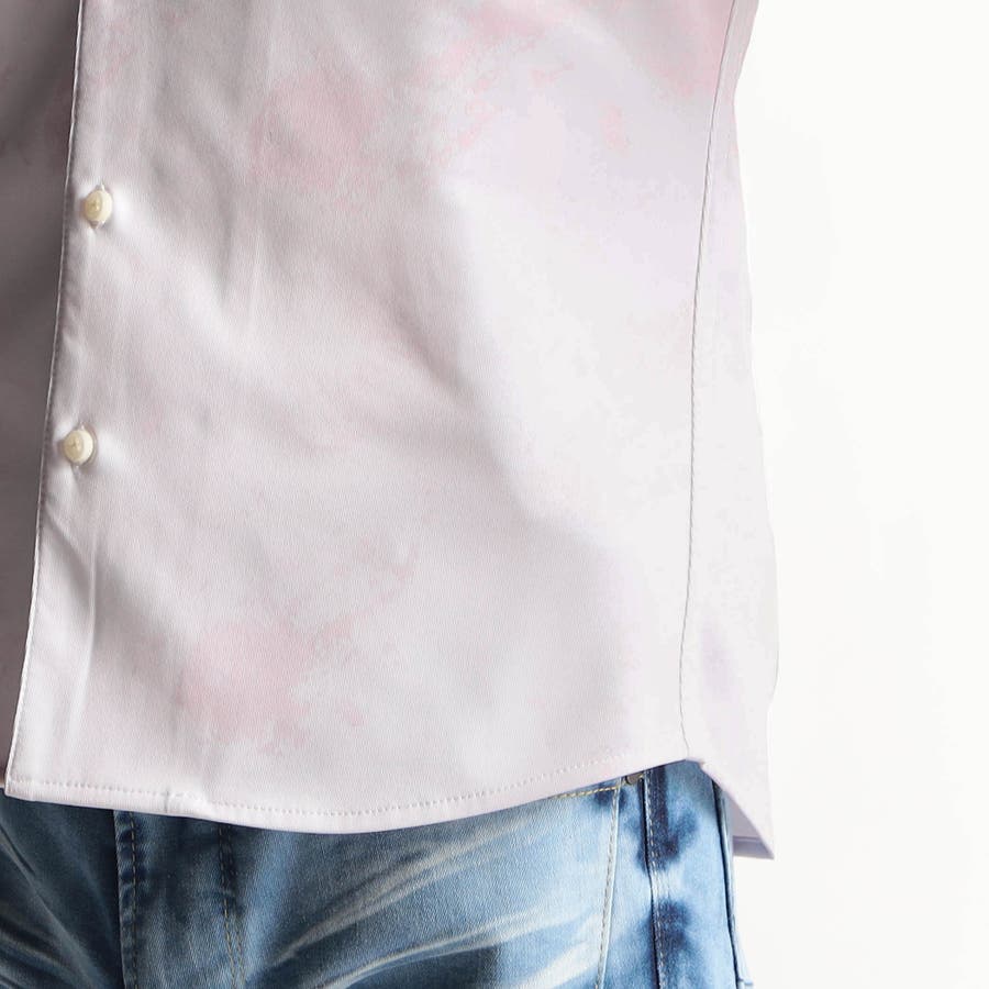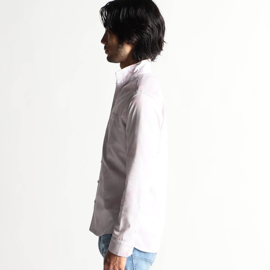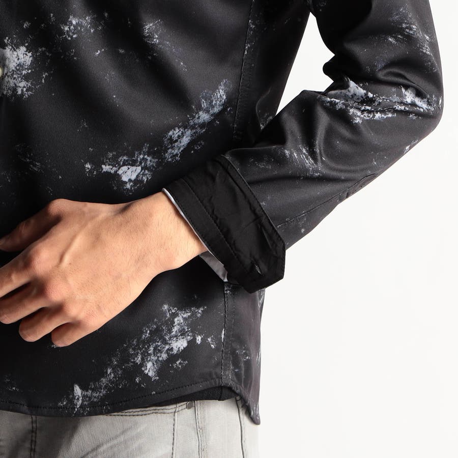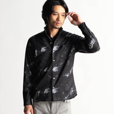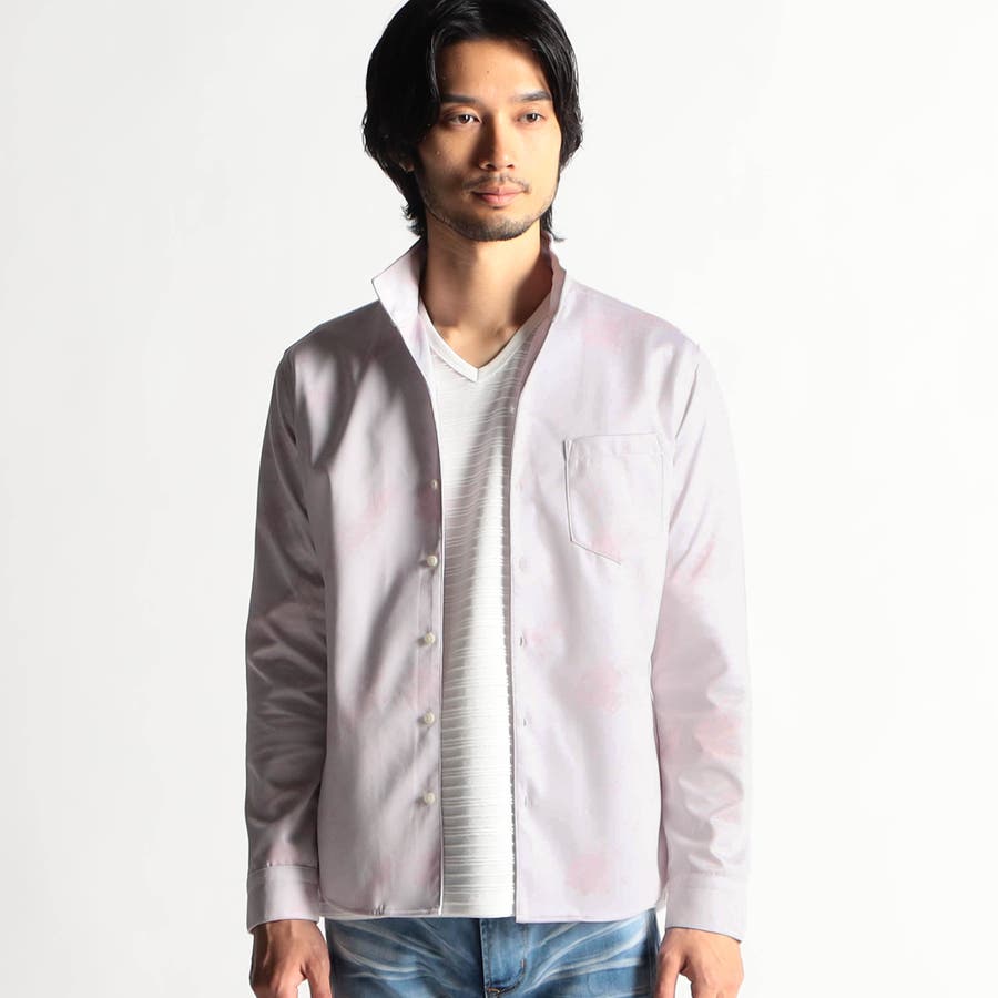 オリジナルのムラ柄プリントを施した薄手のポリエステルポンチ素材を使用。ツルっとした肌触りと合繊ならではの光沢、仕立て映えするハリ感とジャージー素材ならではの高いストレッチ性が特徴。
