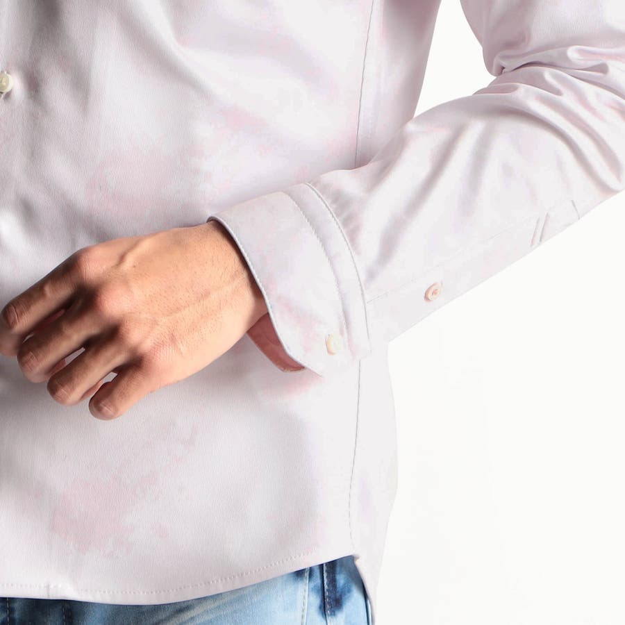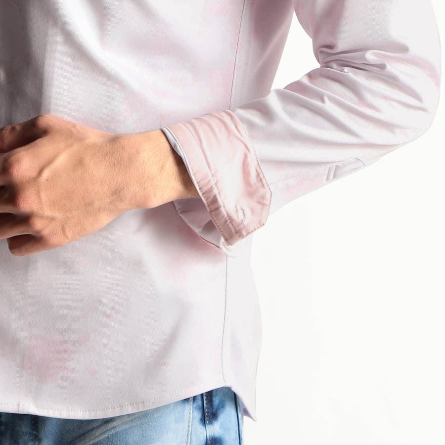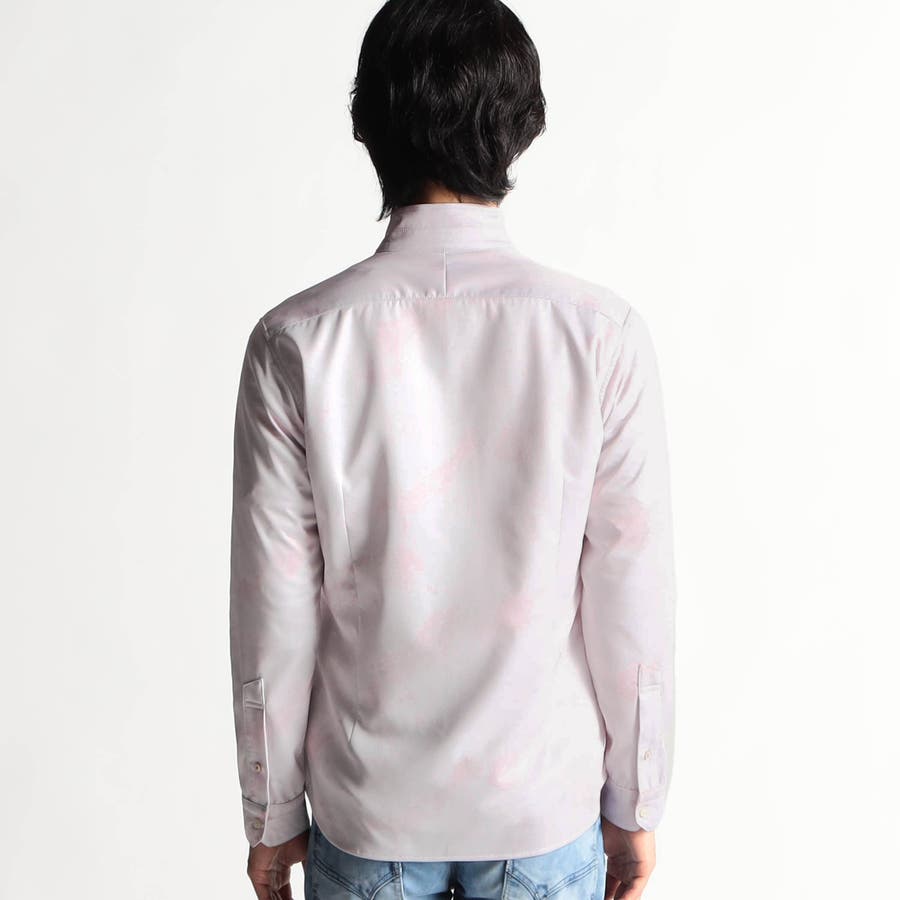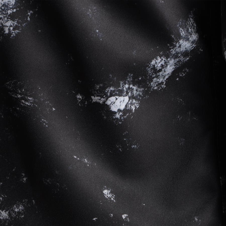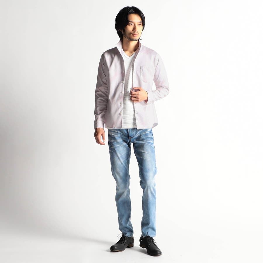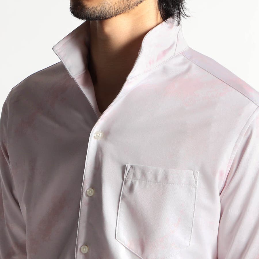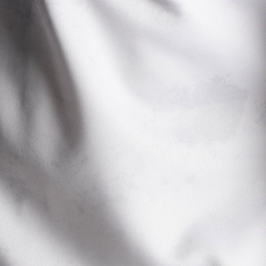 オリジナルのムラ柄プリントを施した薄手のポリエステルポンチ素材を使用。ツルっとした肌触りと合繊ならではの光沢、仕立て映えするハリ感とジャージー素材ならではの高いストレッチ性が特徴。