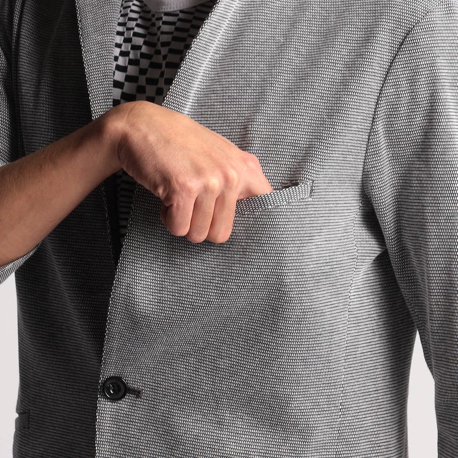 トップ調の綿糸とポリエステルを交織する事で杢調の色目と強度を出し、網目状に見える地柄ジャカード織りの国産ジャージ素材です。鹿の子組織のシャリ感と透け感のある素材感が清涼感を高めます。カットソー素材になりますのでマルチストレッチで着やすいです。