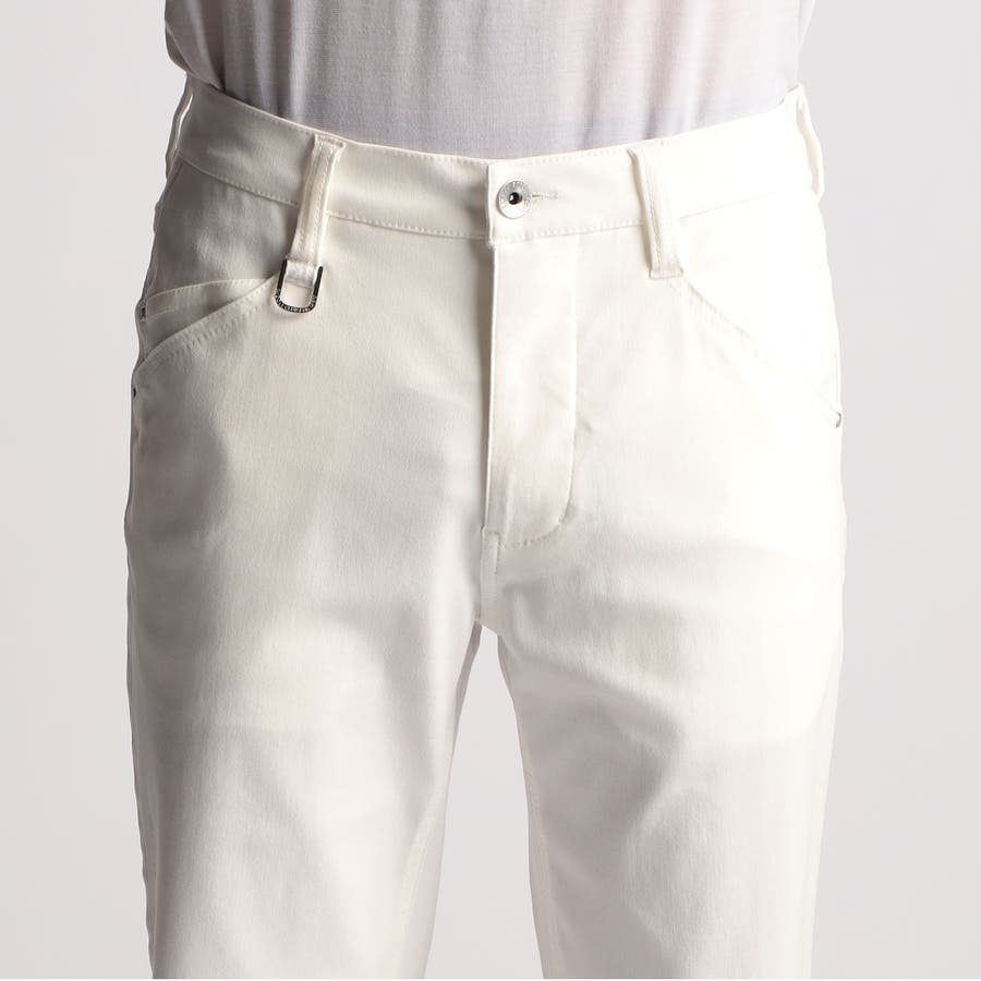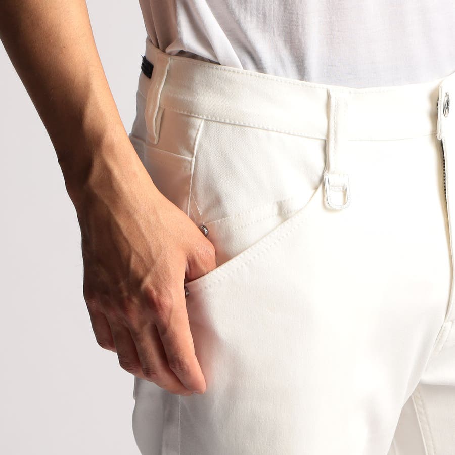 5ポケットデザインをベースにした、綺麗めデザインのシンプルなバミューダパンツ(膝丈)です。ピタッとした短パンは人を選びますので、全体のサイズ感にゆとりを出し、裾口も少し広くしてテーパードしたシルットの程好いサイズ感に設定しています。素材にあわせてウエストベルトも少し伸びる様に縫製、裏側の別布にストレッチ裏地を使用していますので穿き着心地も抜群です。オリジナルのボタンやDカン、腰裏の刺繍や革ネームなど細かい部分までこだわっています。09ホワイトのみ、右前身の裾辺りにプリントを入れています。49ブラックのみ、尻から内股部分に補強布を当てています。