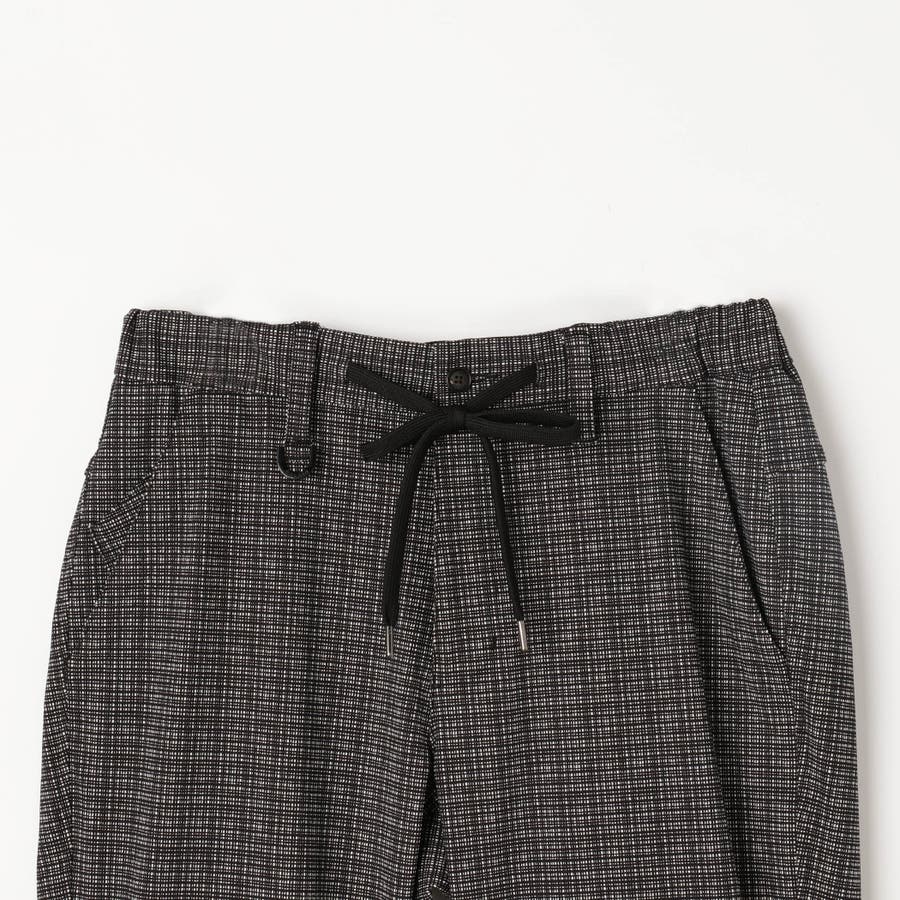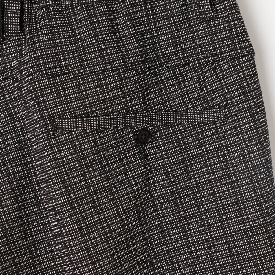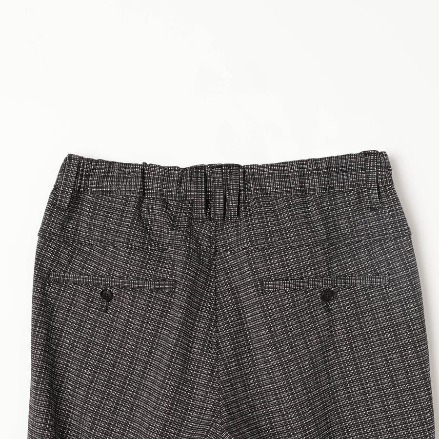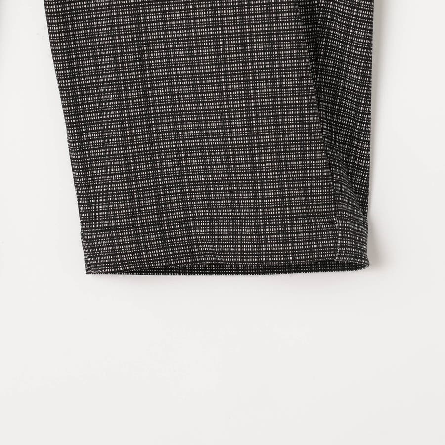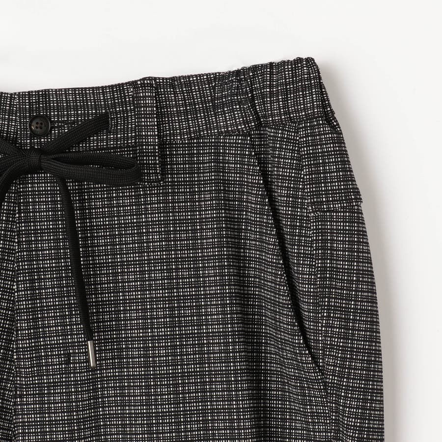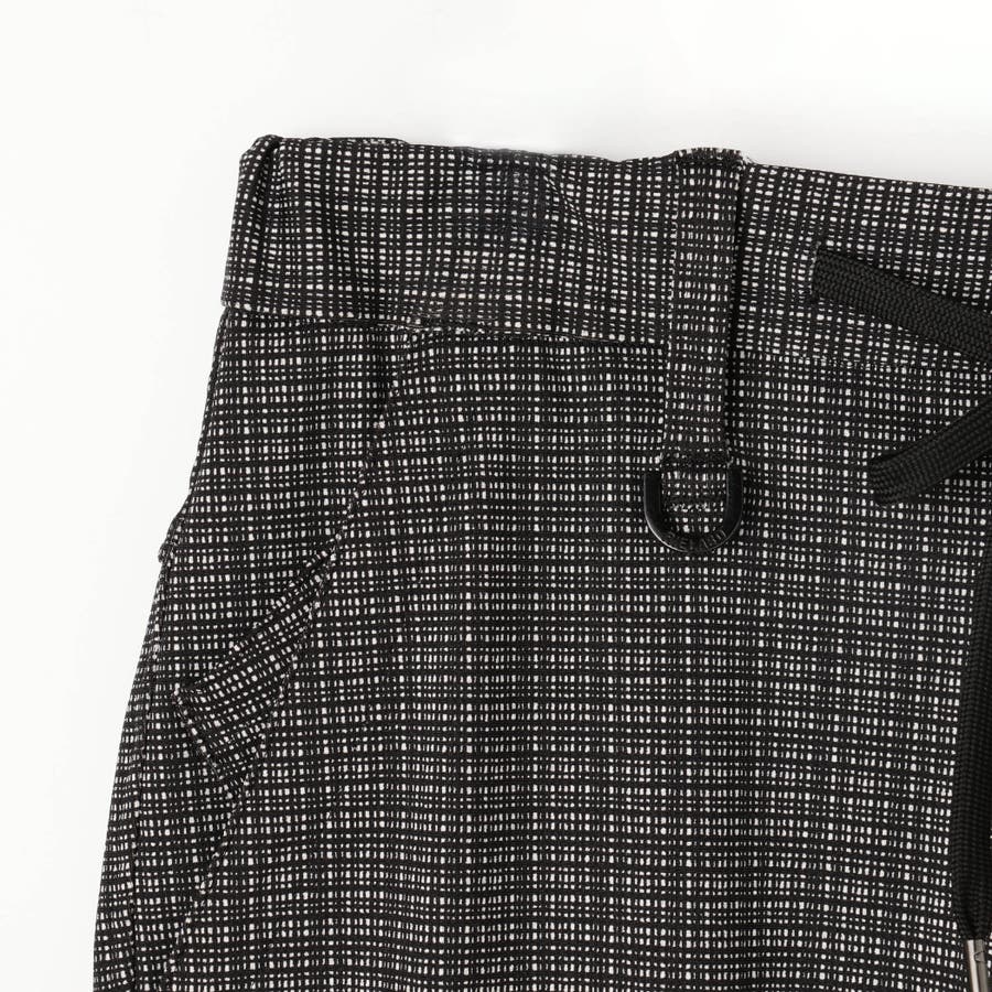 ウエストベルトには平ゴムとスピンドルを通していますのでサイズ調整しやすく、お尻廻りから渡りにかけてゆとりのあるサイズ感にしています。その渡りから裾口にかけてテーパードした綺麗なシルエットです。膝丈くらいの股下設定です。