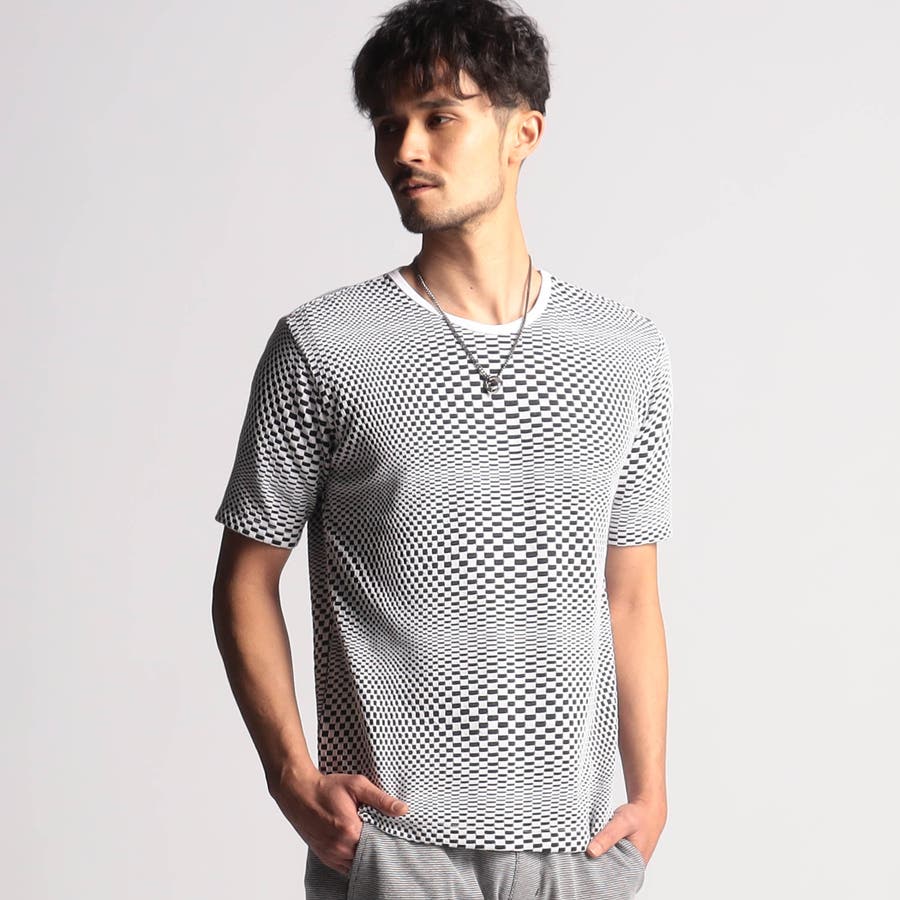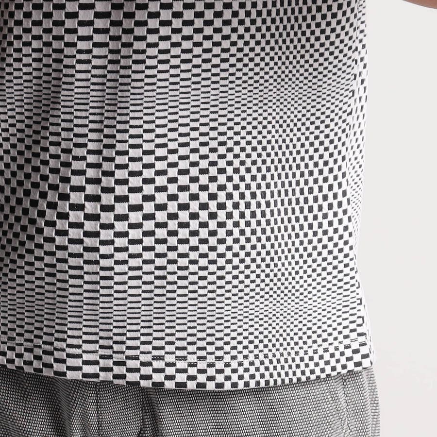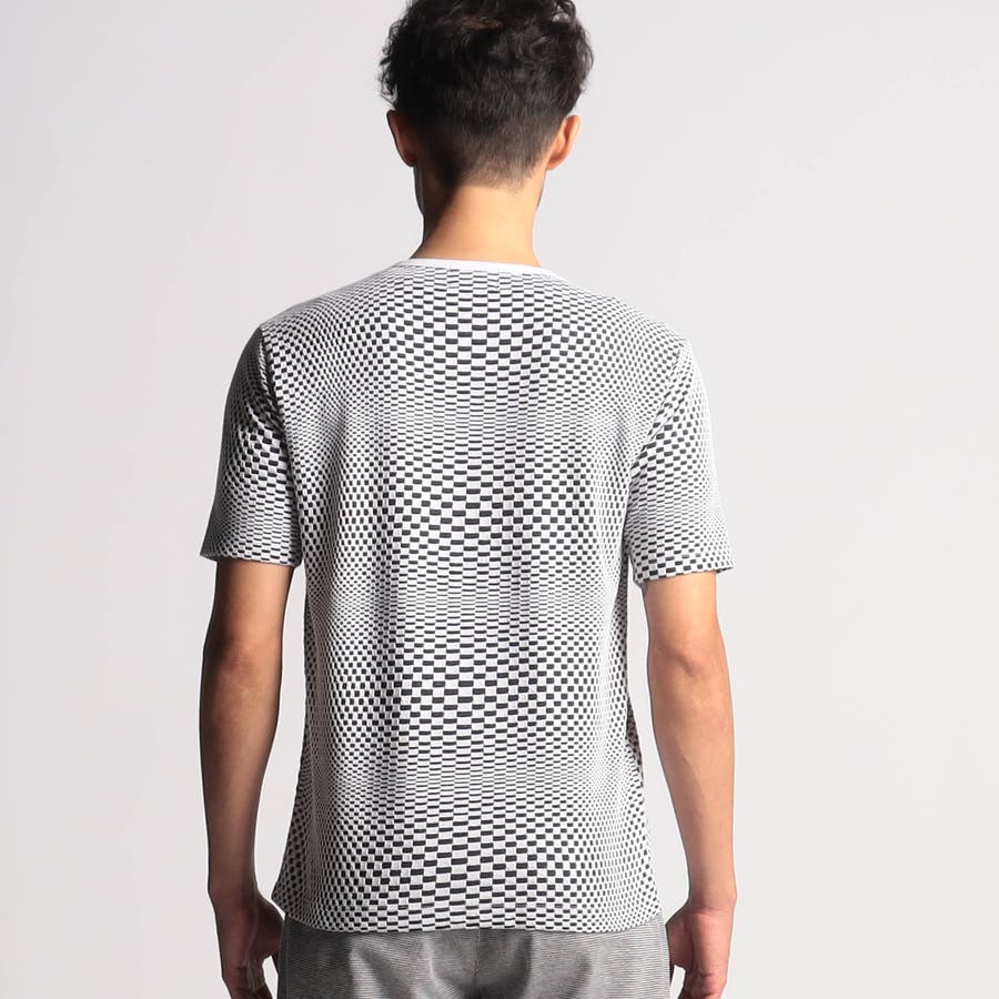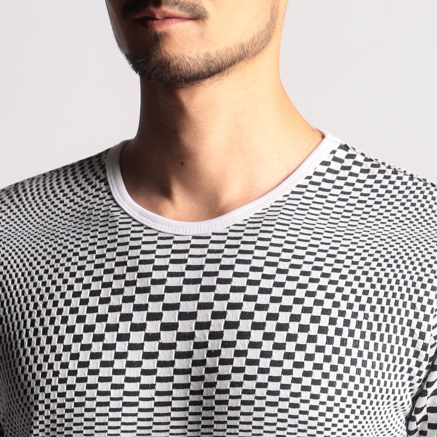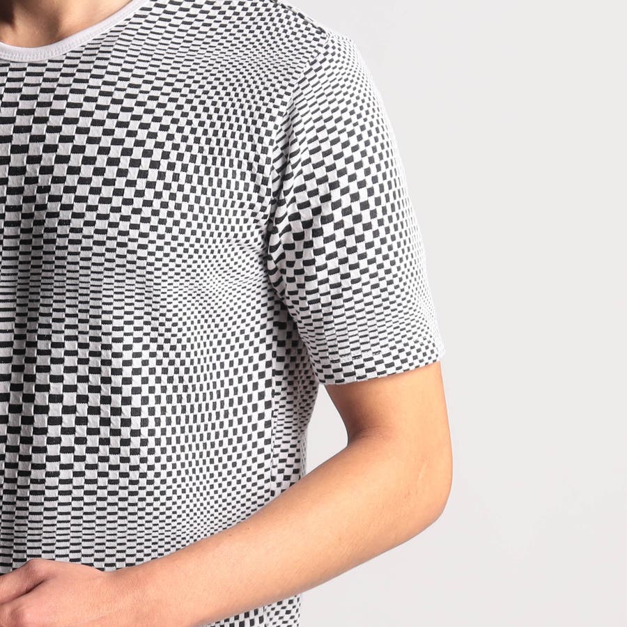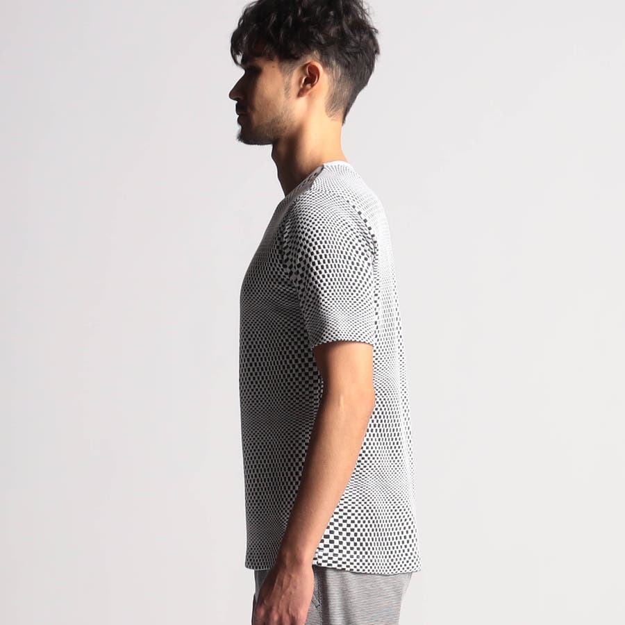 インパクトの強い幾何学柄を無地とモノトーンで表現する事で大人綺麗目なモードテイストに仕上げています。デザインはシンプルなクルーネックタイプ。ジャストサイズでインナー用として、オーバーサイズで重ね着用としても楽しめるアイテムです。