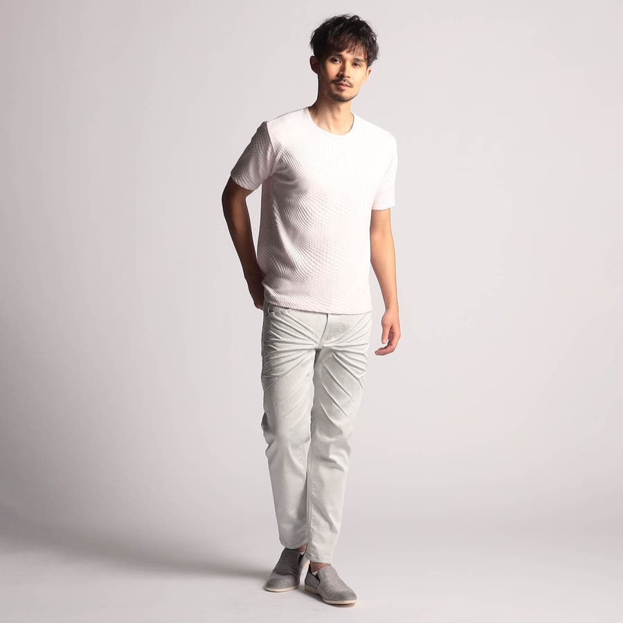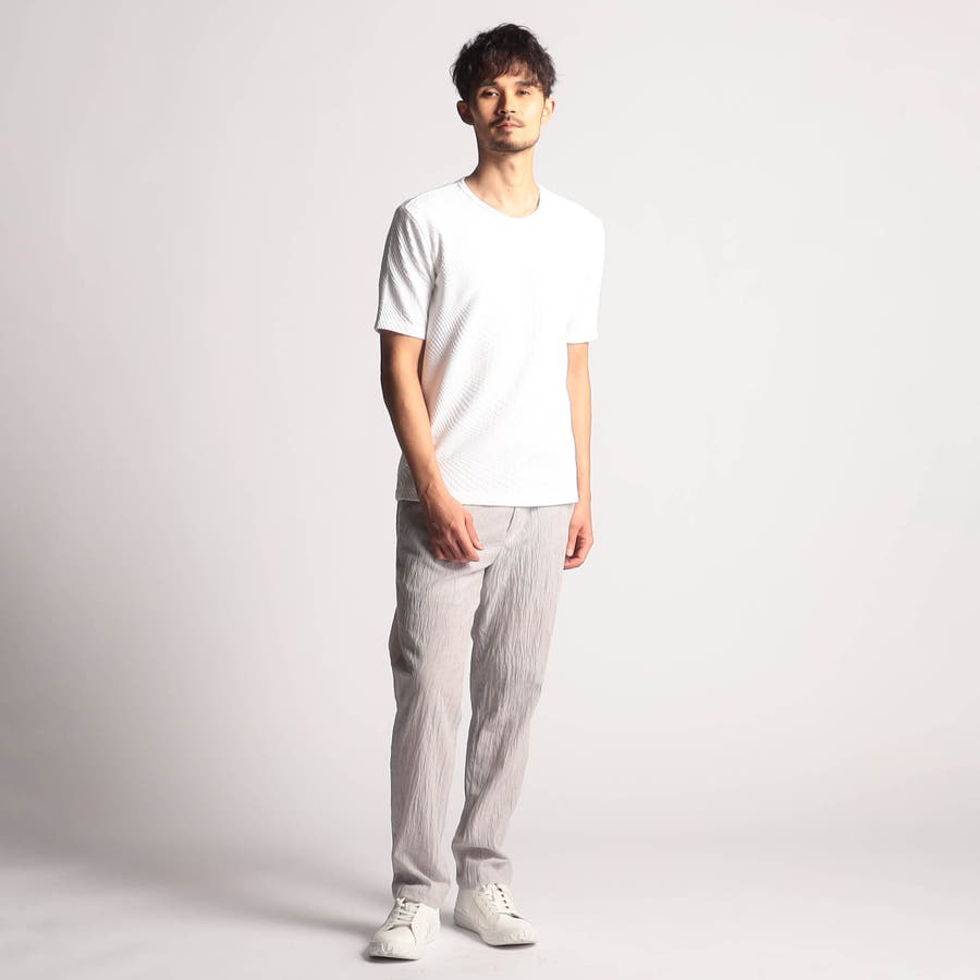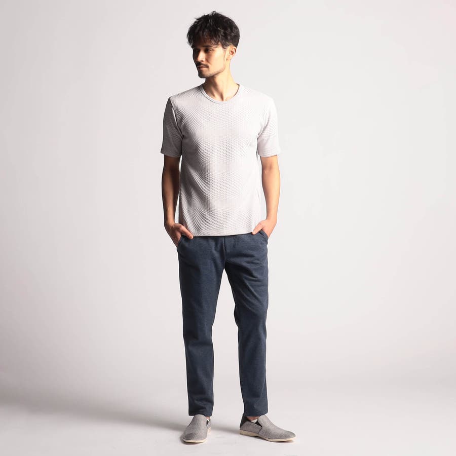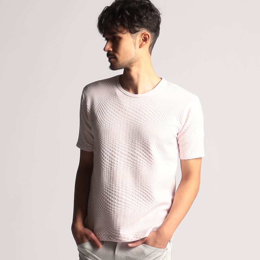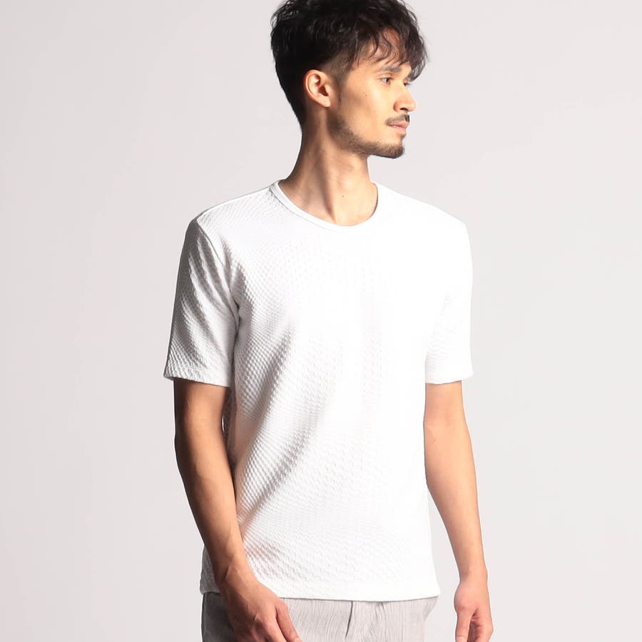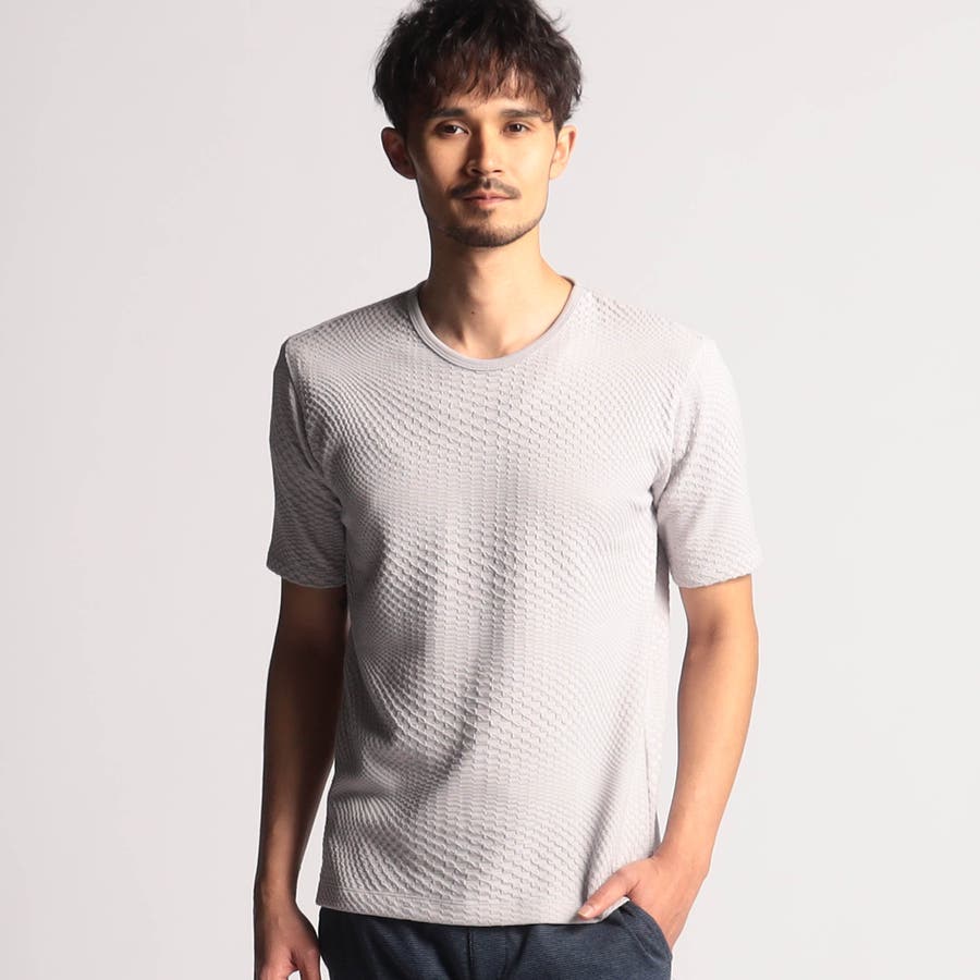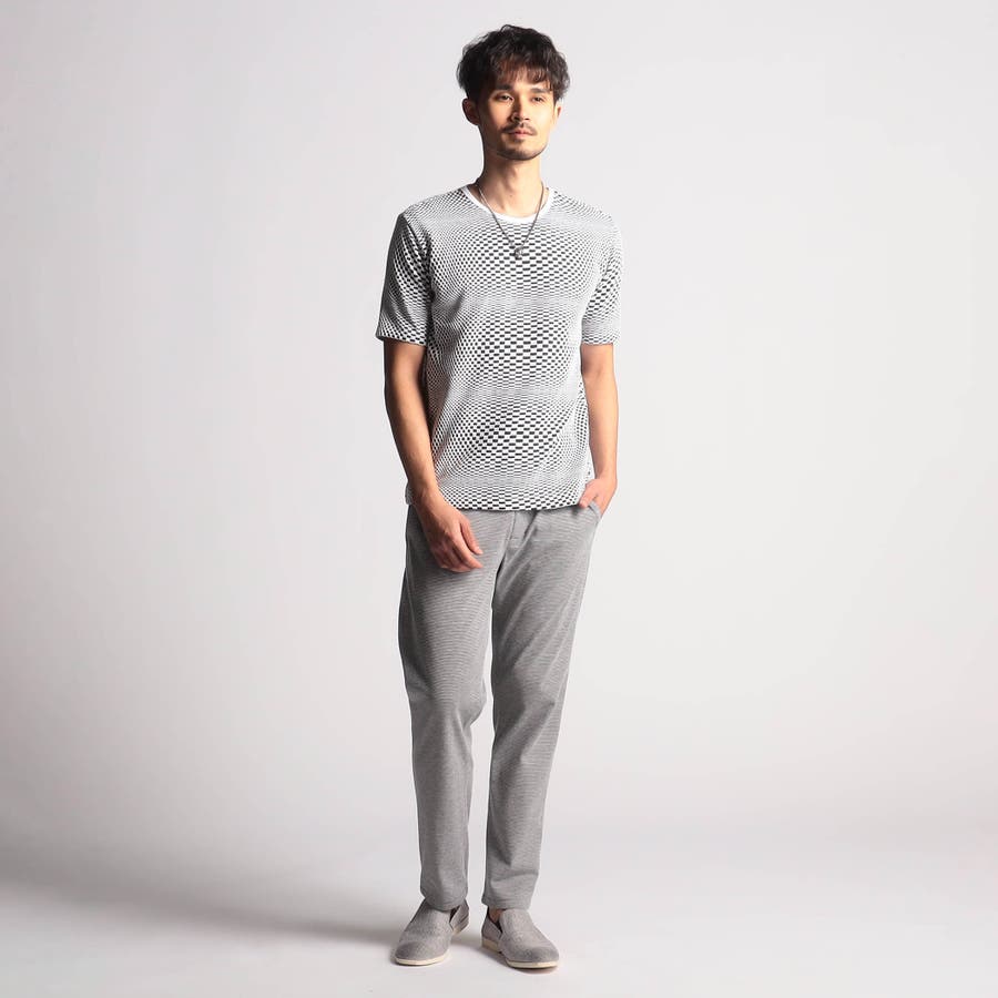 インパクトの強い幾何学柄を無地とモノトーンで表現する事で大人綺麗目なモードテイストに仕上げています。デザインはシンプルなクルーネックタイプ。ジャストサイズでインナー用として、オーバーサイズで重ね着用としても楽しめるアイテムです。