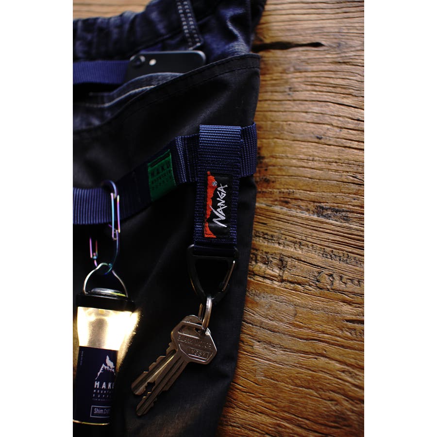 【NANGA】ロゴ入りのテープカラビナもついていますので、デイジーチェーンにはアウトドアギアやハンドタオルを、カラビナループにはカギやカップなど、使用方法はアイデア次第で無限大です。
