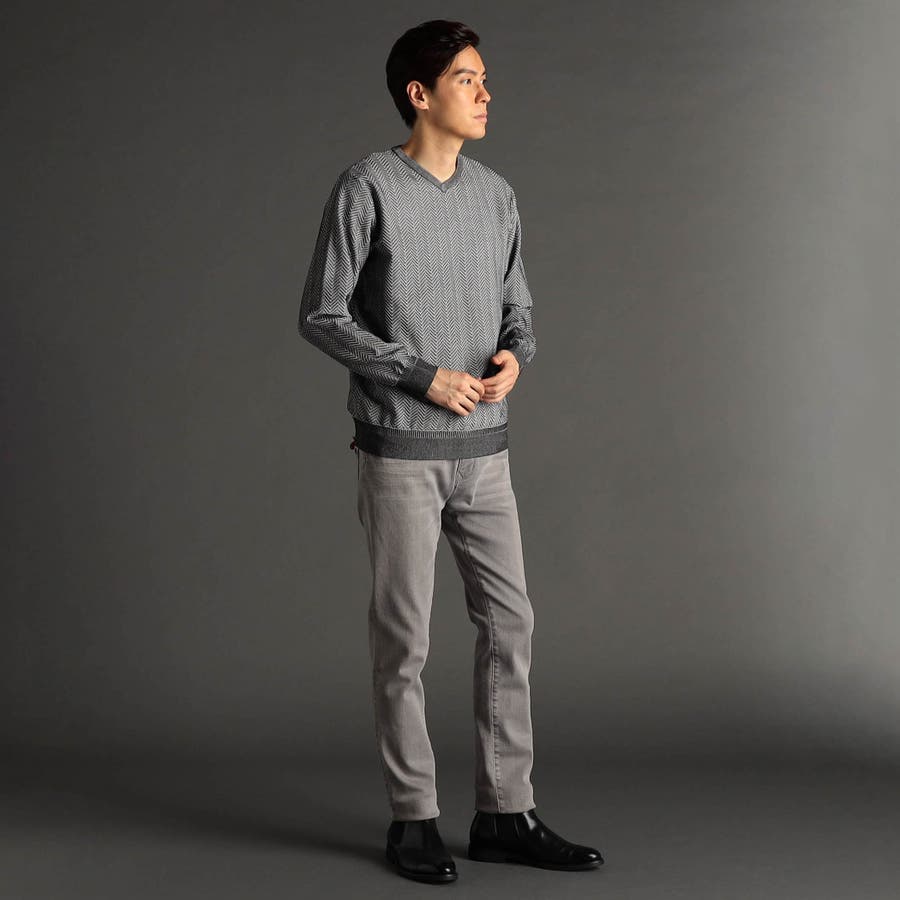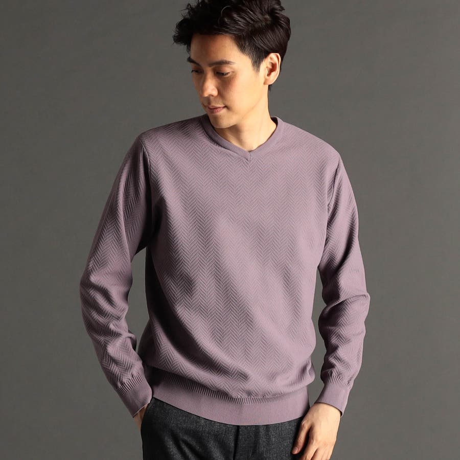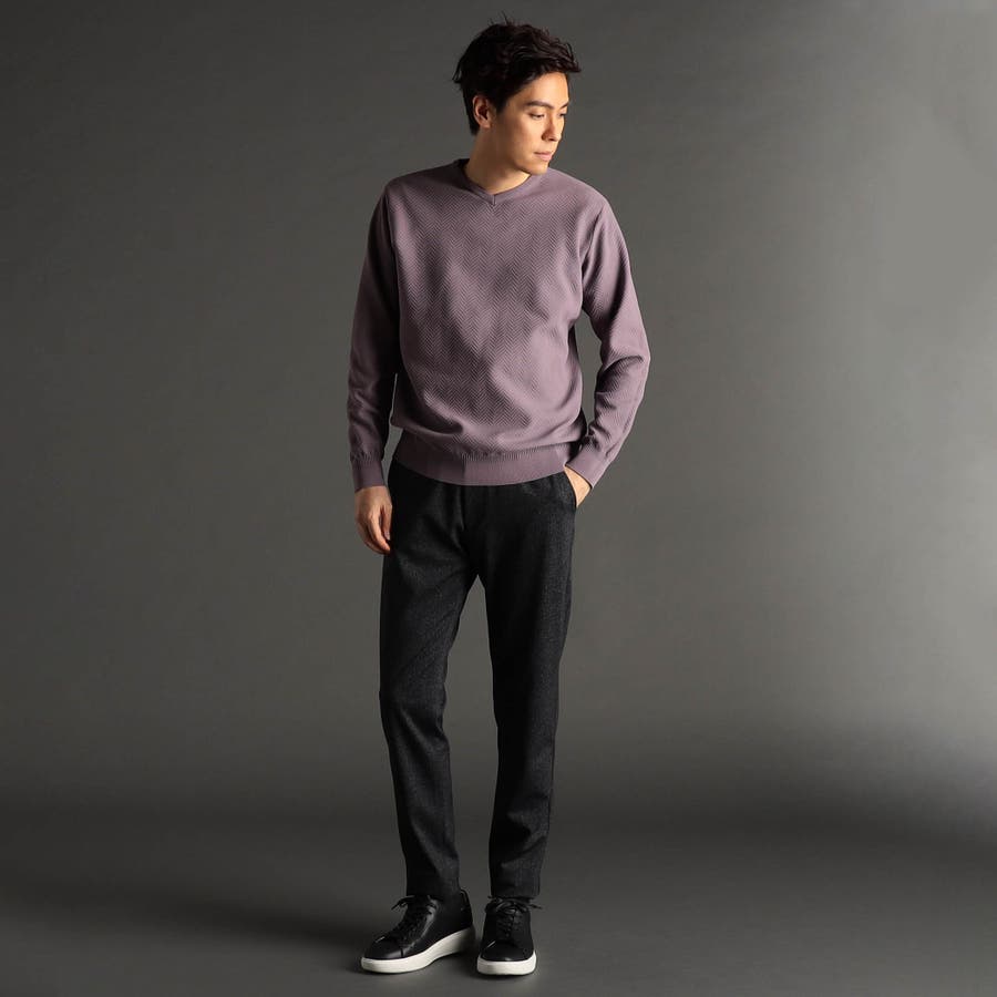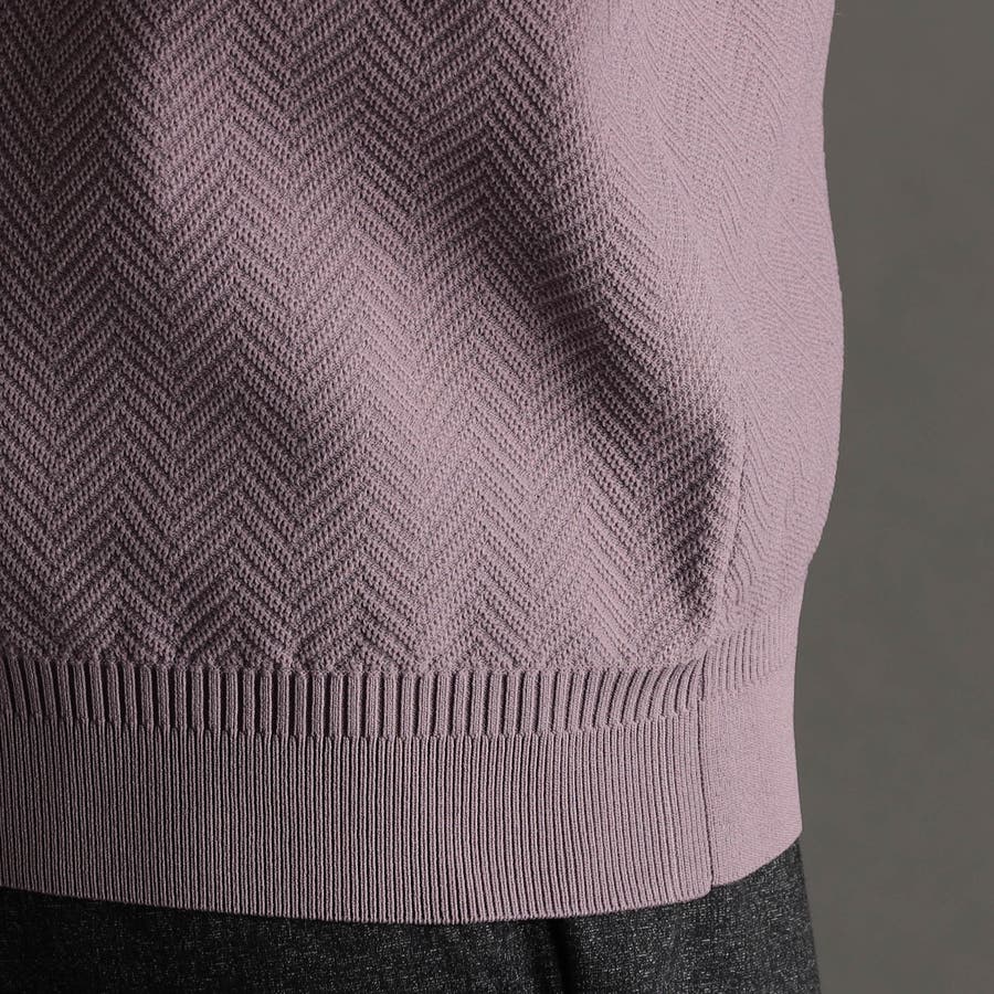 ストレッチ性のある糸をハイゲージで編み、凹凸変化のあるヘリンボン柄を際立たせています。主張しすぎない柄感と、しっかりとした生地感が特徴です。