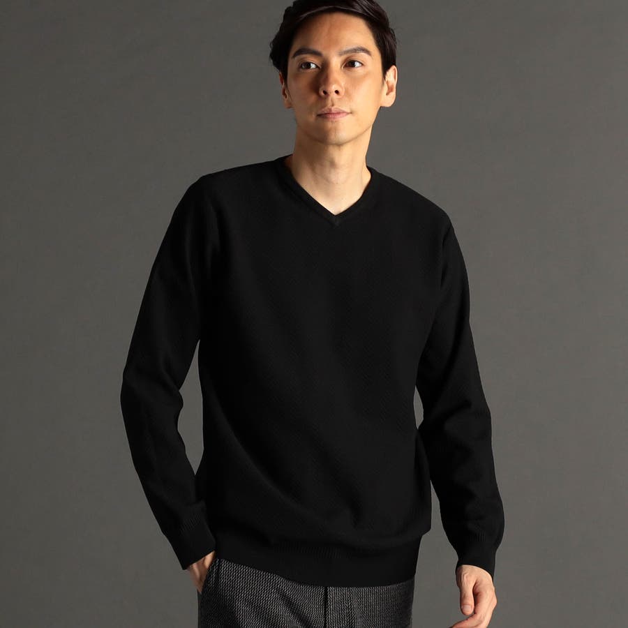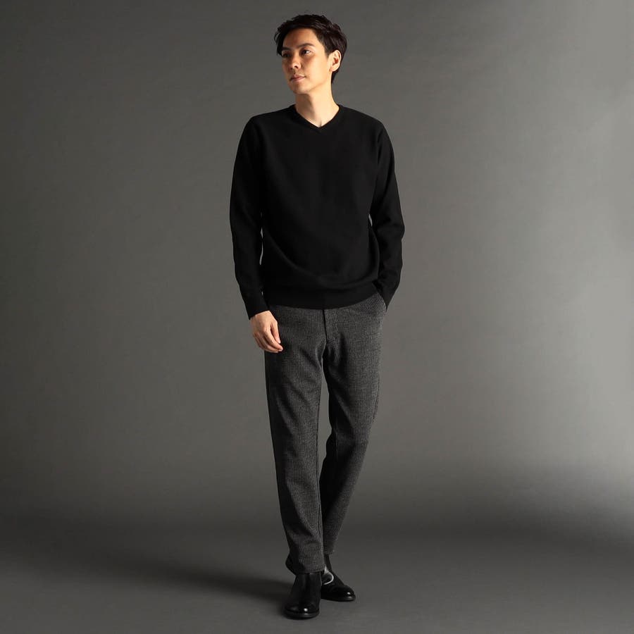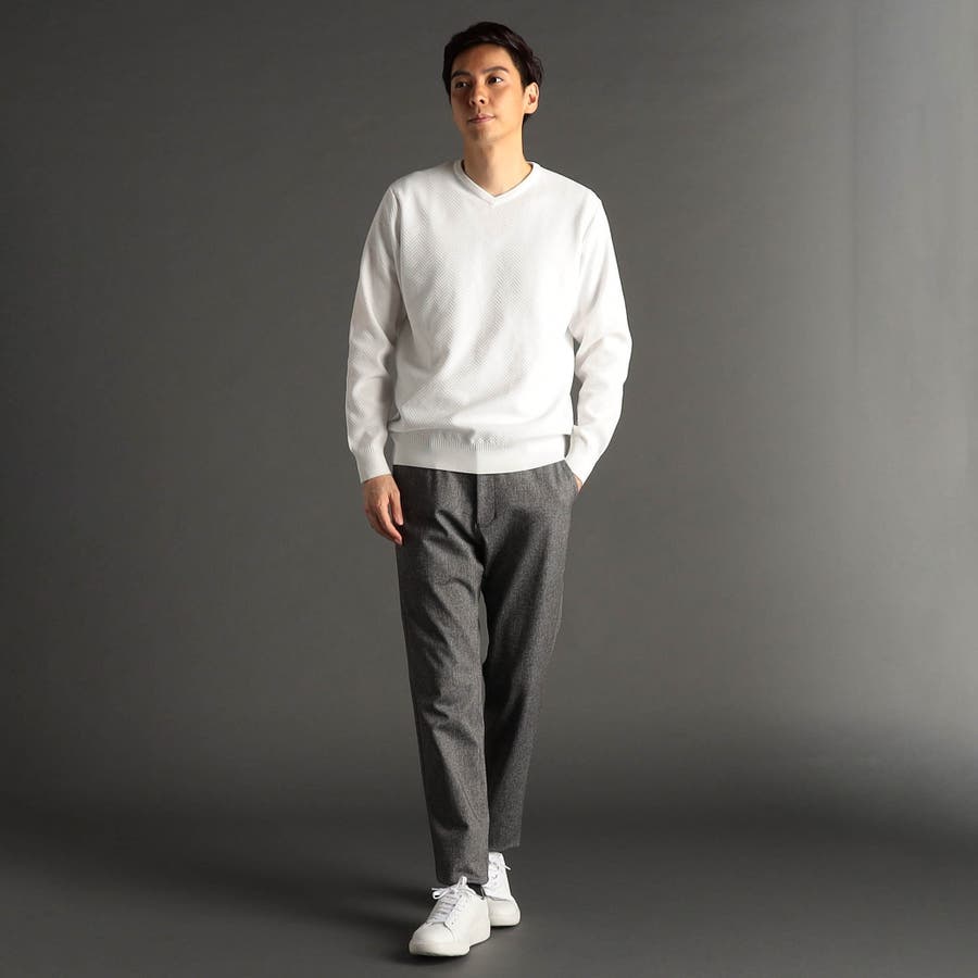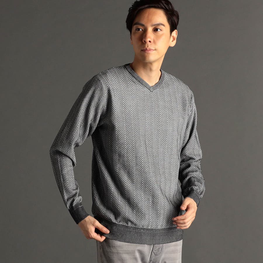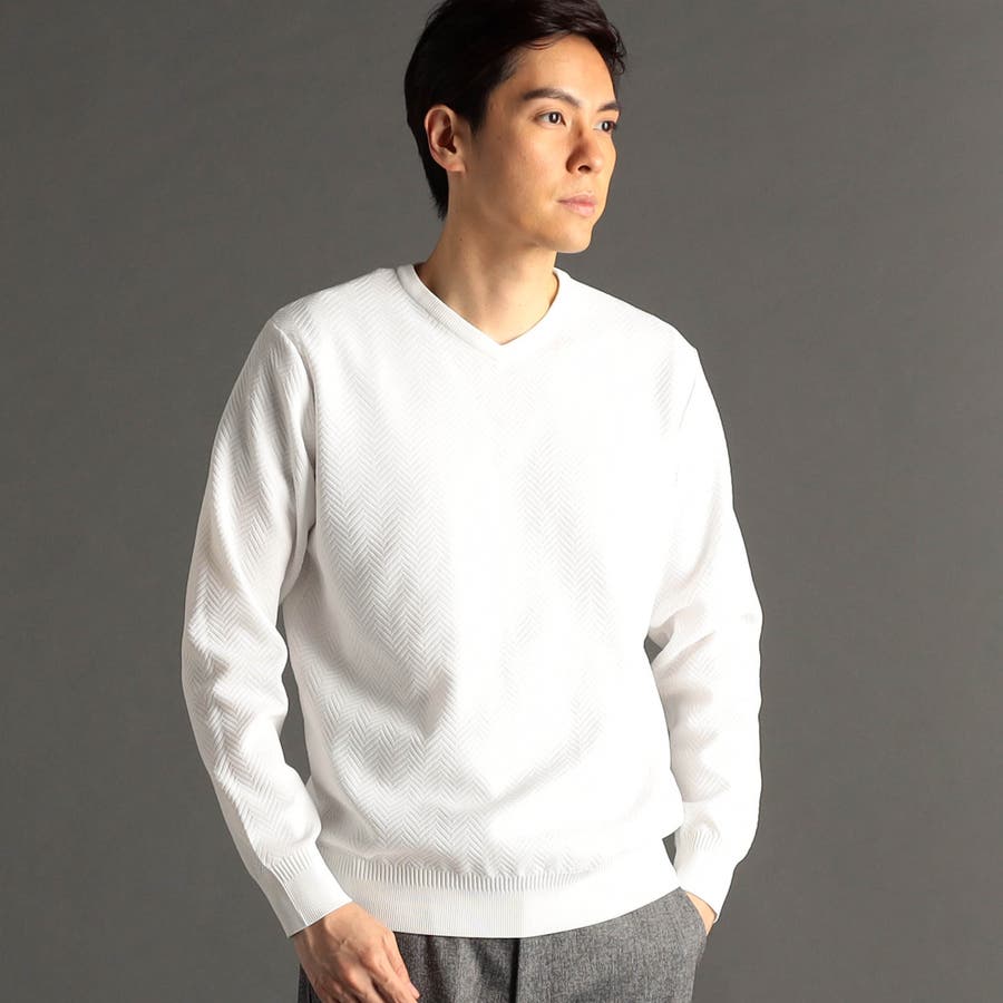 ストレッチ性のある糸をハイゲージで編み、凹凸変化のあるヘリンボン柄を際立たせています。主張しすぎない柄感と、しっかりとした生地感が特徴です。