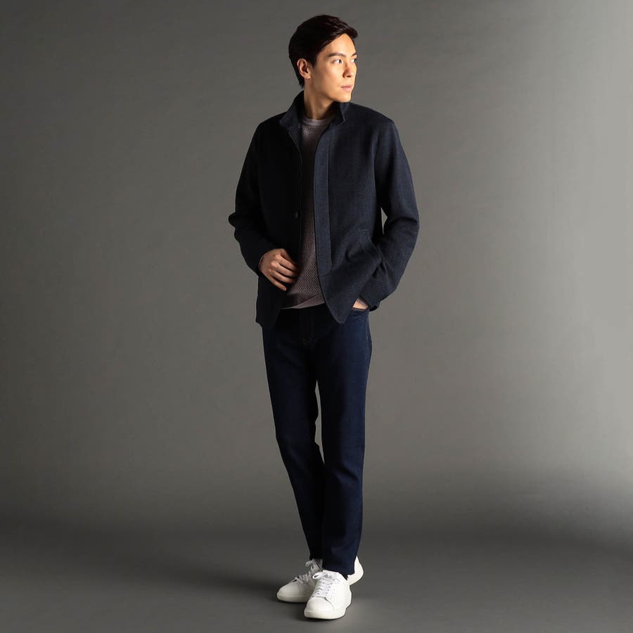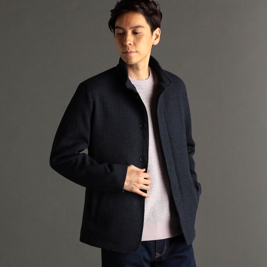 大人顔したシンプルなスタンドカラーにワイヤーを入れて綺麗な衿立ちとし、フロントは、ボタンとジップの比翼仕立ての本格ブルゾンライクに仕上げたアウターです。