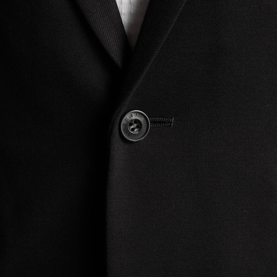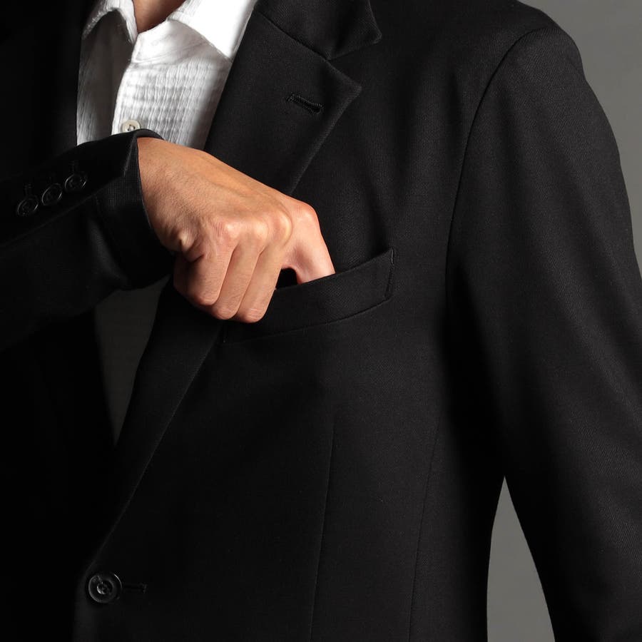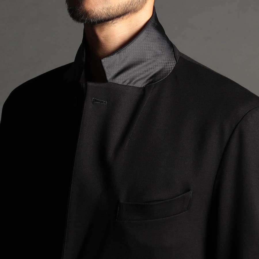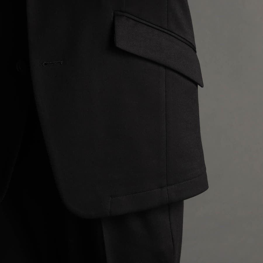 2つ釦のノッチドラペルジャケット。少し太めのラペルにスラントポケットで見た目に違いを出し、極力ステッチも入れずシンプルに作りました。左胸はフェイクチーフ仕様、袖口は本切羽、大身返しの半裏仕様で千鳥柄ジャカード裏地を採用して高級感ある見え方に作っています。一番下の釦は止める設定になっていません。