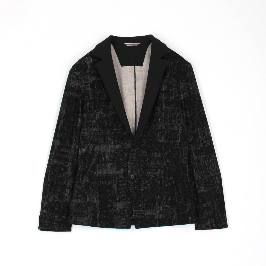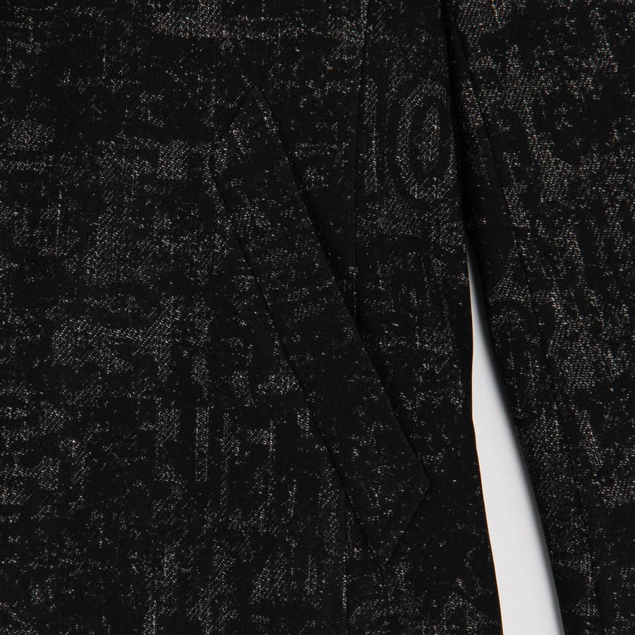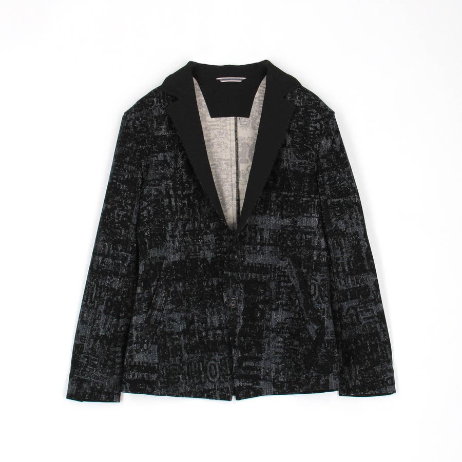 キックバックの良い、ナイロンジャージのハイテンションストレッチ素材をベースに、掠れたデニム調の大胆なグラフィカル柄プリントを施した国産素材です。少し厚みはありますが、ひんやりした心地良い肌触りが特徴。ベースのプリッとした横張り感のあるしっかりとした肉感はシルエットを綺麗に作り、マルチで伸びるキックバックが効いたストレッチ性はとても着心地が良いです。