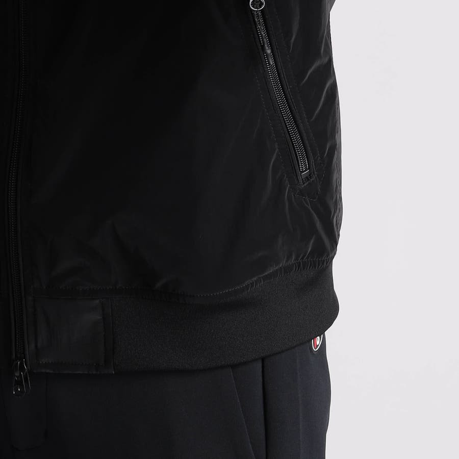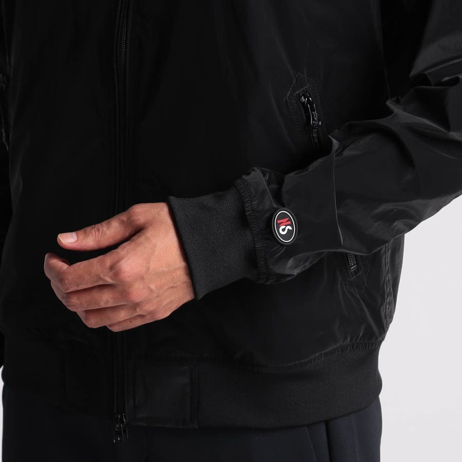 リバーシブル仕様のMA-1デザインブルゾン。フライトジャケット独特の前振り袖と身頃のバランスを取り入れ、表面は無地のまっ黒、裏面はカモフラプリントの両面で着用出来ます。ファスナーはコイルファスナー、釦はプラスチック製のドット釦を採用して軽量化を図り、ポリエステルの光沢感のある黒リブを使ってモード感のある雰囲気に仕上げています。表側の左袖にワッペン、裏側の脇ポケットにブランドネームを付けています。