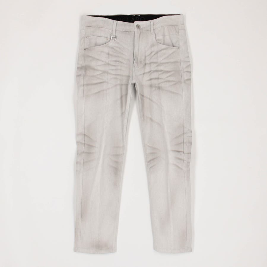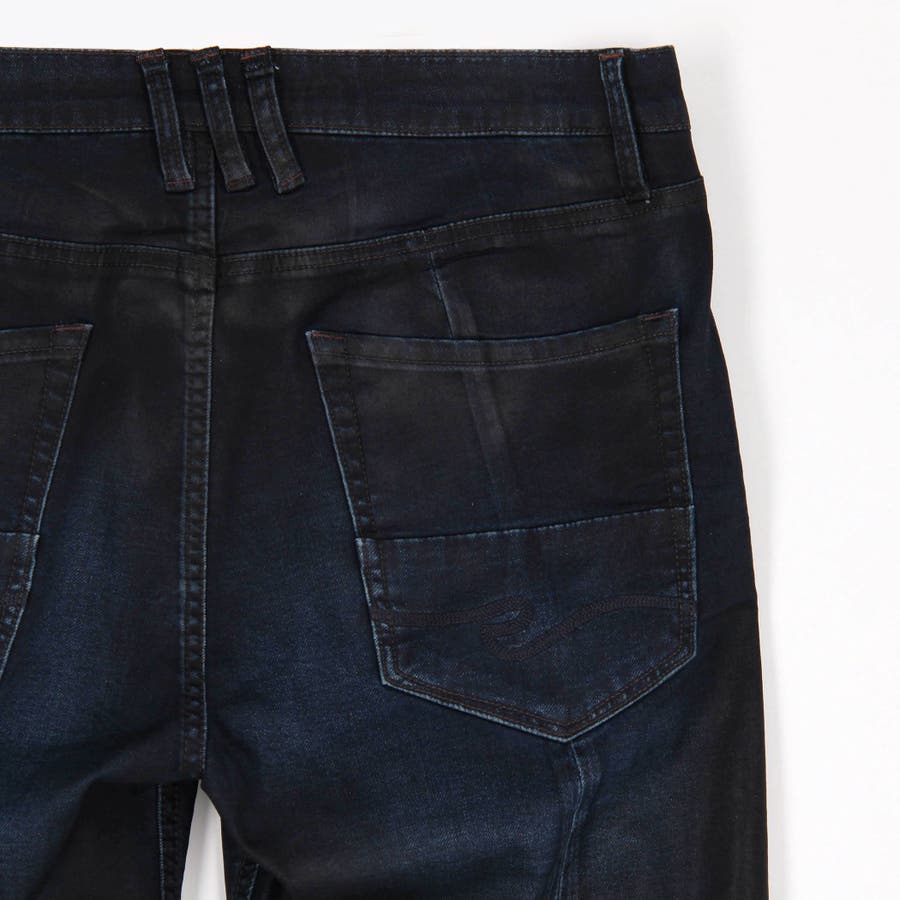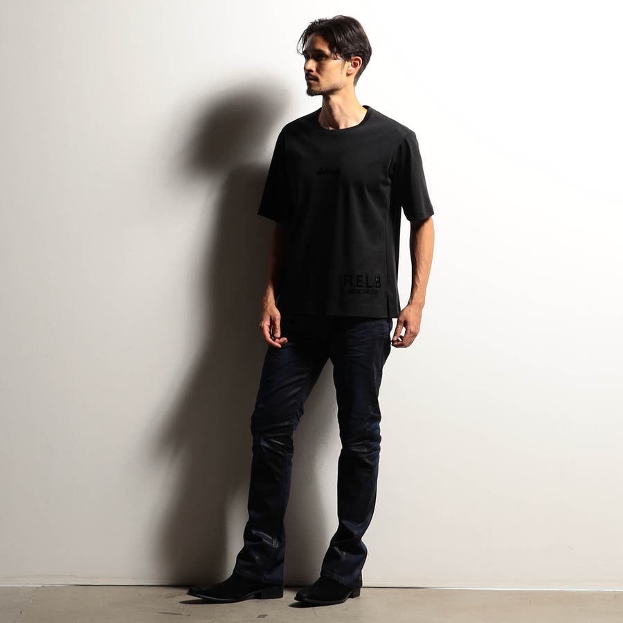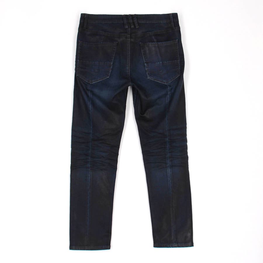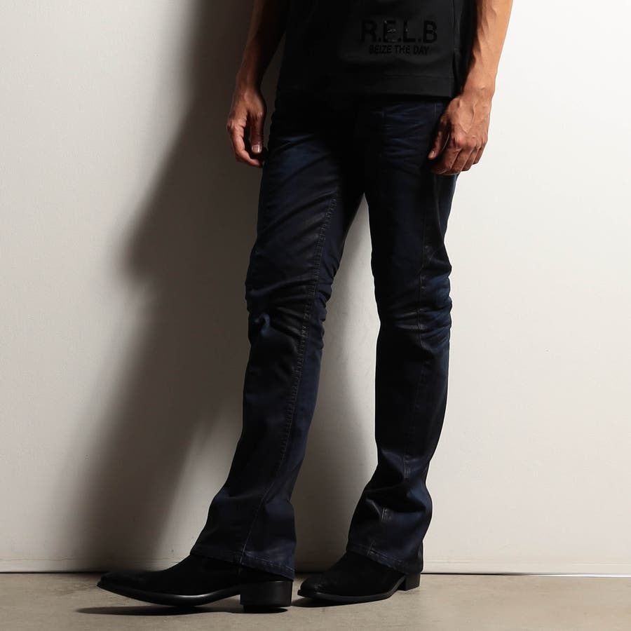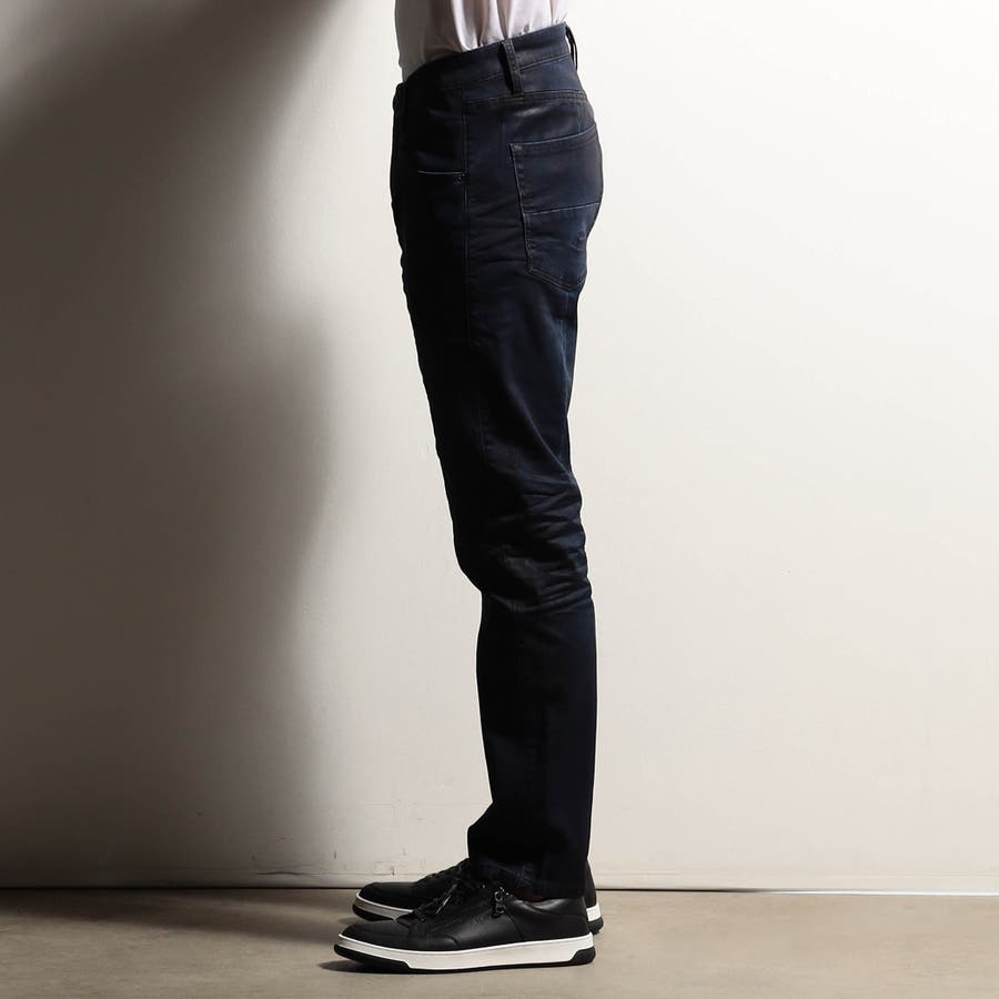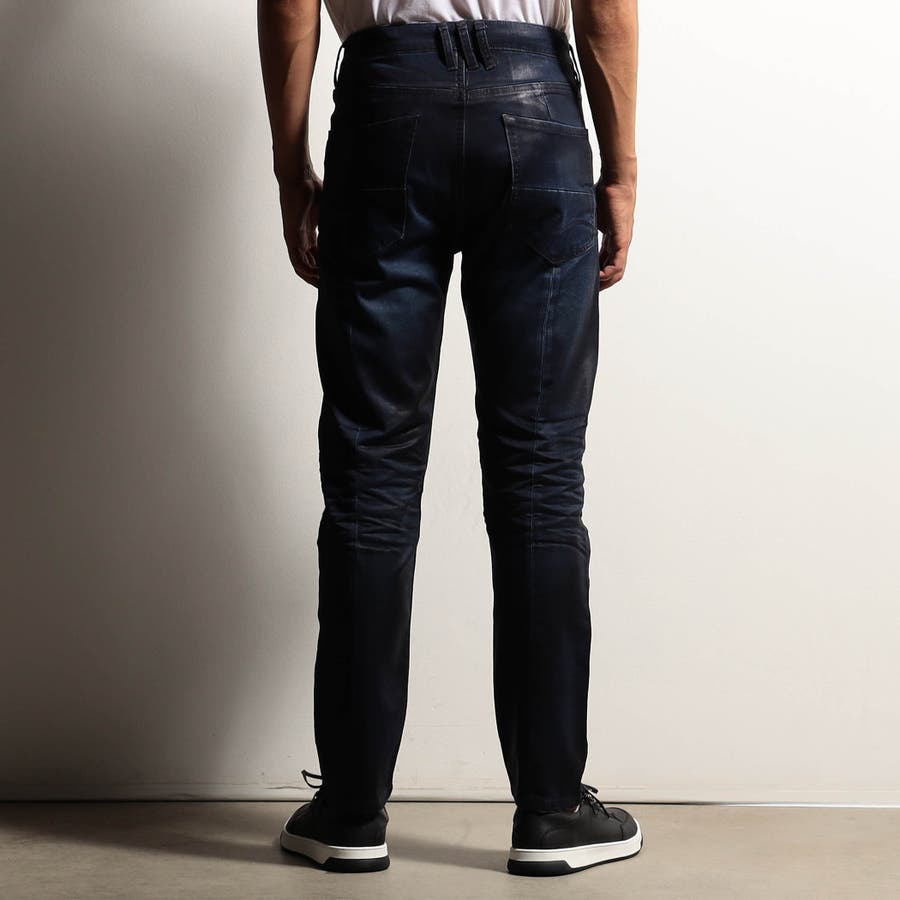 最終の製品加工を岡山のデニム専門の加工所(Wellsウェルズ)に依頼。中国でベースのユーズド加工を施し、全体のサイズ感を縮率調整してから国内にて最終加工を施しています。顔料を混ぜた樹脂コーティング剤を部分的吹き付け、所々アイロンでしっかり抑える事で縫い代の厚みがある部分や平たい部分に光沢を出して革パンの様な深い色味に仕上げます。最後に立体的でリアルな3Dシワ加工を施しています。