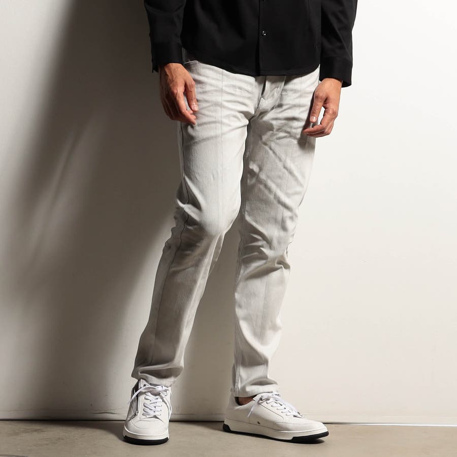 若干深めの股上、腰周りは少しタイトめに調整し、裾口にかけて程好く細くなったスリムストレートシルエット。細身の綺麗なラインです。股下は9分丈設定にしています。91その他2は、股下フルレングスで裾口をシューカットシルエットにしたシルエット違いの展開です。