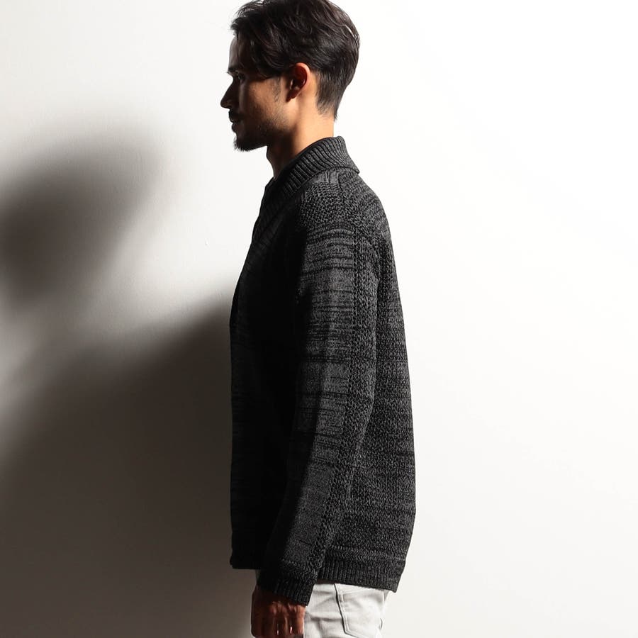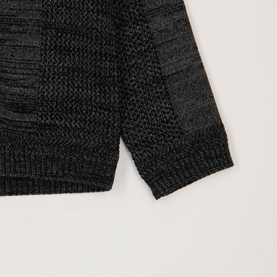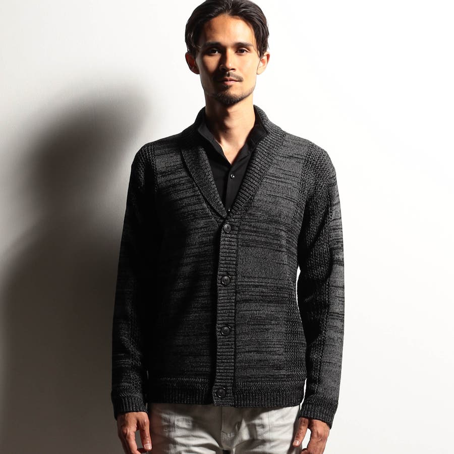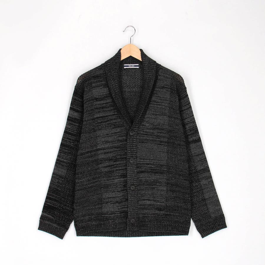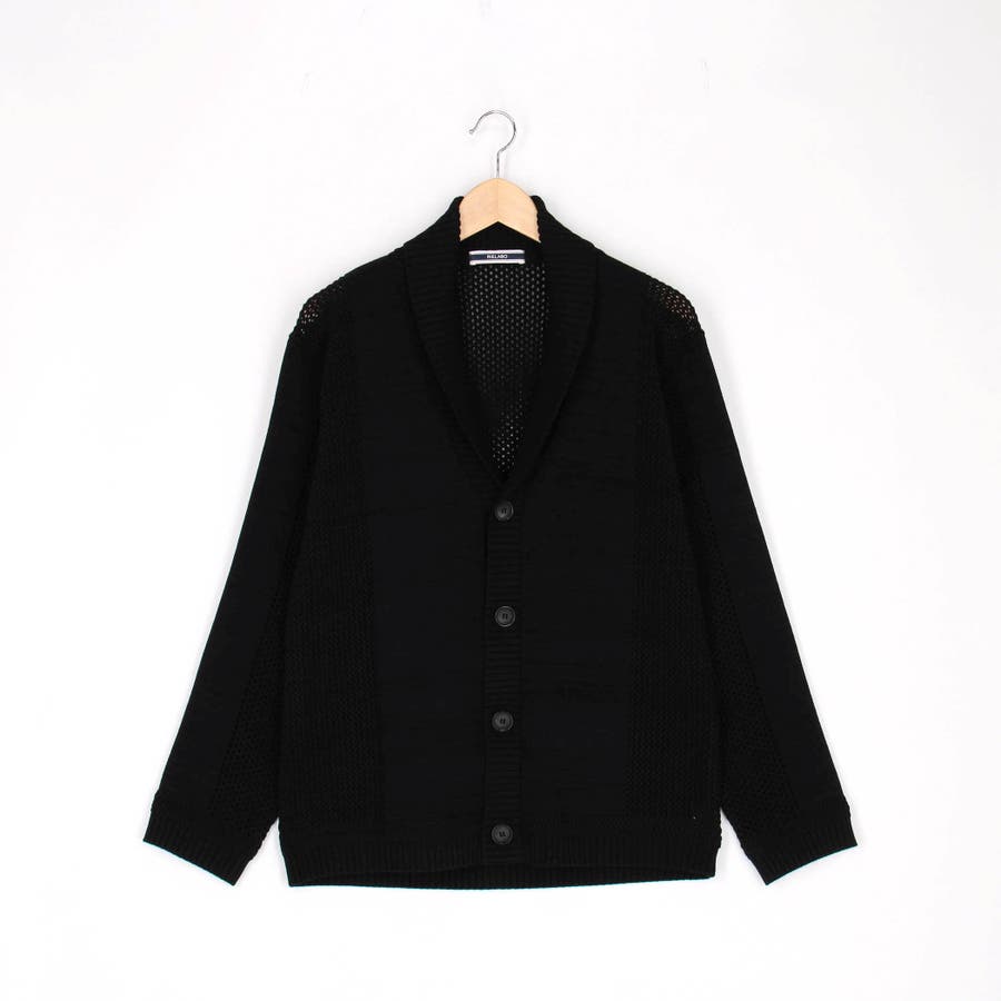 編地切り替えデザインのショールカラーカーディガン。大小のメッシュ編みと天竺編みでメリハリを出したオリジナリティ溢れる一着です。ざっくりとしたメッシュ編み部分は程よい透け感があり、トレンド感のある着こなしも楽しめます。衿から前立てにかけてのリブ部分はスッキリとご着用いただけるよう、シングル仕立てにして軽めな印象に仕上げました。