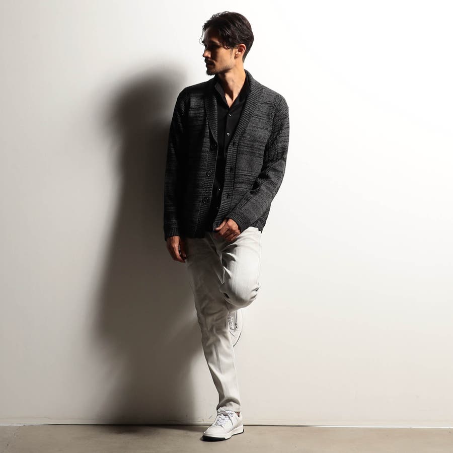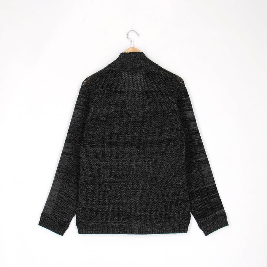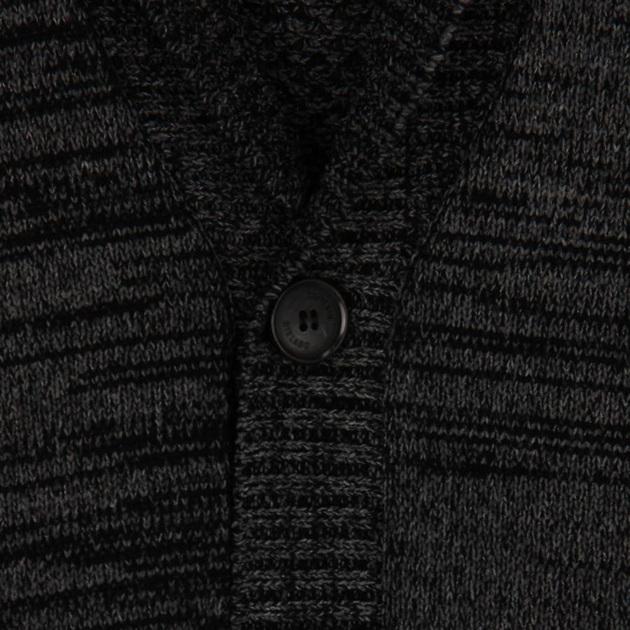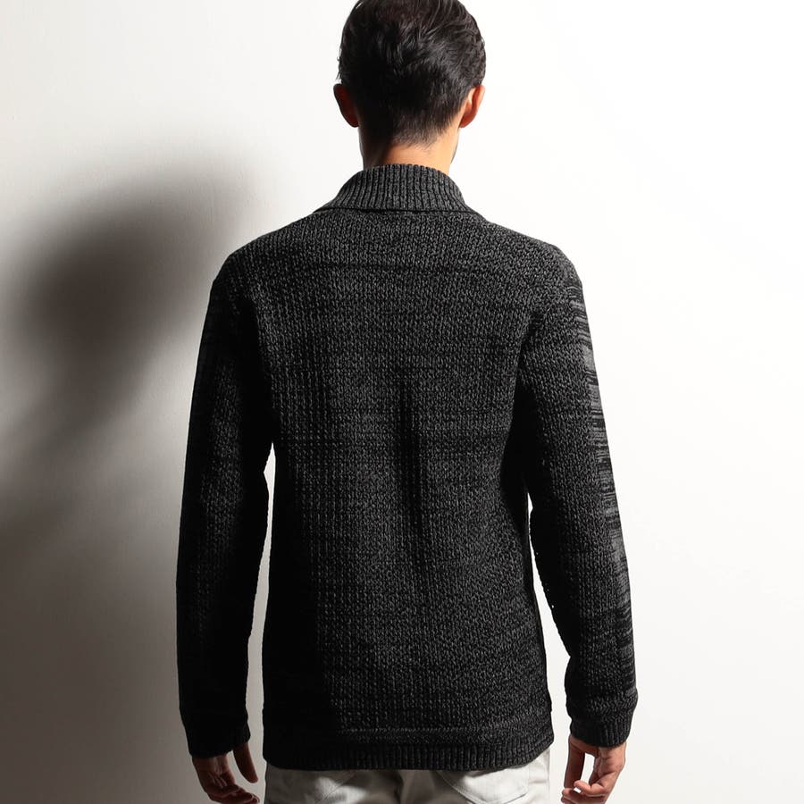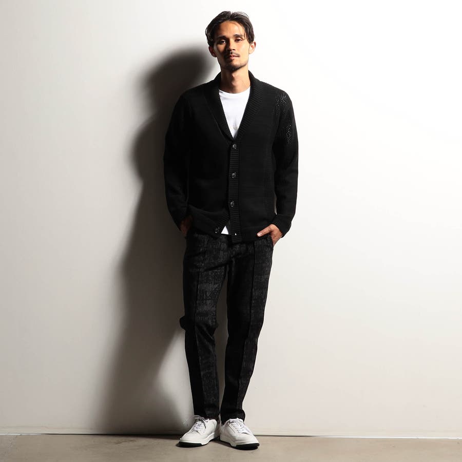 編地切り替えデザインのショールカラーカーディガン。大小のメッシュ編みと天竺編みでメリハリを出したオリジナリティ溢れる一着です。ざっくりとしたメッシュ編み部分は程よい透け感があり、トレンド感のある着こなしも楽しめます。衿から前立てにかけてのリブ部分はスッキリとご着用いただけるよう、シングル仕立てにして軽めな印象に仕上げました。