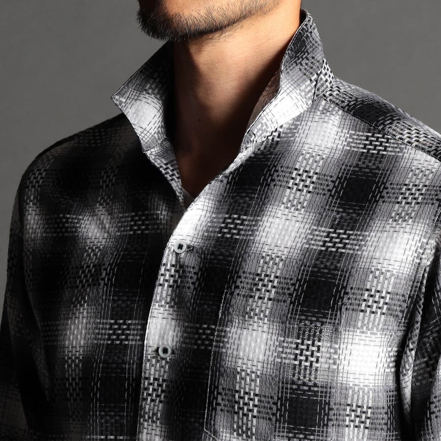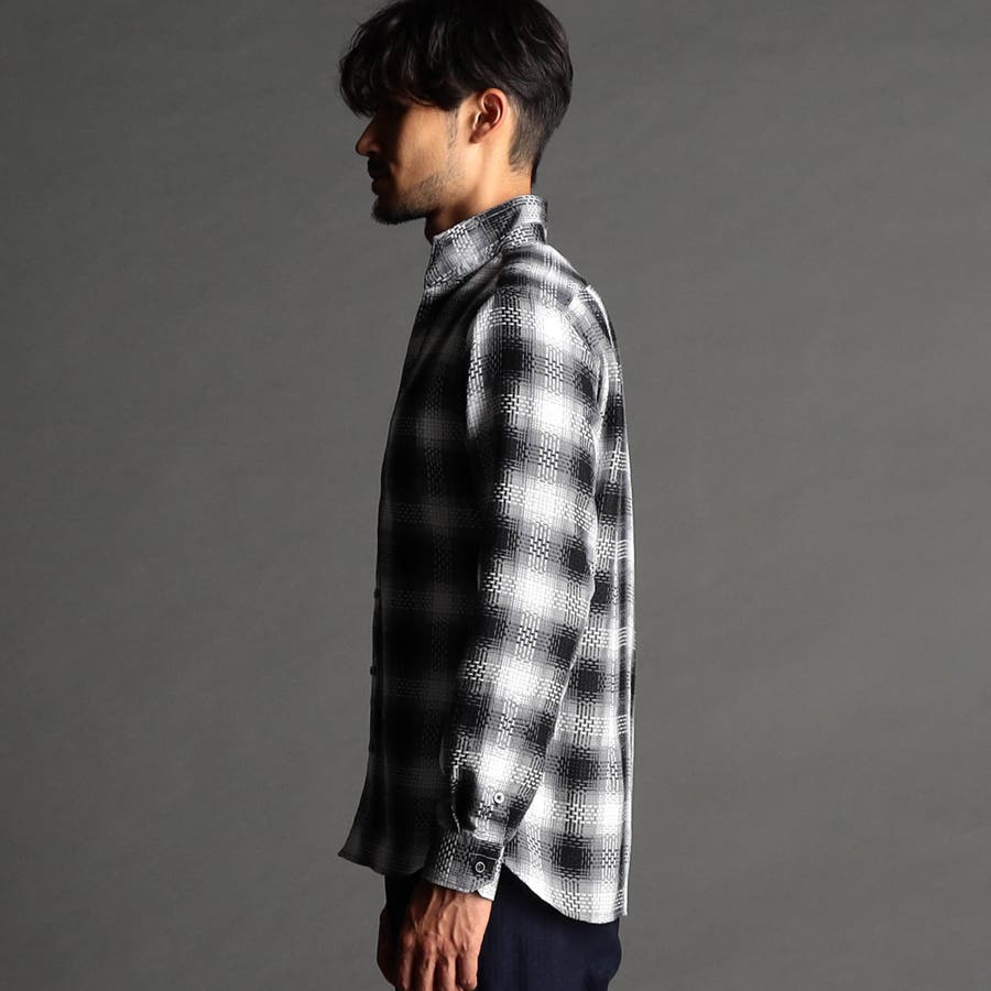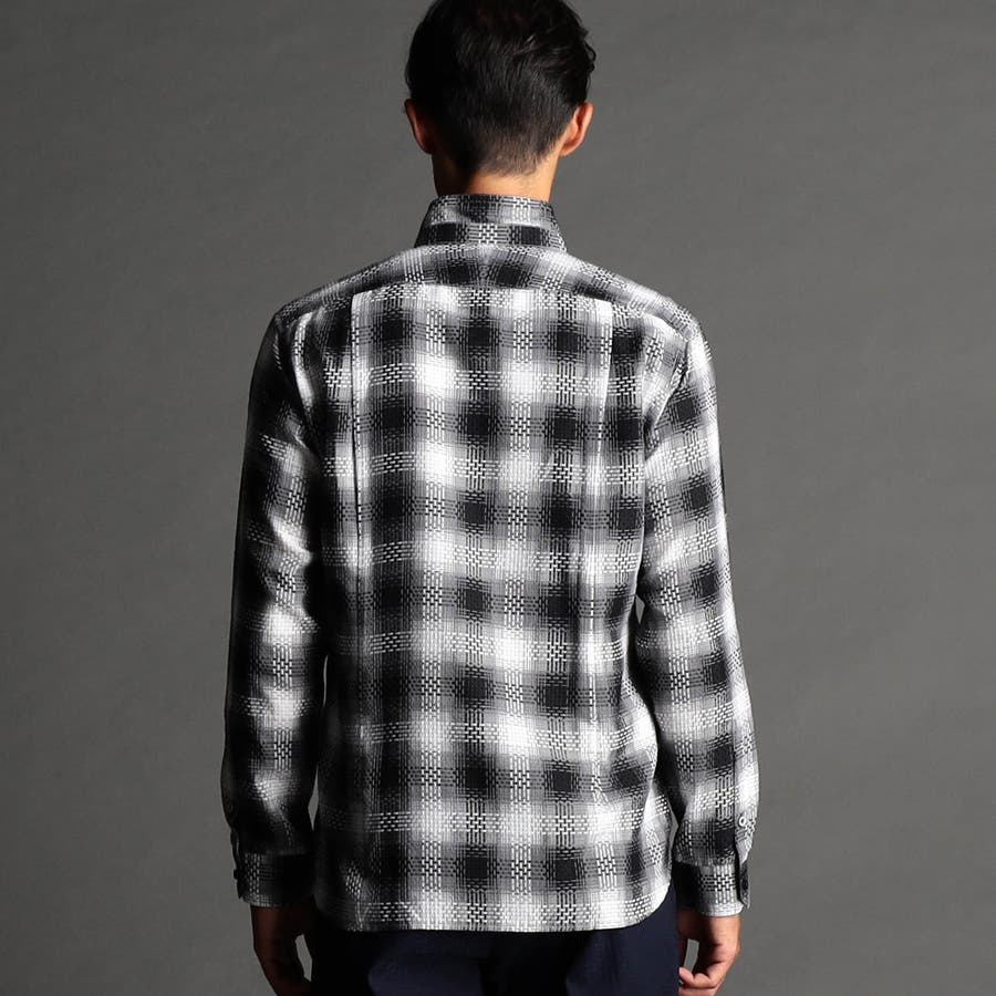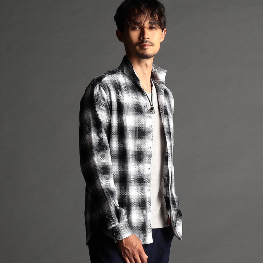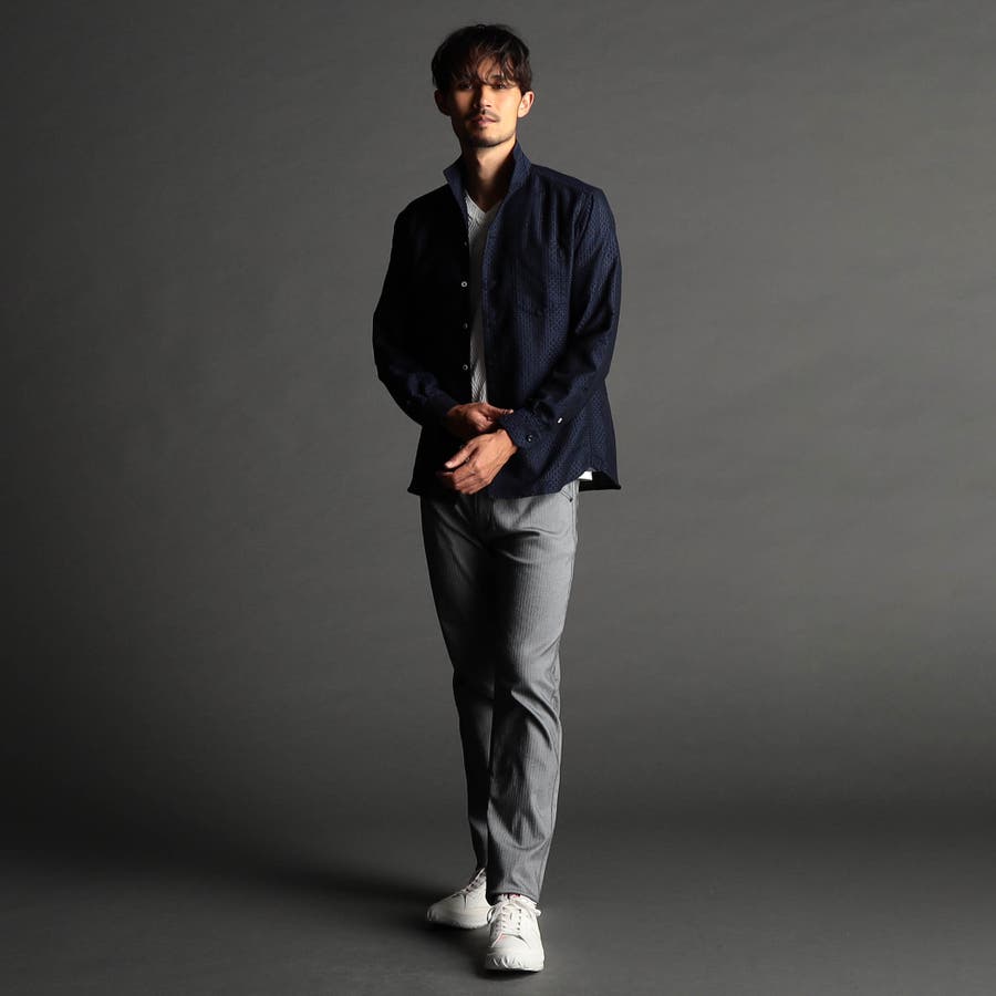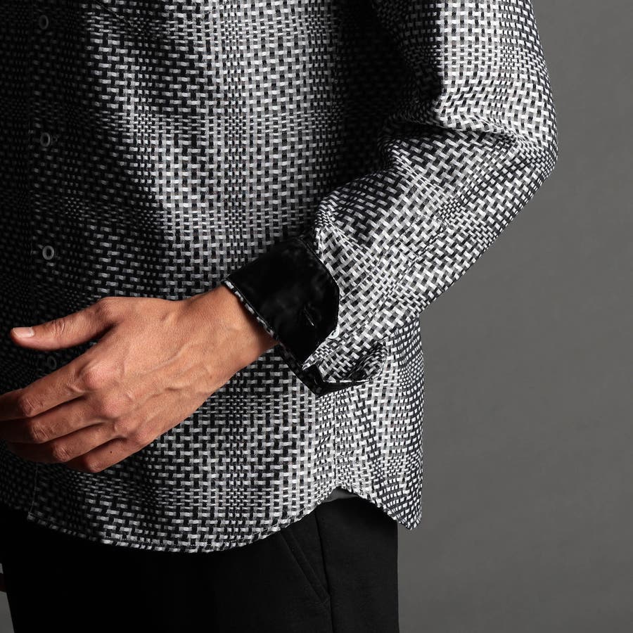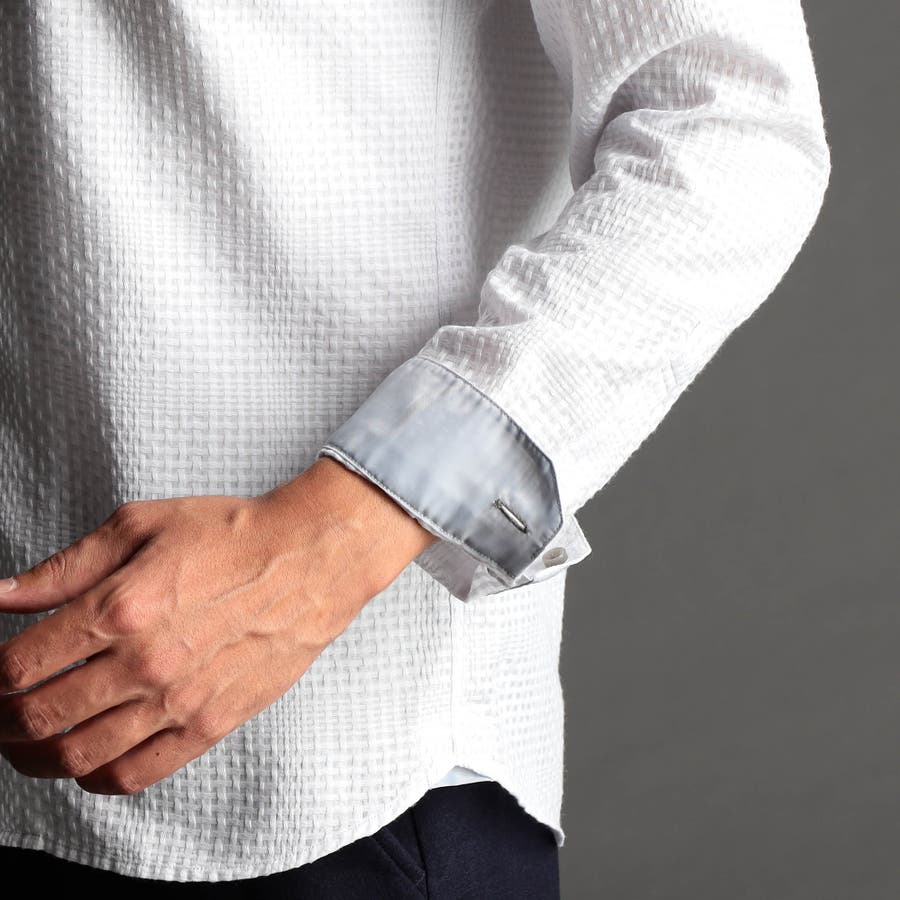 衿端にワイヤ-を仕込んだスタンド、イタリアンカラ-シャツ。ヨーク裏やカフス裏には同色系の裏地を採用して部分的な厚みを抑え、折り返した時のアクセントにしています。生地の配色とリンクした釦も、ちょっとしたアクセントになっています。