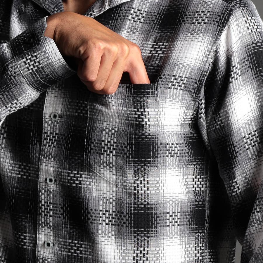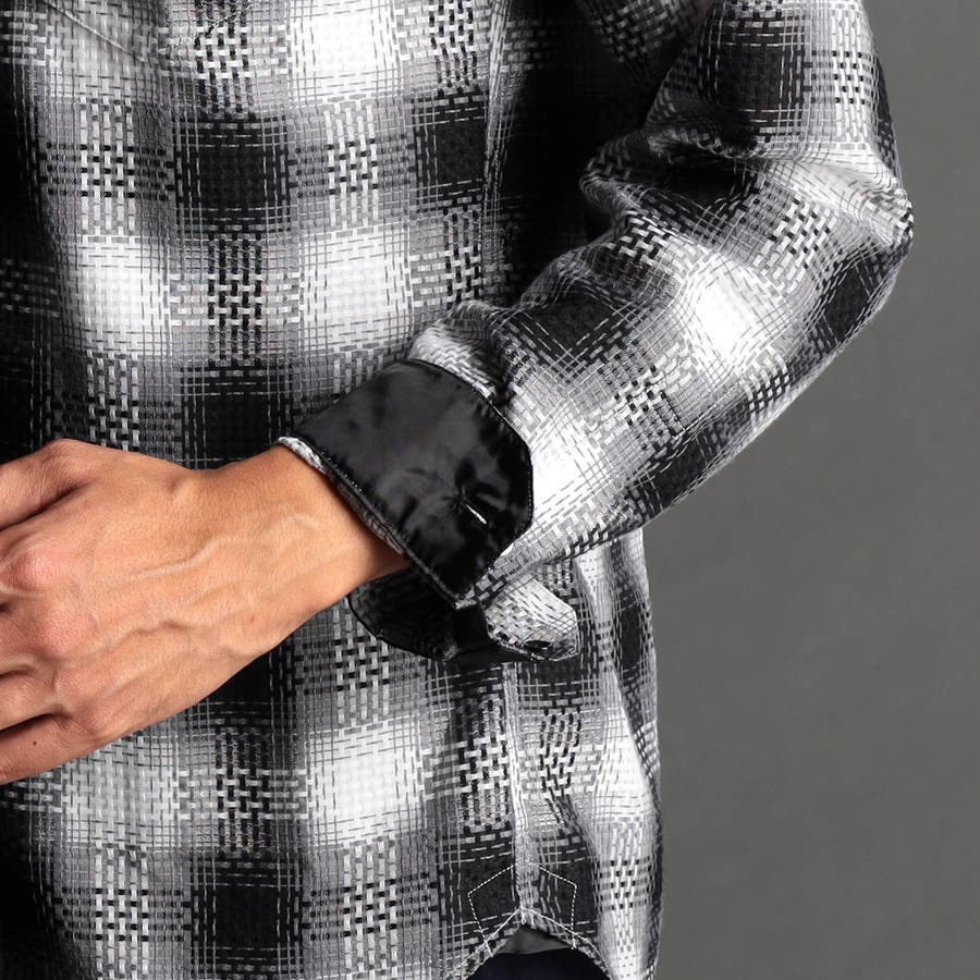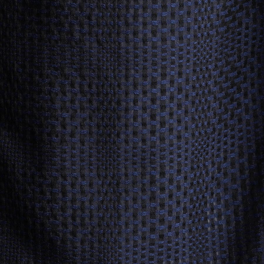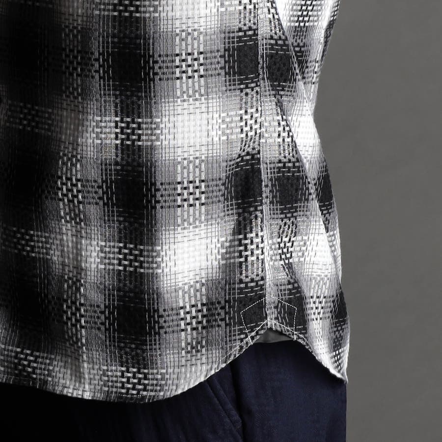 ポリエステル混のドビー織チェック柄素材。生地は兵庫県西脇市で生産した国産素材です。綿糸とポリエステル糸で作っているのですが、綿糸にはオーガニックコットン、ポリエステルは再生ポリエステルを使用して環境に配慮した素材になっています。後加工で吸水速乾効果もプラス。チェック柄の格子部分は糸が詰まっていますが、平織り部分は薄く透け感のあるシアー素材です。
