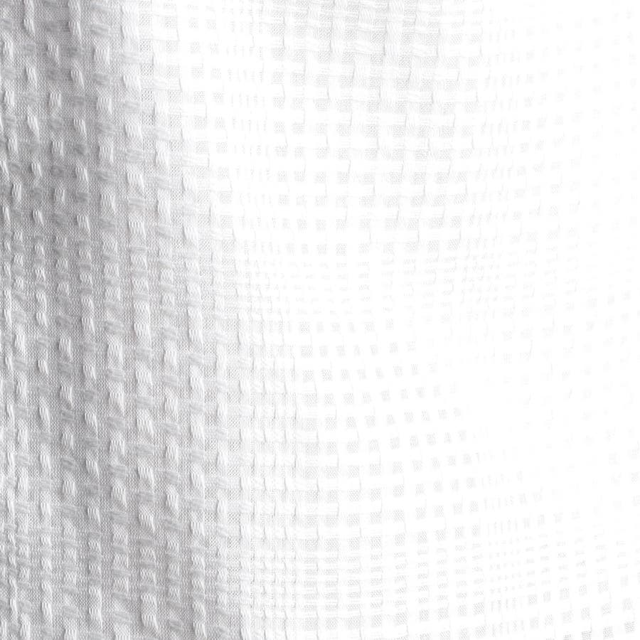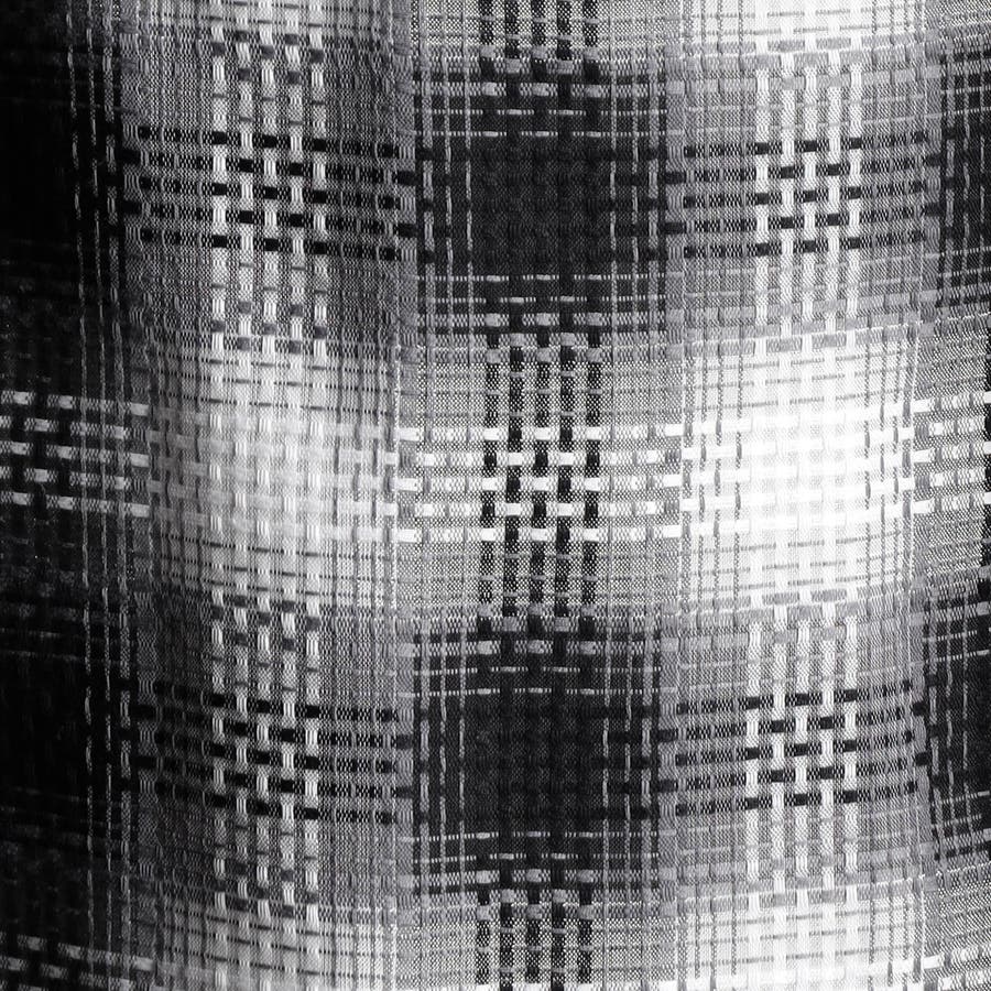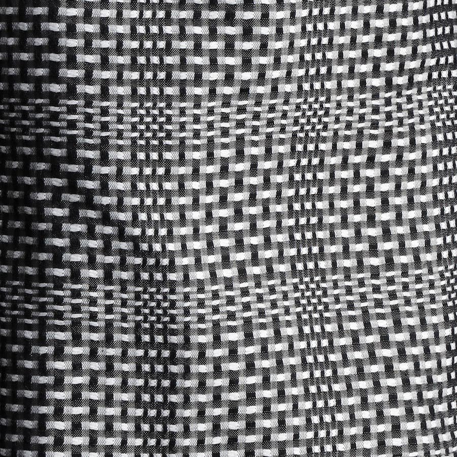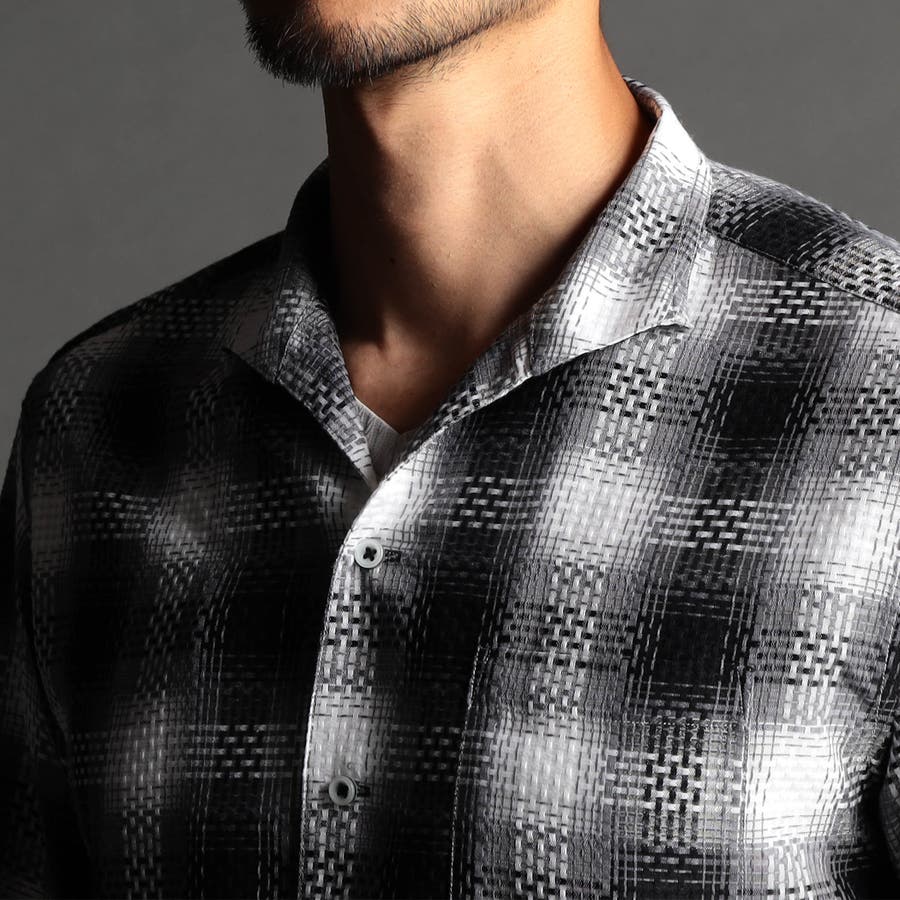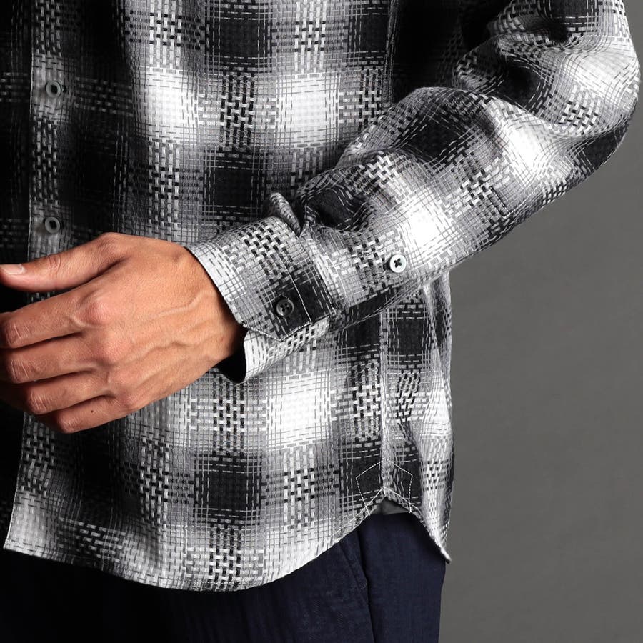 ポリエステル混のドビー織チェック柄素材。生地は兵庫県西脇市で生産した国産素材です。綿糸とポリエステル糸で作っているのですが、綿糸にはオーガニックコットン、ポリエステルは再生ポリエステルを使用して環境に配慮した素材になっています。後加工で吸水速乾効果もプラス。チェック柄の格子部分は糸が詰まっていますが、平織り部分は薄く透け感のあるシアー素材です。