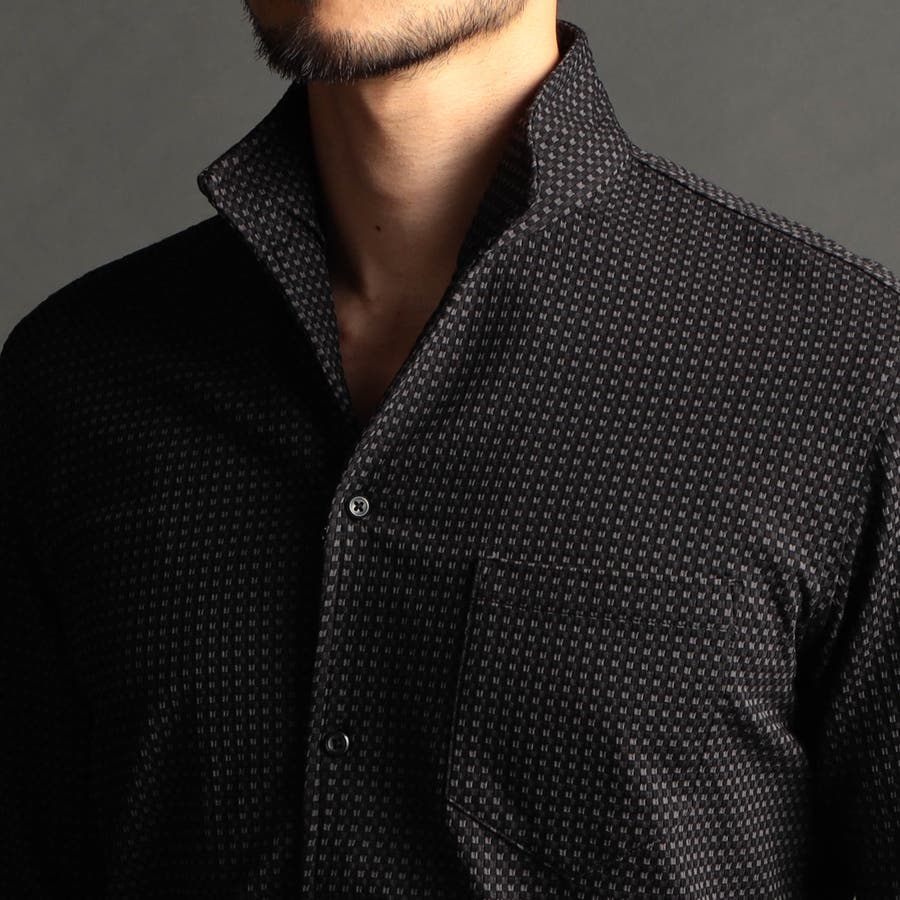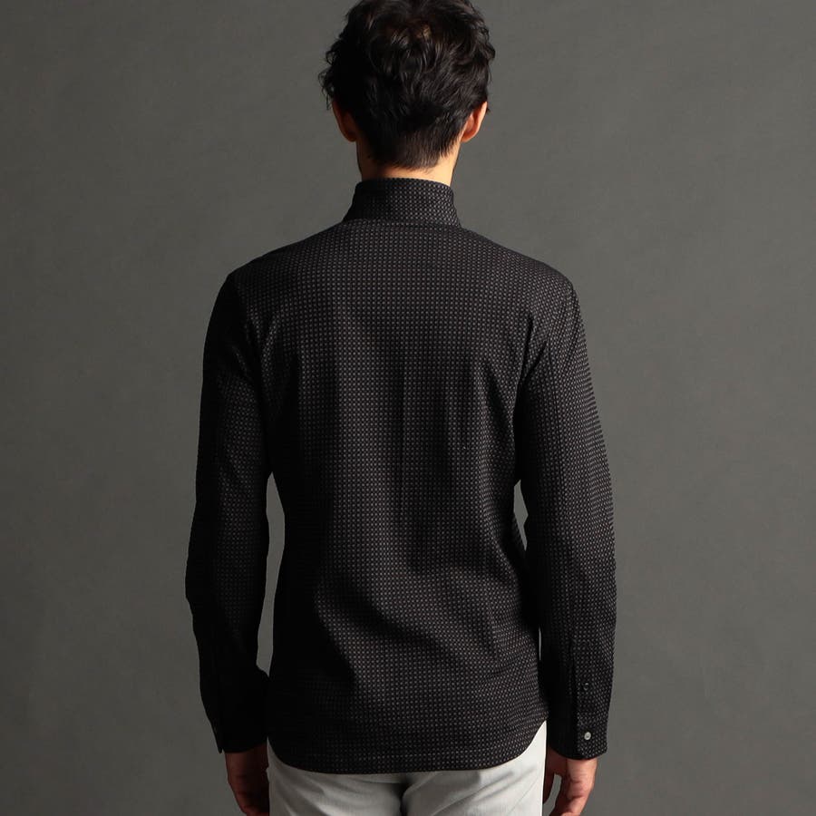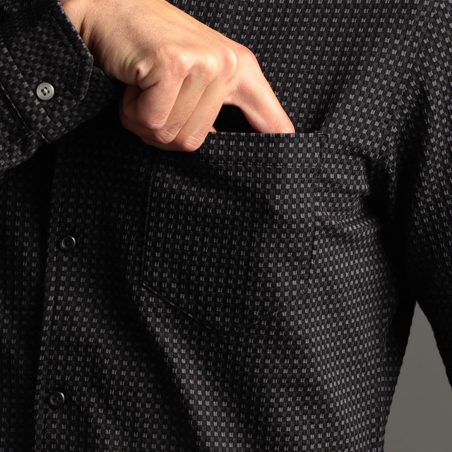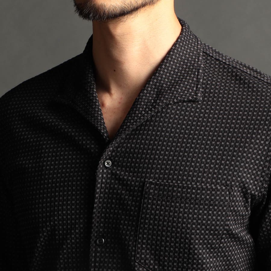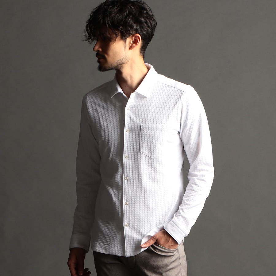 カットソー素材のシアサッカ-シャツ。衿端にワイヤ-を仕込んだイタリアンカラ-とショートレギュラーカラーで展開します。左胸のパッチポケットや袖口部分の剣ボロ仕様、オリジナルの配色ボタンがちょっとしたアクセントになっています。