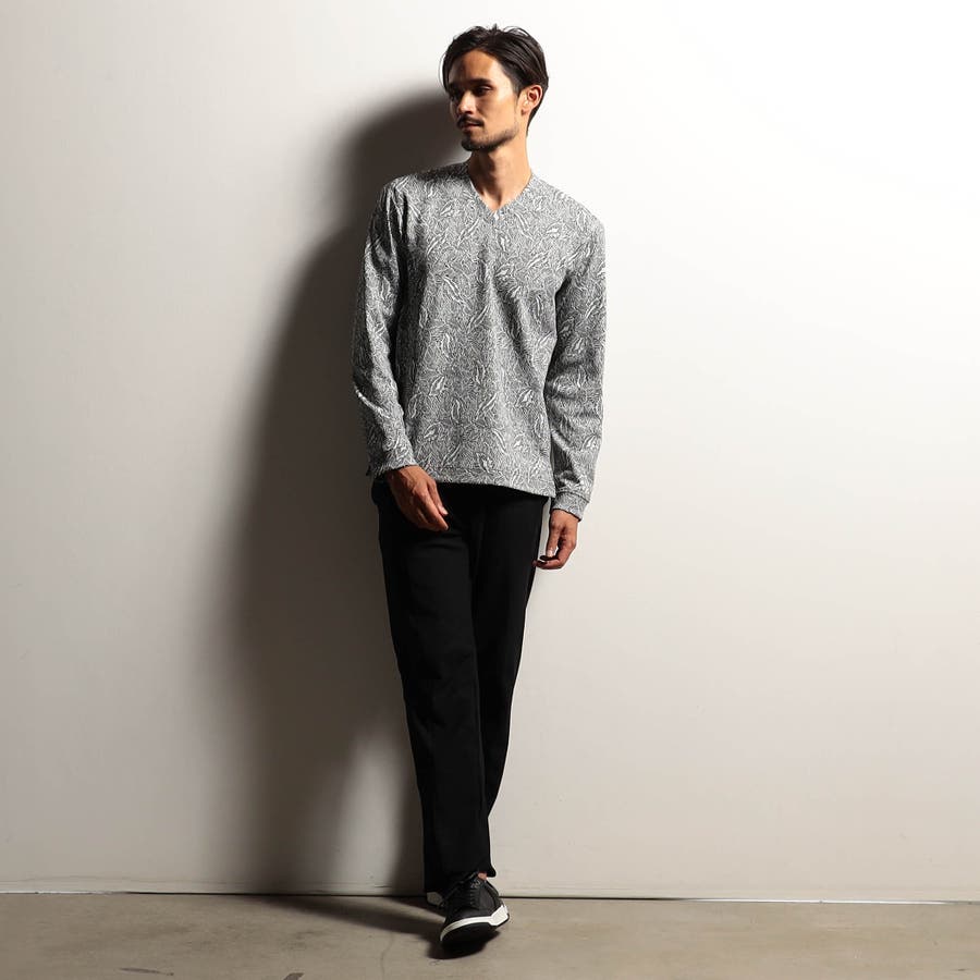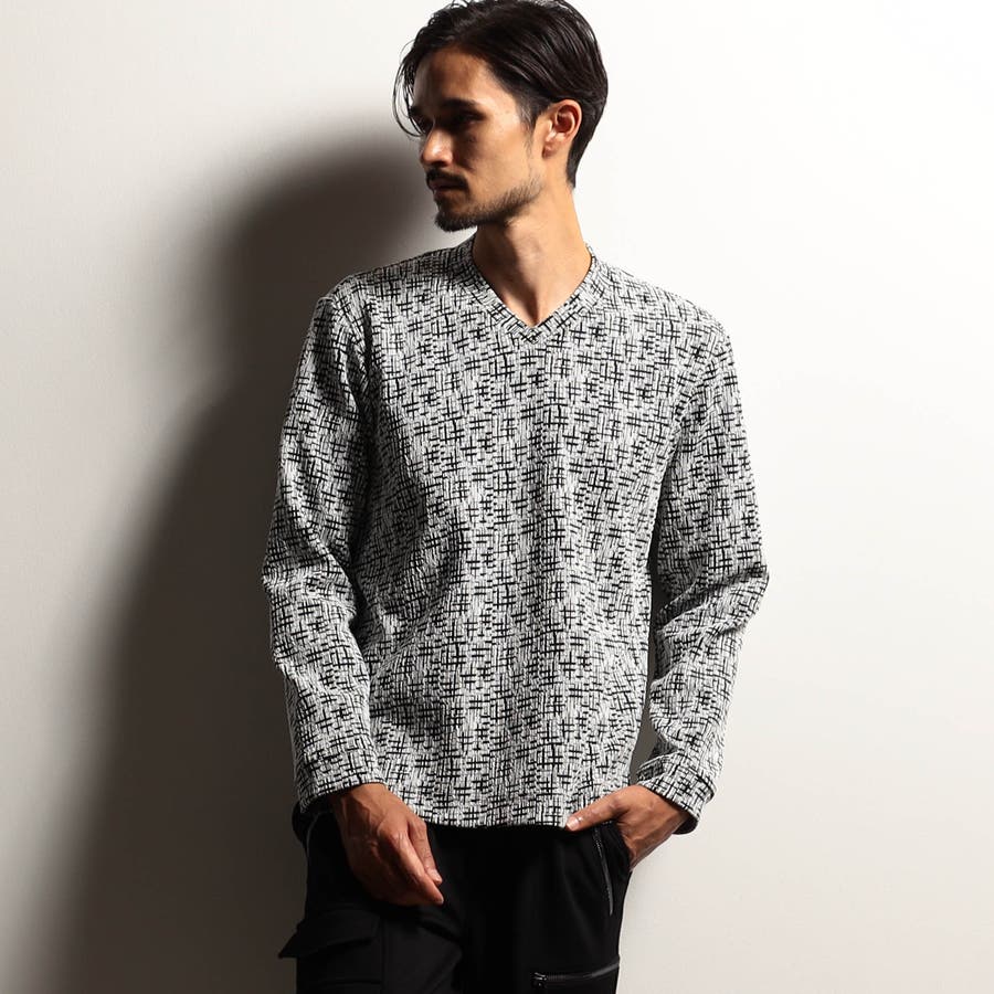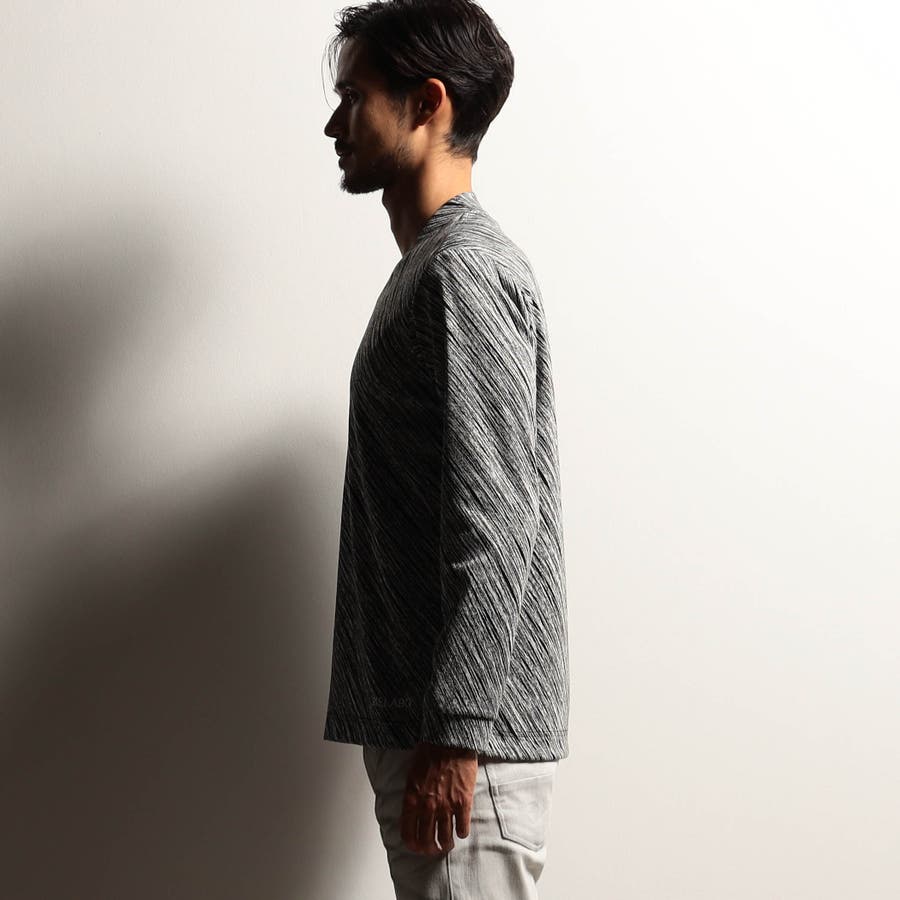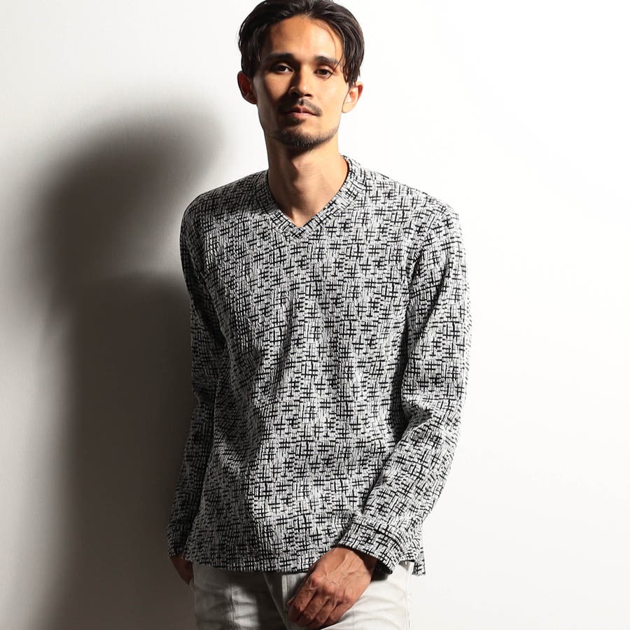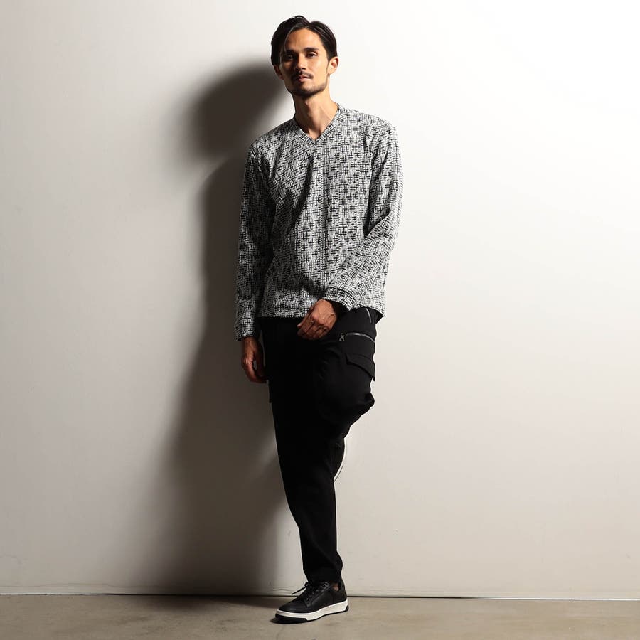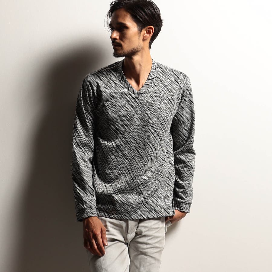 オフ×ブラック配色の異なる地柄ジャカード素材を使用したVネックカットソーです。後衿を高めに設定したドレスカラー仕様でスタイリッシュな印象を演出しつつ、ジャケット等アウターの衿汚れを軽減してくれるインナー使いにもピッタリな一着。更に脇の縫い代には抗菌防臭テープを挟み込み、機能性もプラスしています。