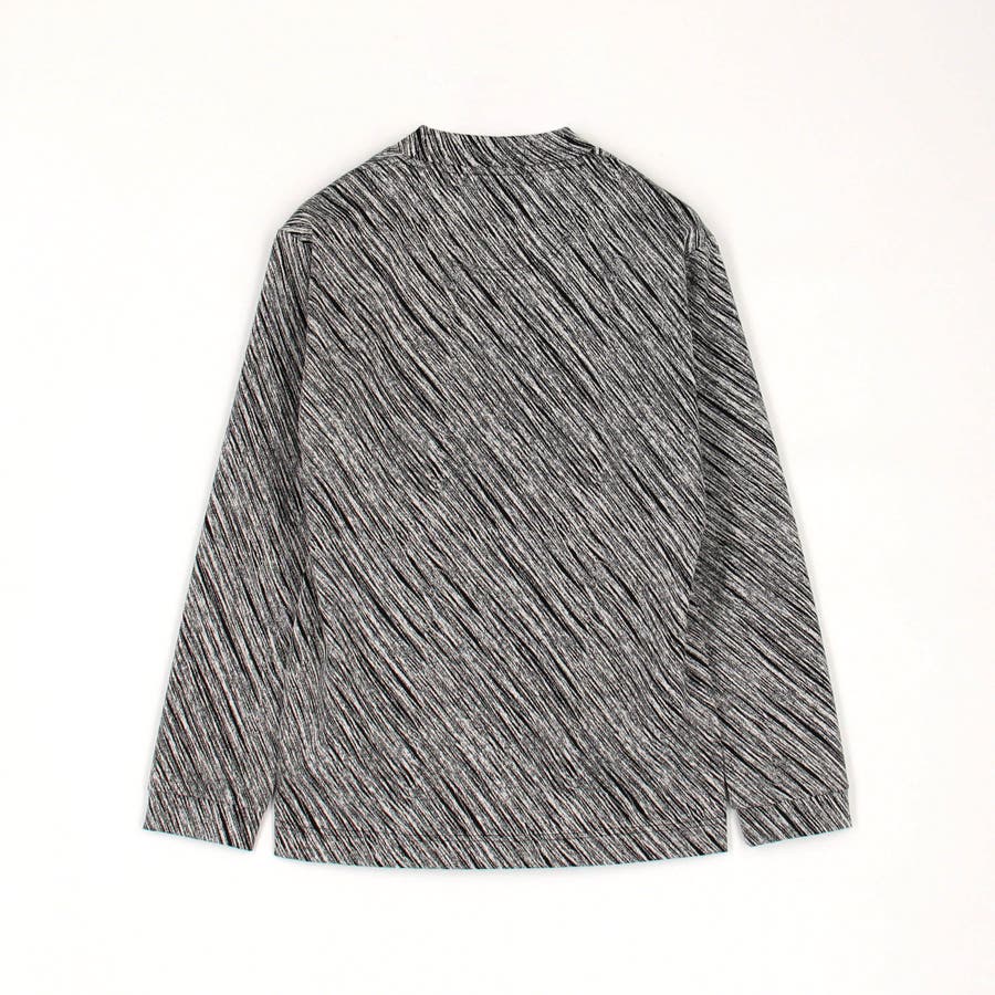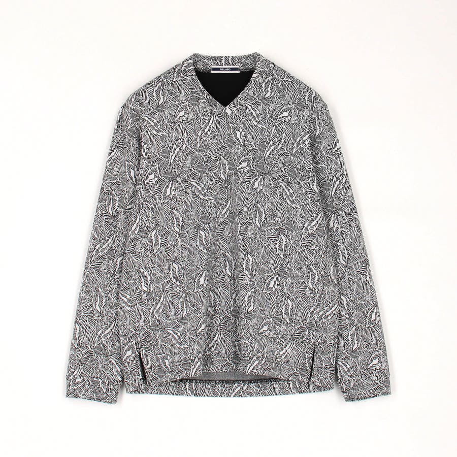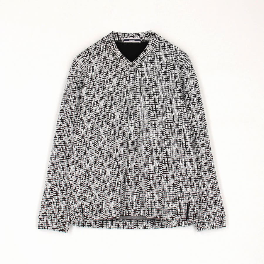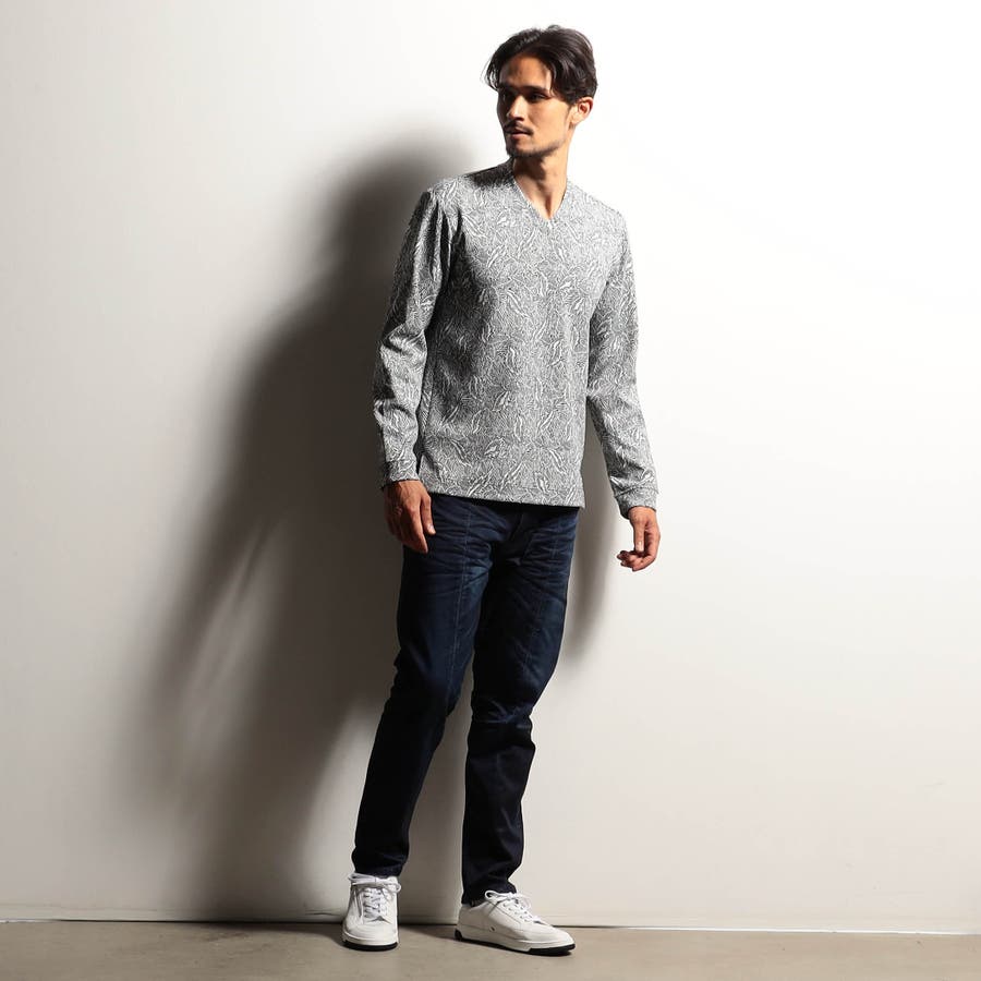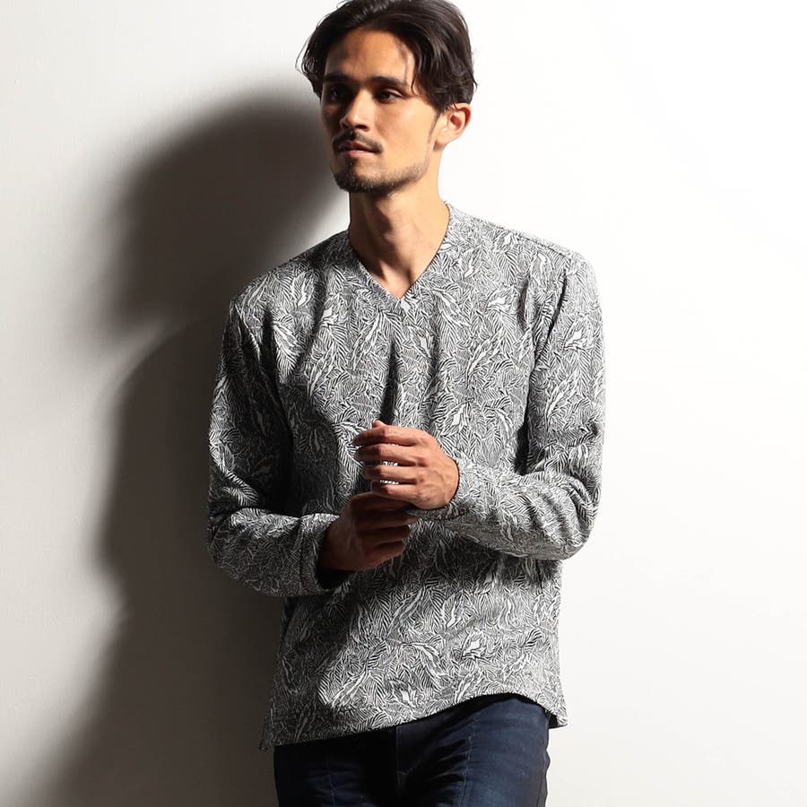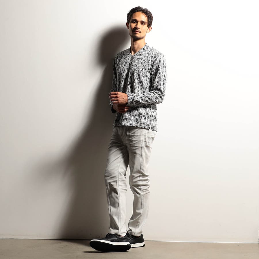 オフ×ブラック配色の異なる地柄ジャカード素材を使用したVネックカットソーです。後衿を高めに設定したドレスカラー仕様でスタイリッシュな印象を演出しつつ、ジャケット等アウターの衿汚れを軽減してくれるインナー使いにもピッタリな一着。更に脇の縫い代には抗菌防臭テープを挟み込み、機能性もプラスしています。