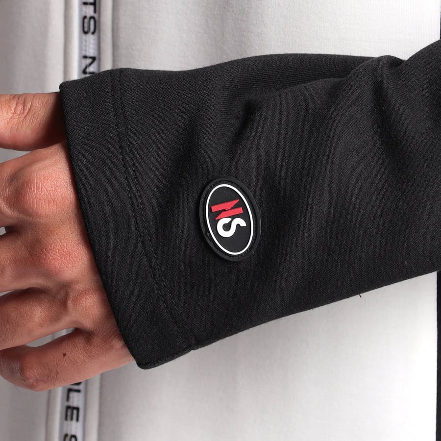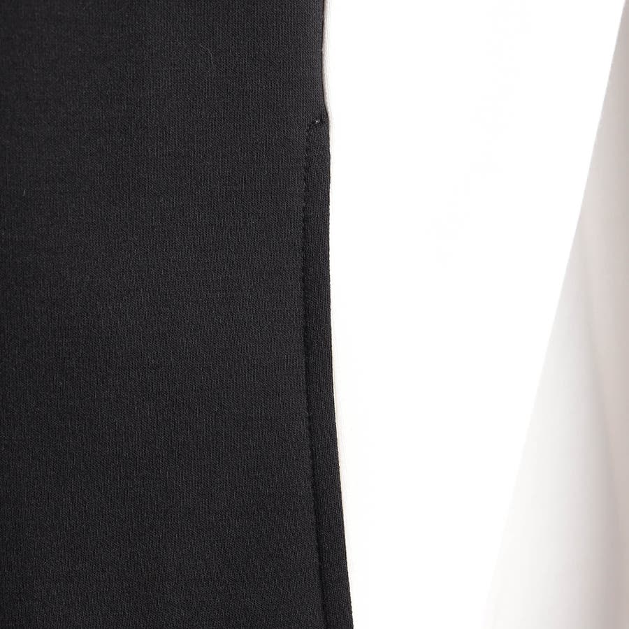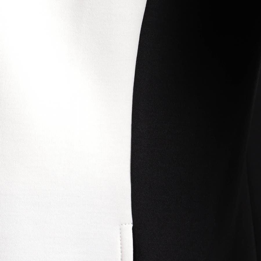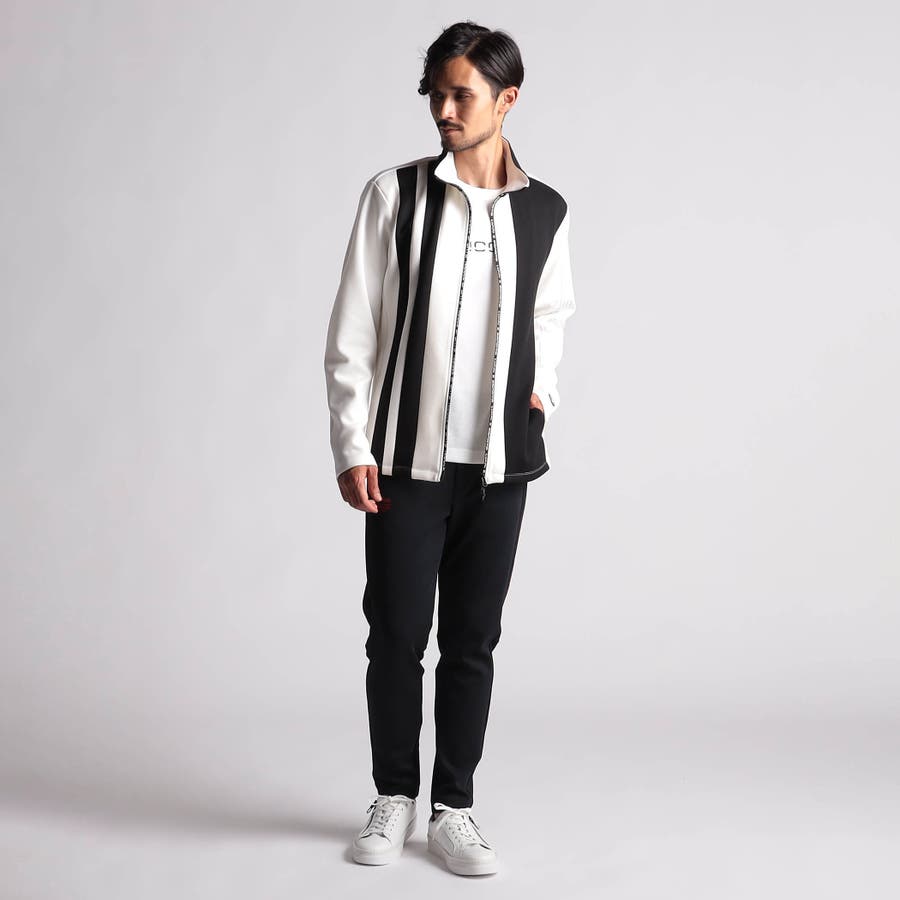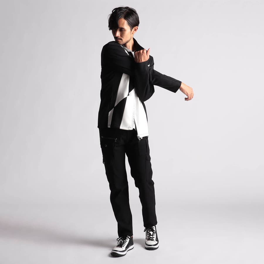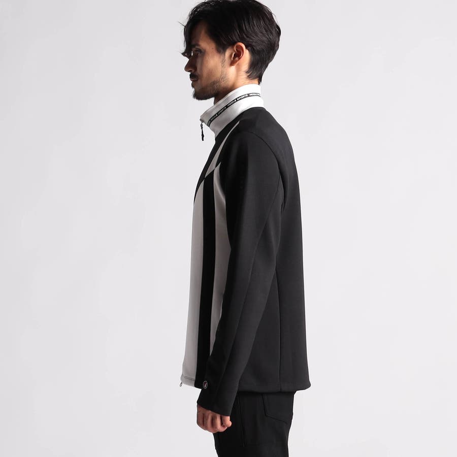 エッジの効いたカッティングをジオメトリックに配置したモノトーンバイカラースタンドブルゾン。スポーティなダンボールニットをモードなルックに昇華し、インパクトあるアイテムに仕上げています。首元にはロゴテープのアクセント、裾と袖口には切り替えを入れずスタイリングしやすいデザインにしています。