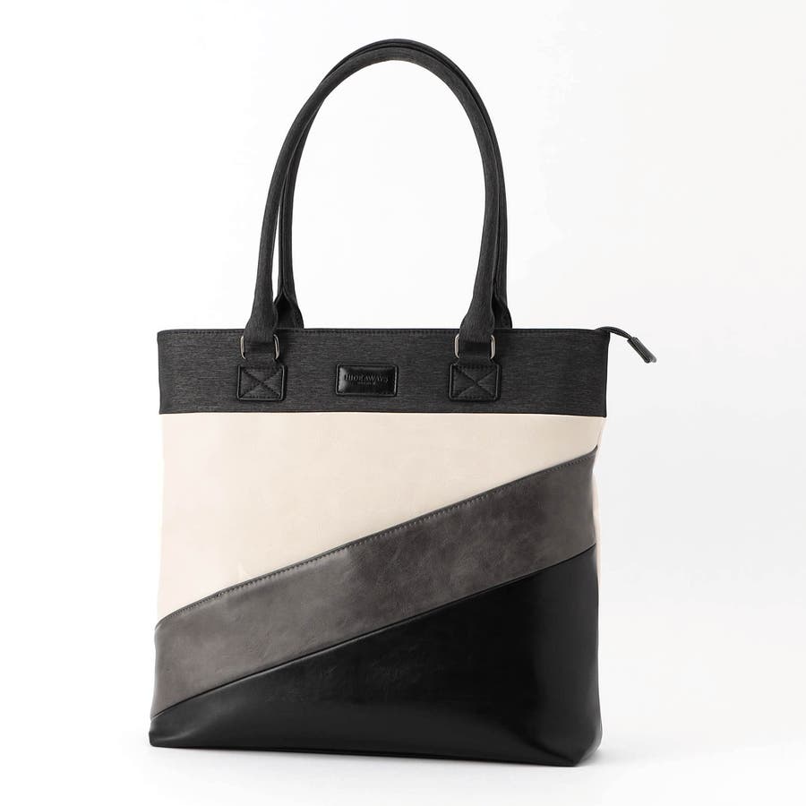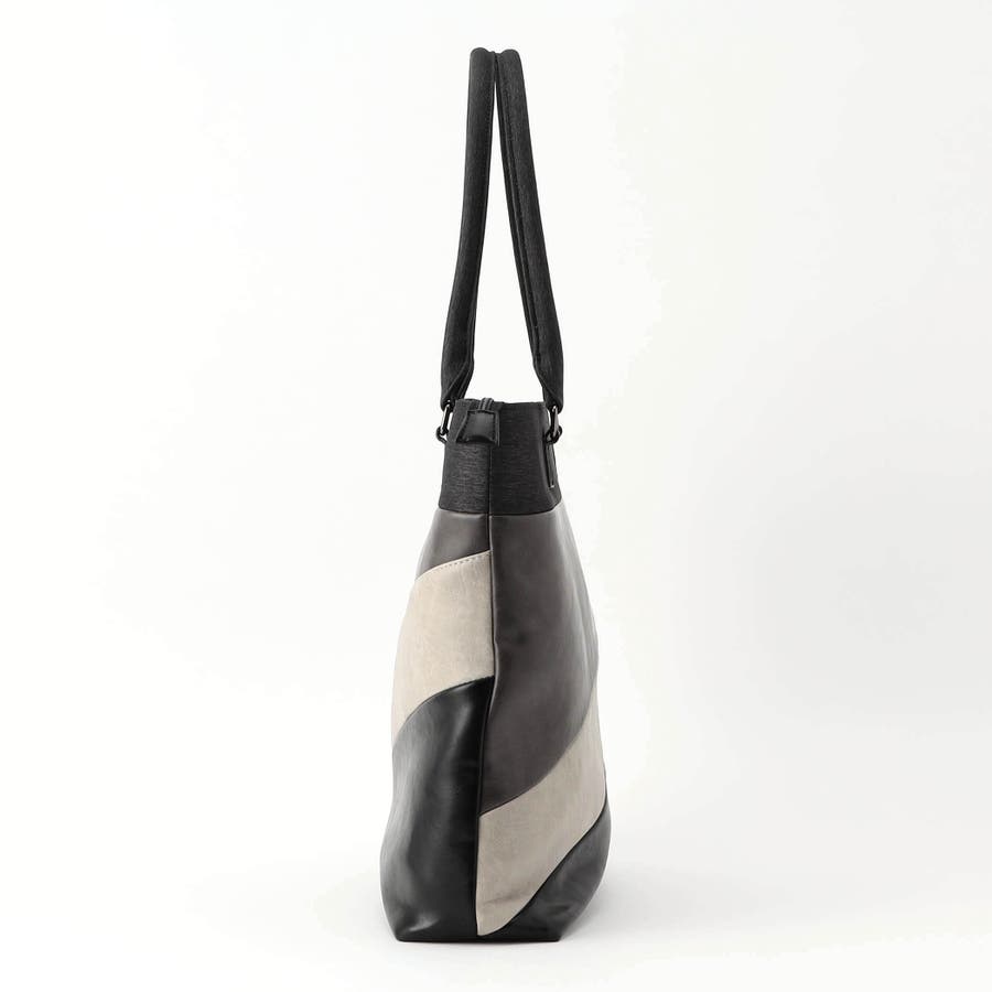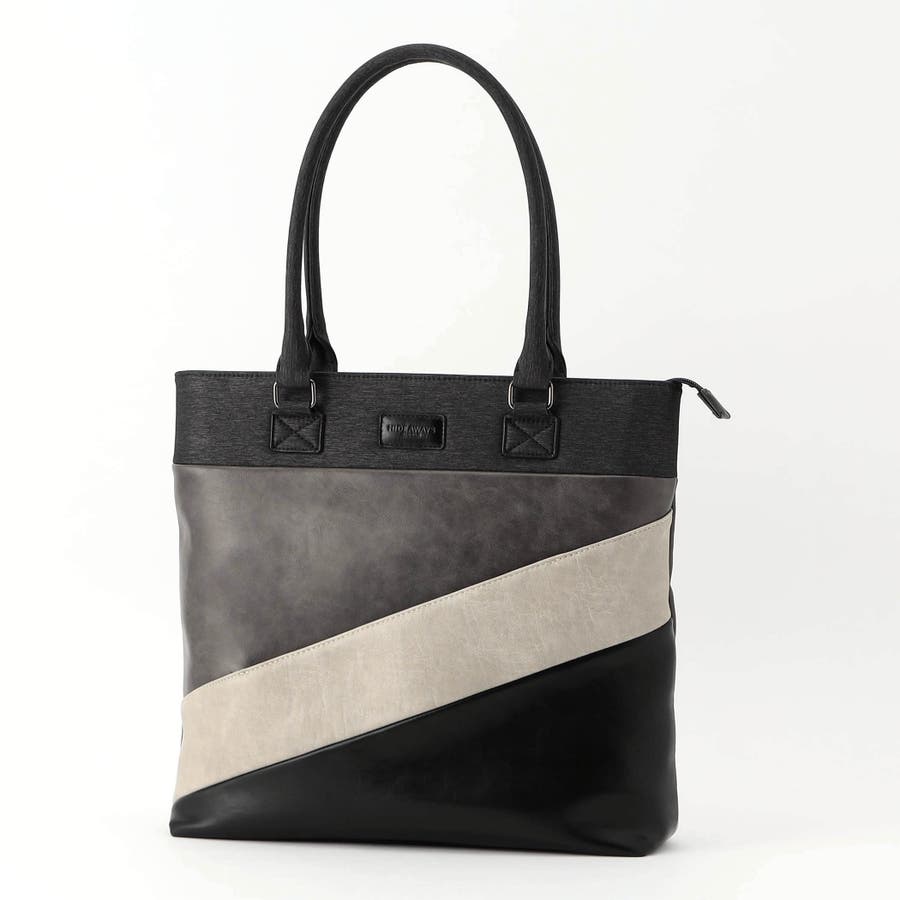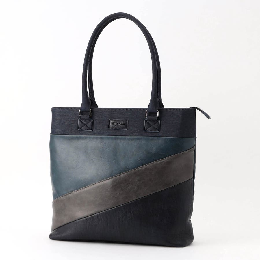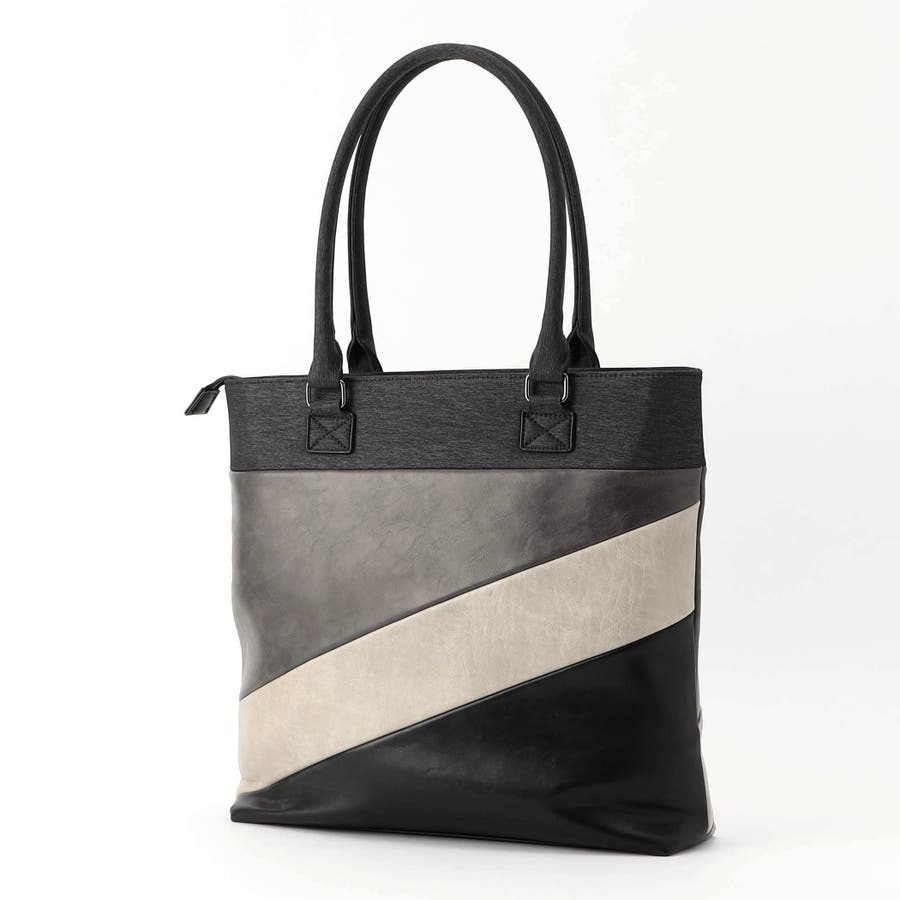 大胆なパネル切り替えデザインがインパクトのあるトートバッグです。