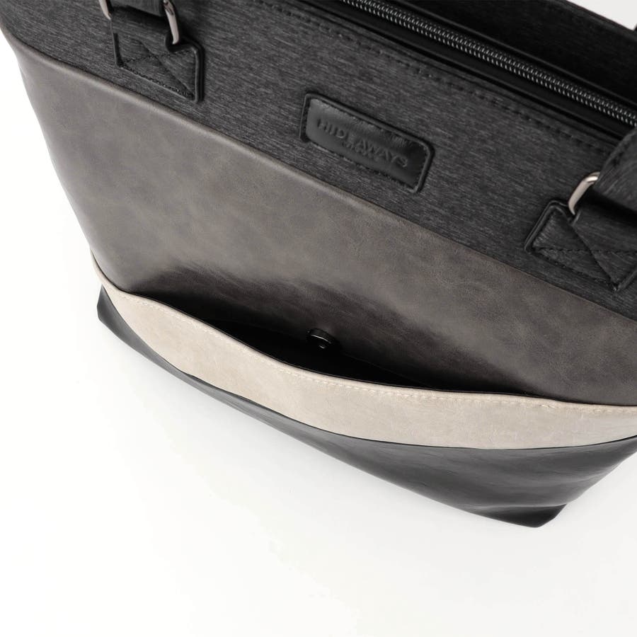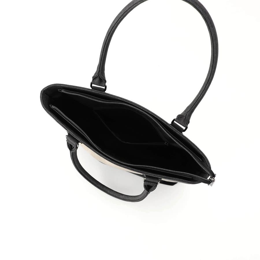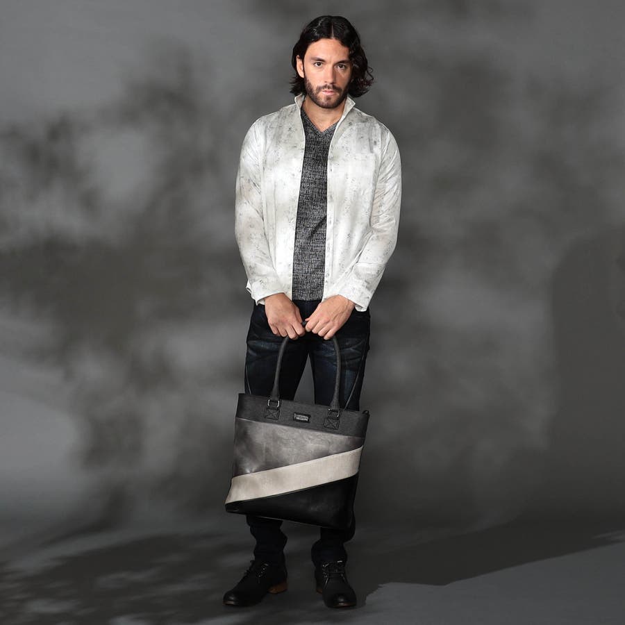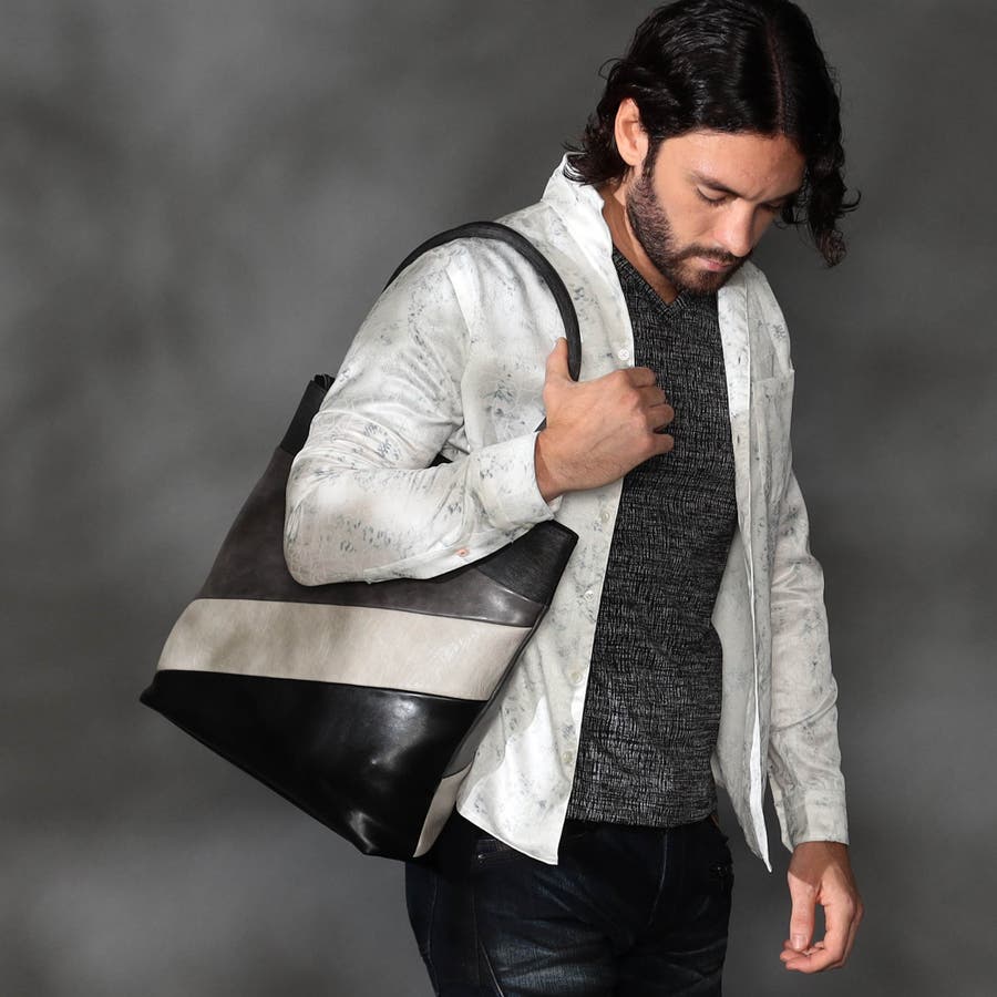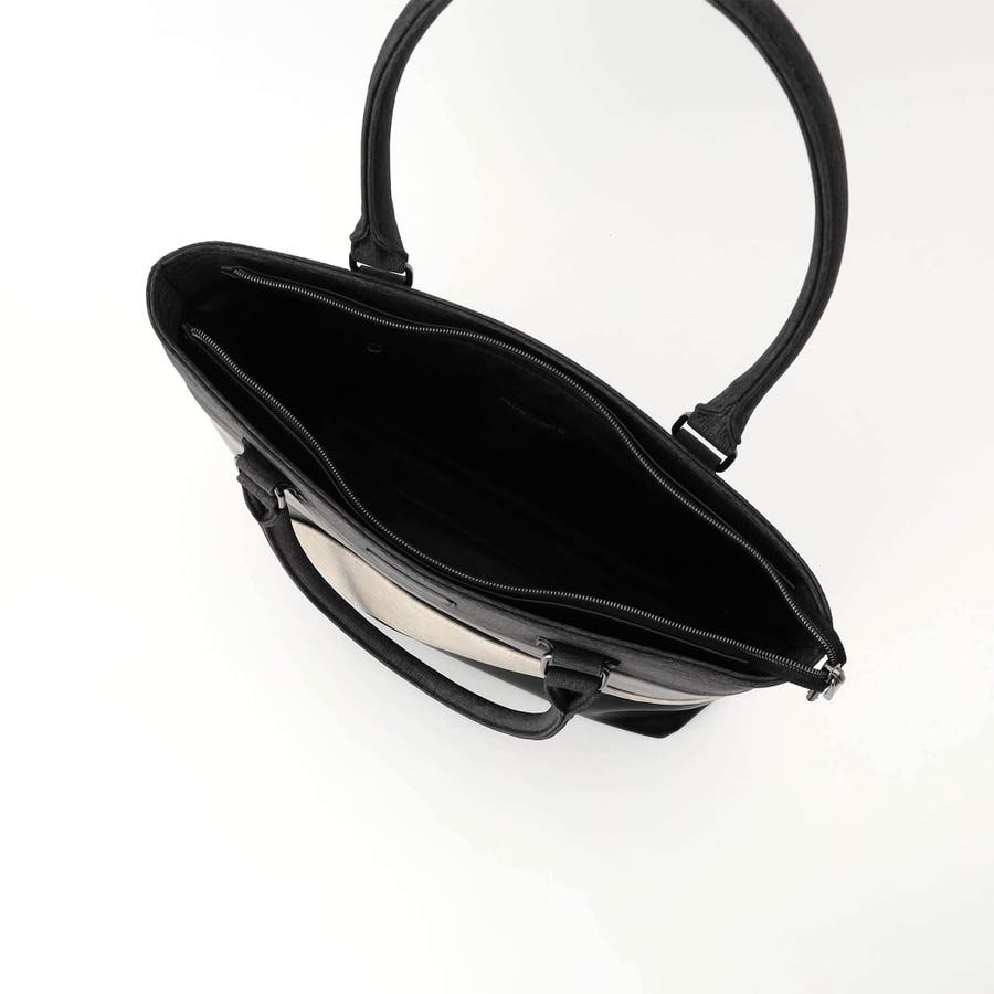 大胆なパネル切り替えデザインがインパクトのあるトートバッグです。