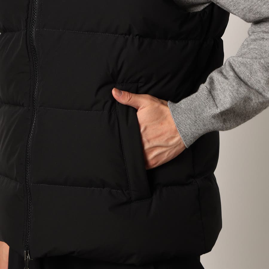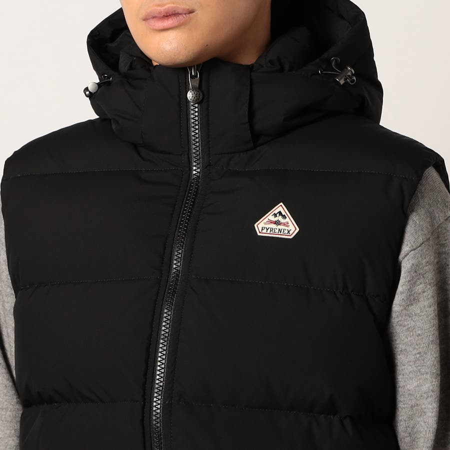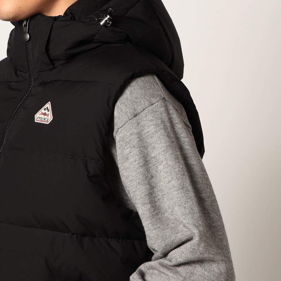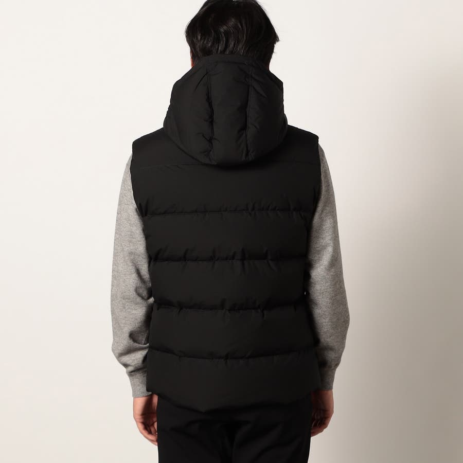 ジャケットタイプと同様に細めのピッチでキルトステッチを前面に施しシャープに仕上げたヒップレングスのベストで、フードが着脱可能なシンプルなデザインはフランス本国でもベストセラーとなっています。