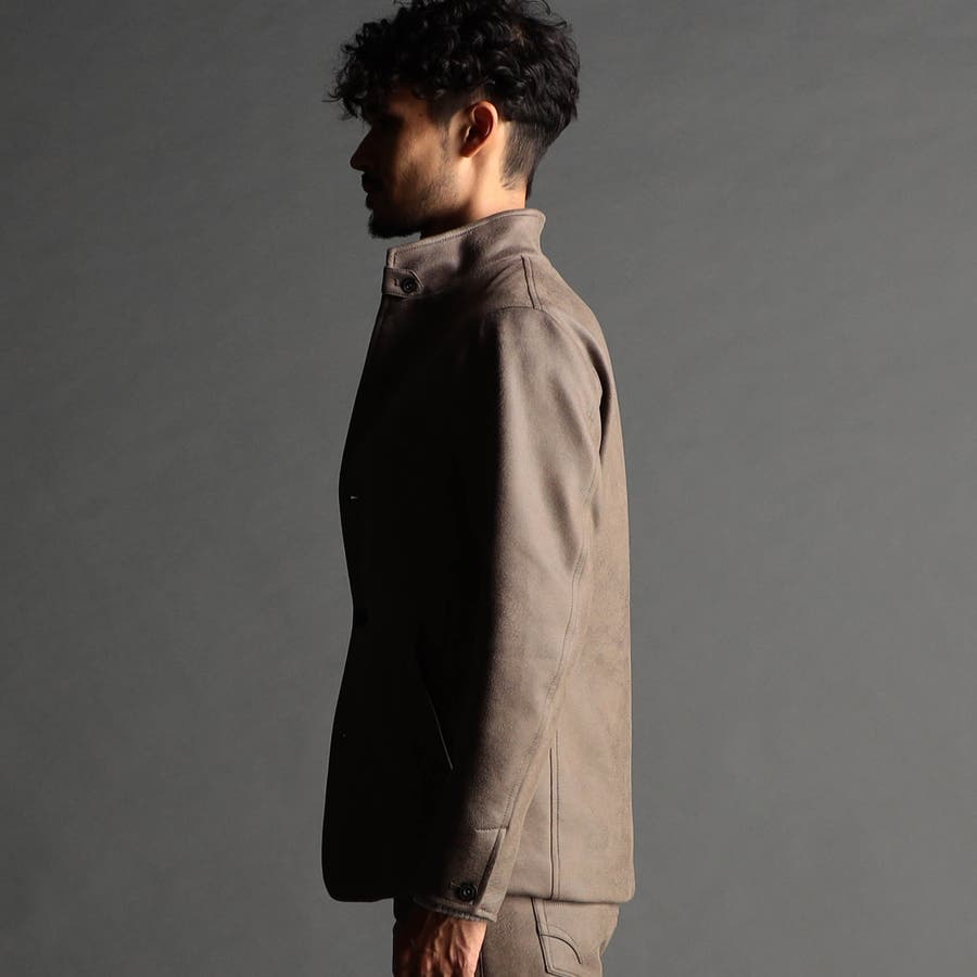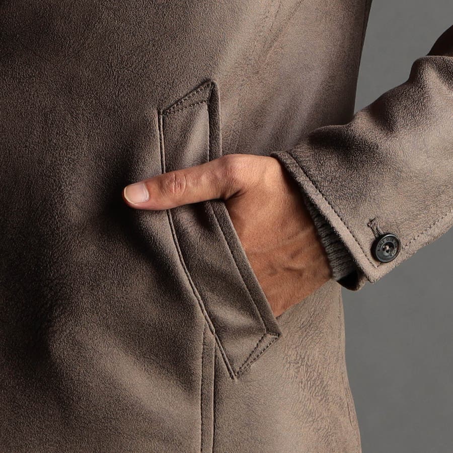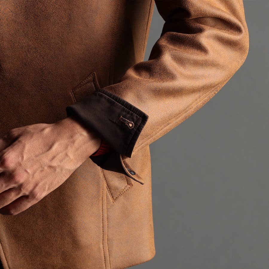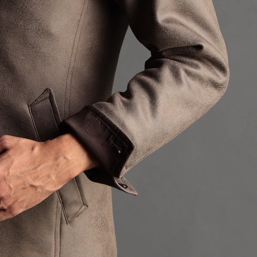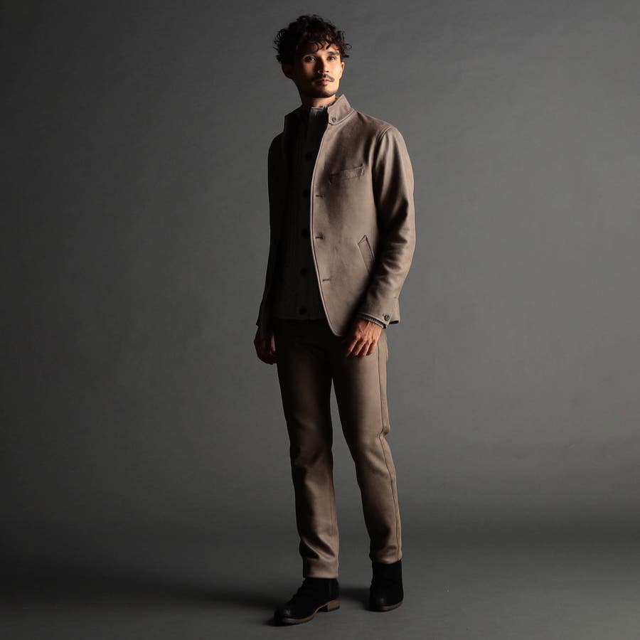 ポリエステルのマイクロファイバーで編まれたポンチ(ジャージ)素材の表面をスウェード起毛、トーン違いの同色系ムラプリントを施してレザー調の見え方に作っています。滑らかなタッチとソフト風合い、マルチなストレッチ性が特徴。ジャージ素材なのではのプリッとした横張り感もあり、シルエットを綺麗に作ります。更に生地加工で撥水効果をプラス、防汚効果を高めています。