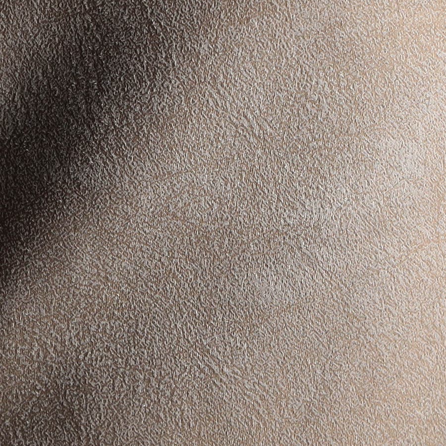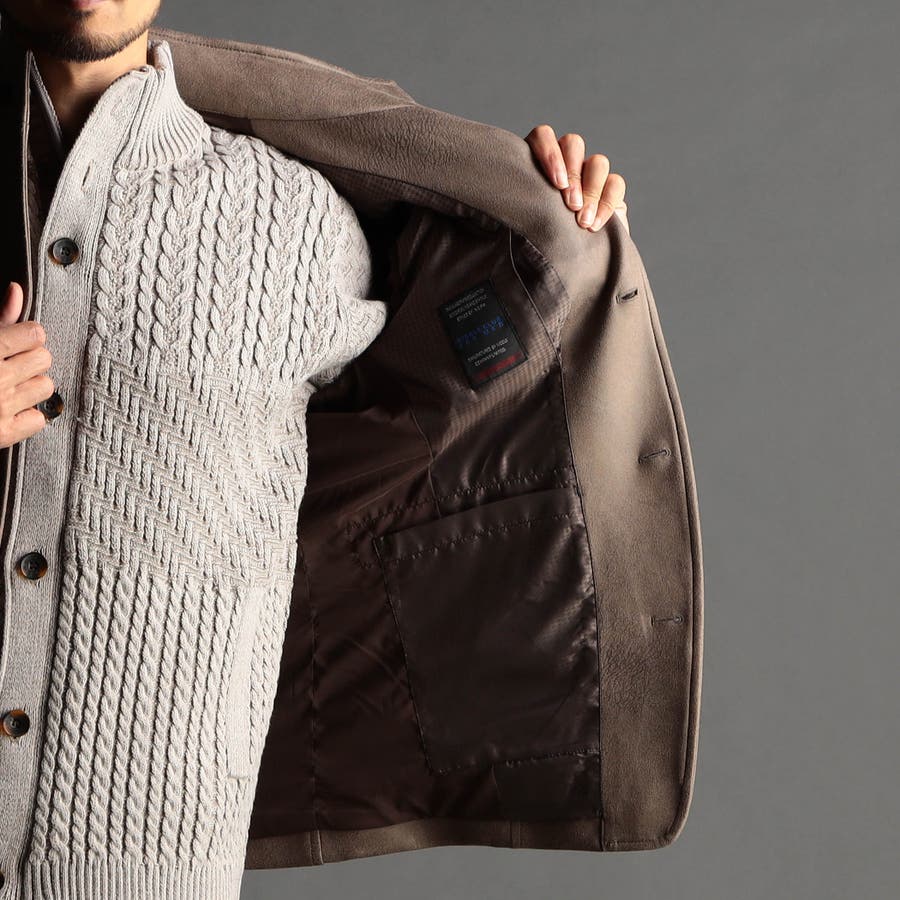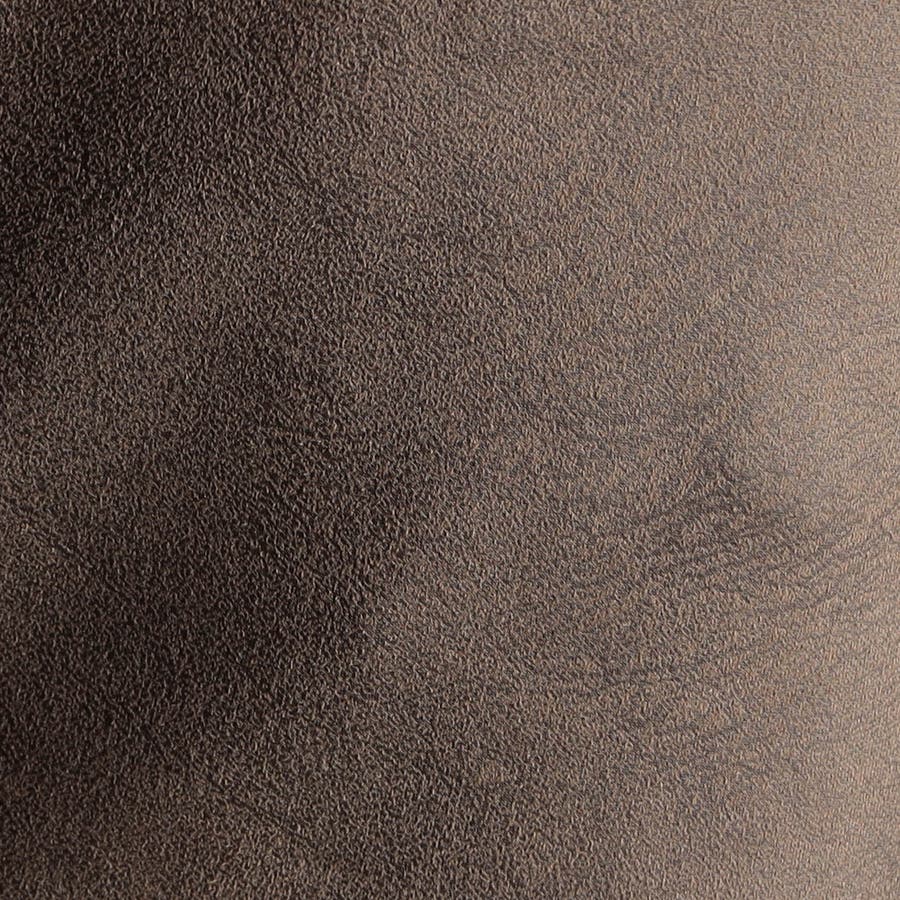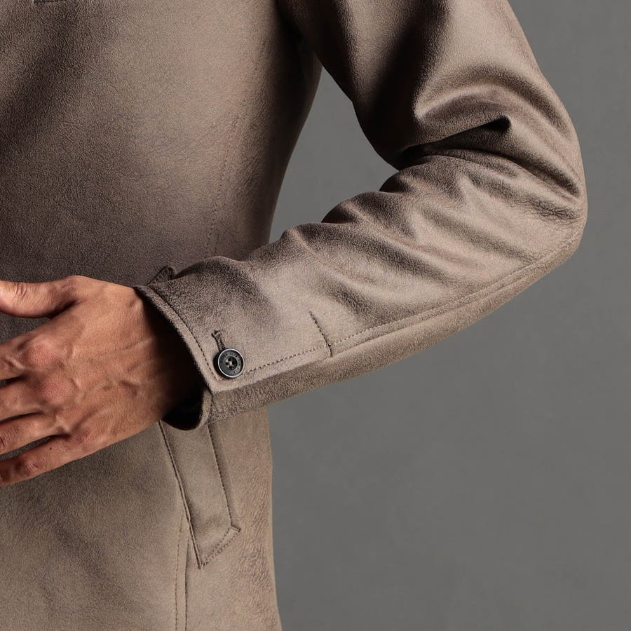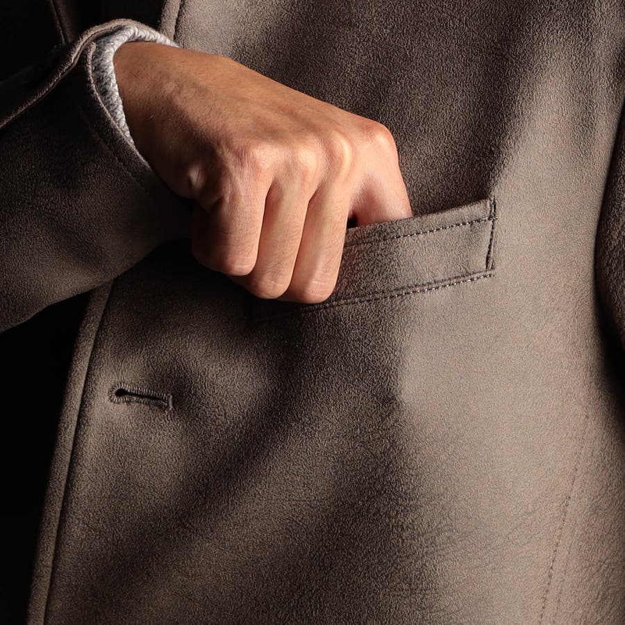 ポリエステルのマイクロファイバーで編まれたポンチ(ジャージ)素材の表面をスウェード起毛、トーン違いの同色系ムラプリントを施してレザー調の見え方に作っています。滑らかなタッチとソフト風合い、マルチなストレッチ性が特徴。ジャージ素材なのではのプリッとした横張り感もあり、シルエットを綺麗に作ります。更に生地加工で撥水効果をプラス、防汚効果を高めています。