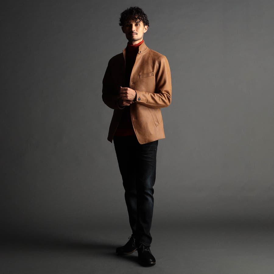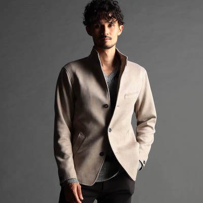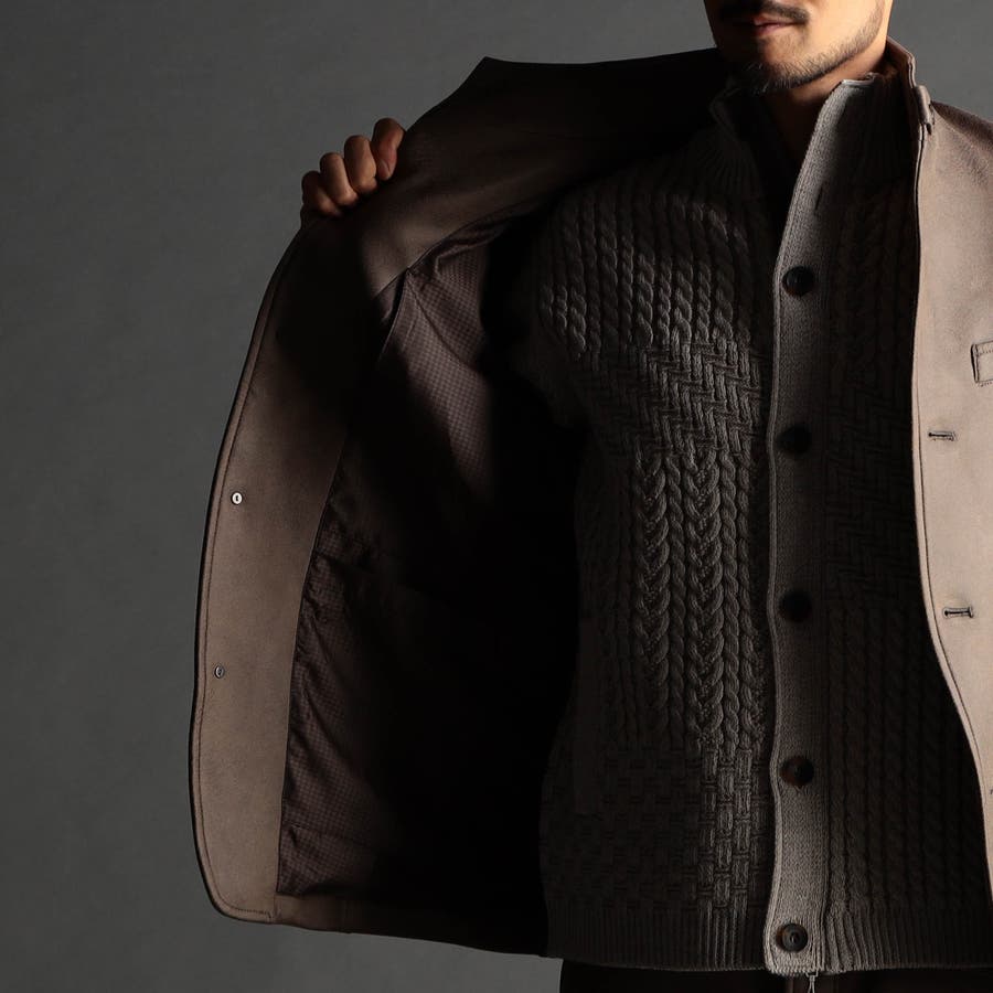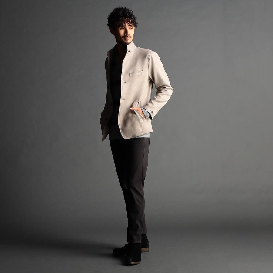 スタンド、イタリアンカラーのカヴァーオールデザインジャケット。衿端にはワイヤーを入れ、その衿部分は折り返してラペルとしても綺麗に収まる設定です。衿タブで上まで止める事が出来るので防風性もあり、ストレッチ裏地を採用した総裏仕様なので着心地も抜群です。左胸ポケットはフェイクチーフ仕様、袖口は本切羽、腰ポケットは斜めに作り使いやすくしています。(一番下の釦は止める設定になっていませんのでご注意ください。)