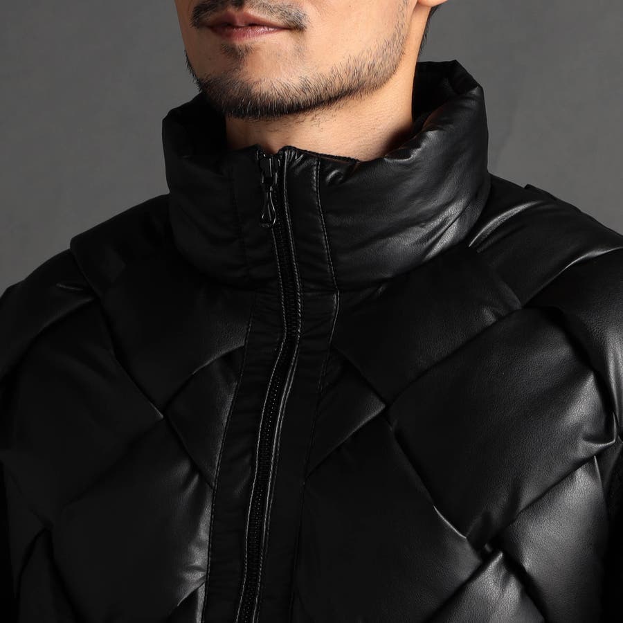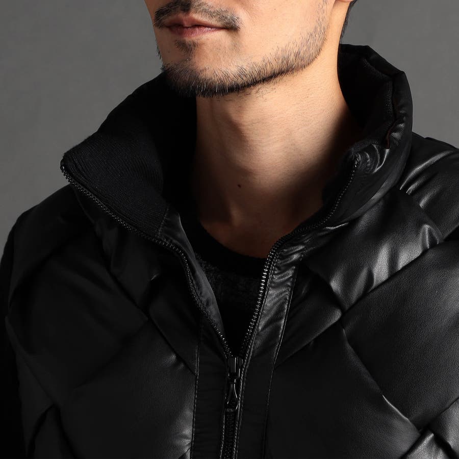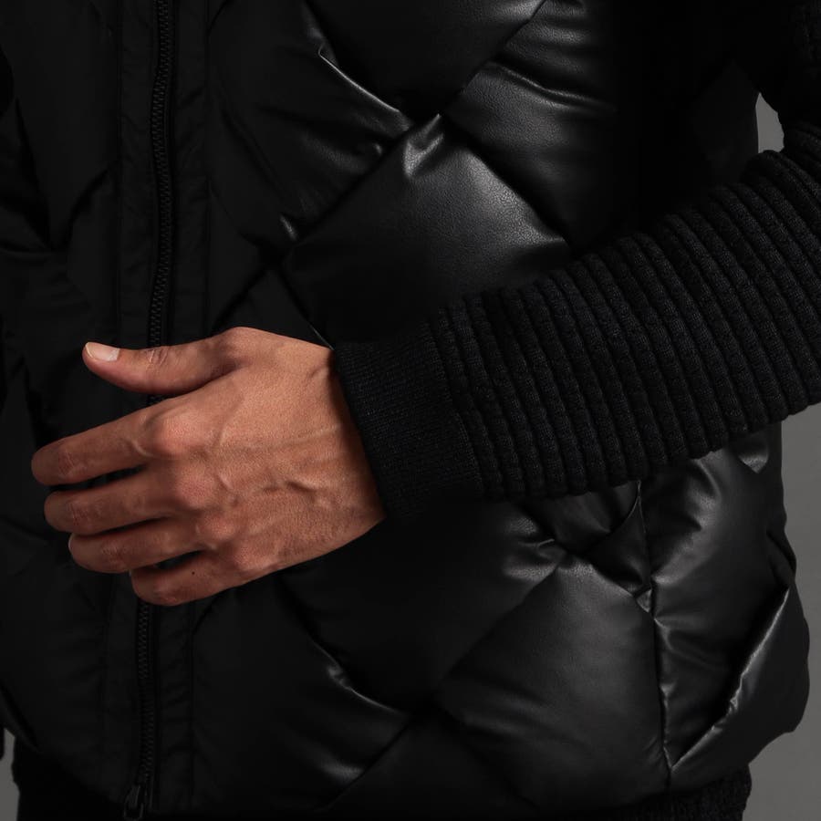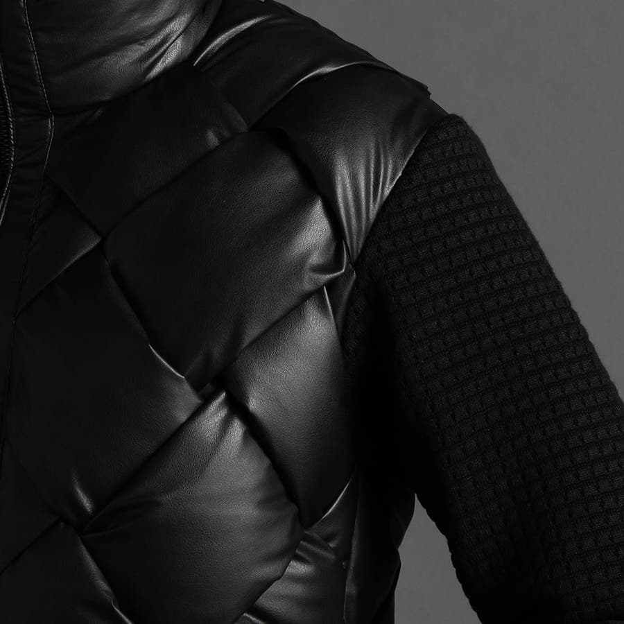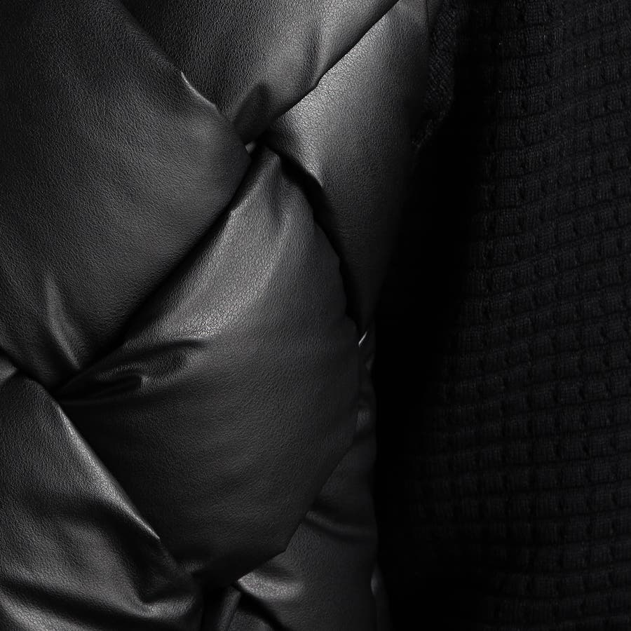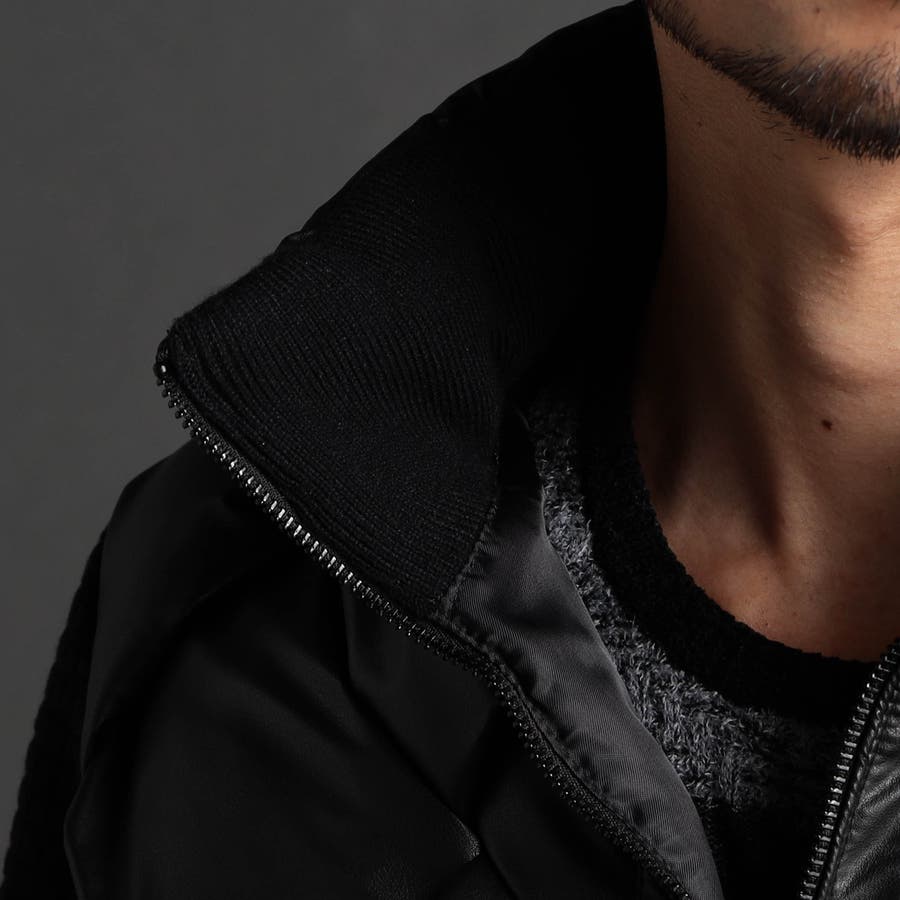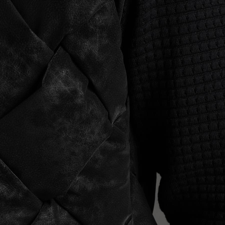 ポリウレタンシートに特殊プリントを施したタフタ素材。合成皮革扱いになります。91その他2は、スムースレザー調の無地の黒。92その他3は、フロッキープリントの様なムラ柄プリントの生地になります。奥行きのある見え方がリアルな風合いまで感じます。袖のニット部分は、しっとりした風合いのレーヨン糸がメイン、形態安定性と軽量感を出す為、ポリエステル糸を合わせ、度目が詰まった感じの肉厚感とキックバックの効いたストレッチ性を出す為にナイロン糸を使い、編み方をワッフル調にして地厚感を出しています。衿や小パーツにはシートタイプの中わたを採用して型崩れしにくくしています。