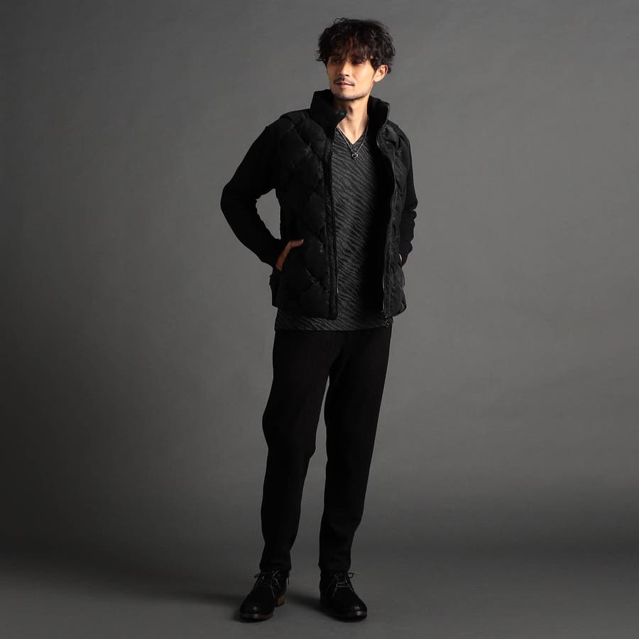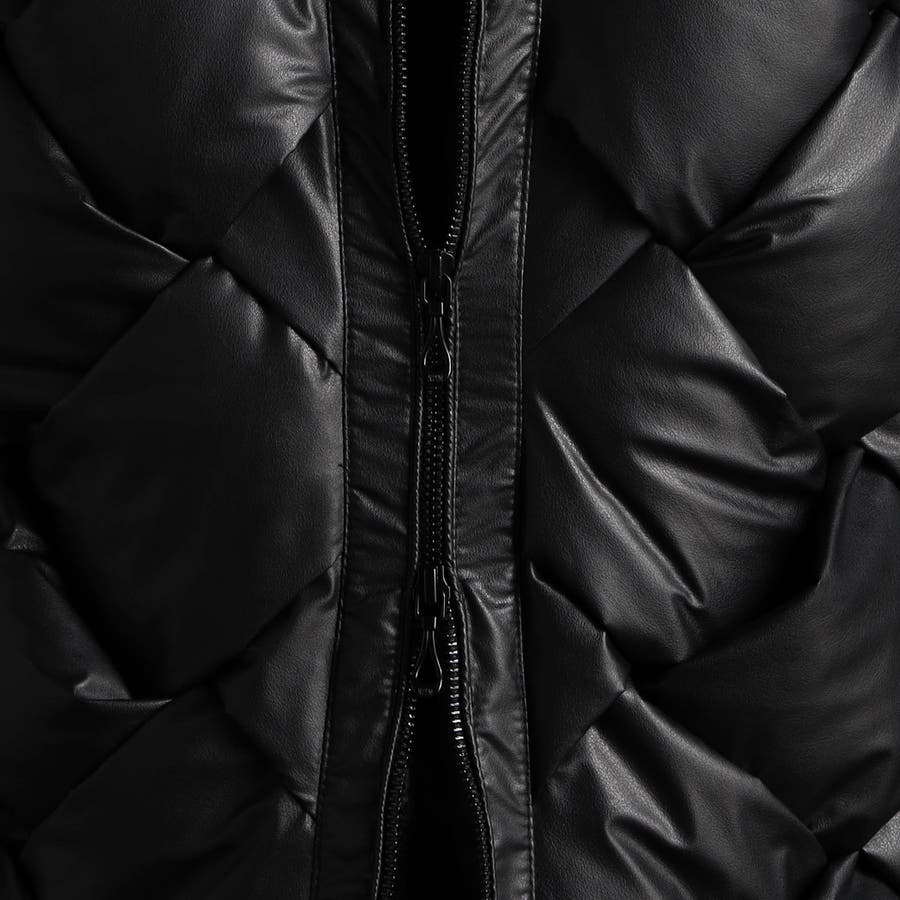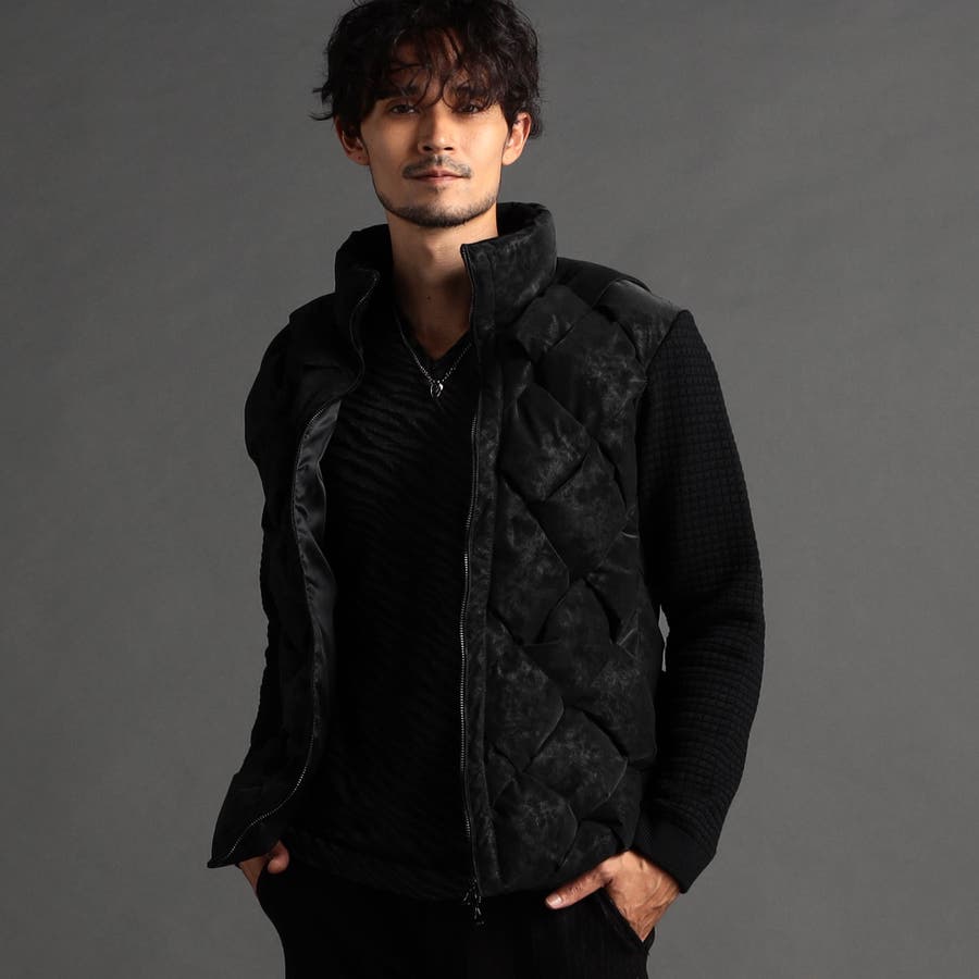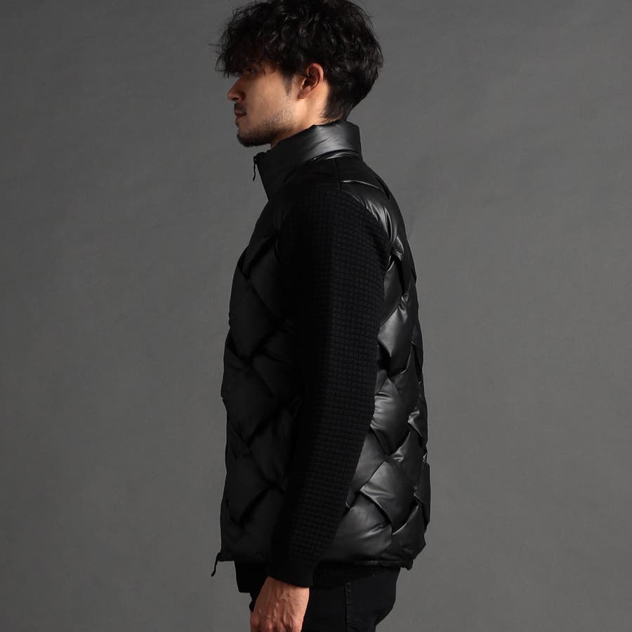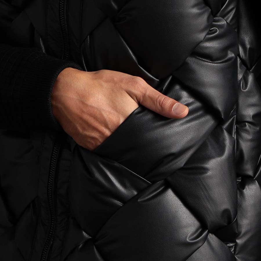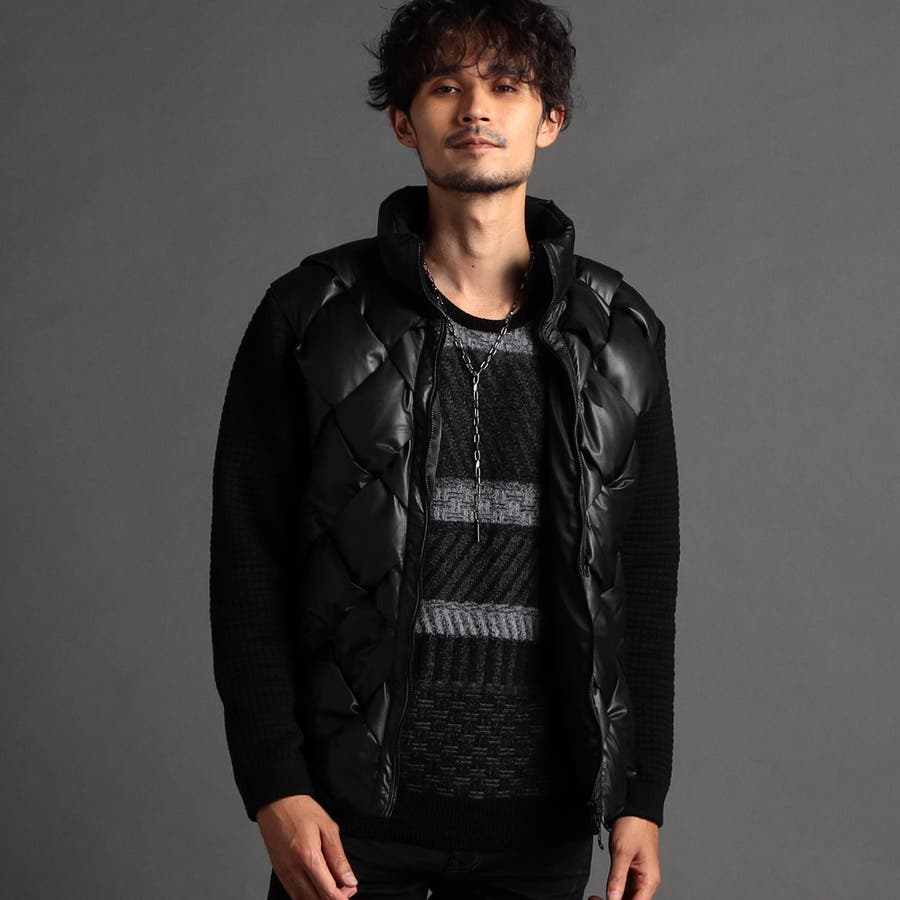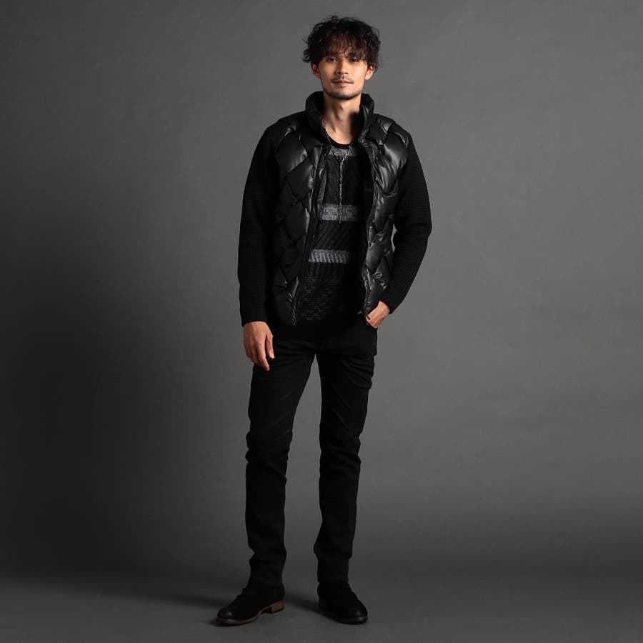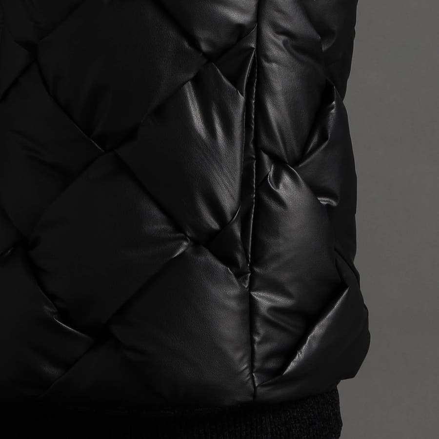 ポリウレタンシートに特殊プリントを施したタフタ素材。合成皮革扱いになります。91その他2は、スムースレザー調の無地の黒。92その他3は、フロッキープリントの様なムラ柄プリントの生地になります。奥行きのある見え方がリアルな風合いまで感じます。袖のニット部分は、しっとりした風合いのレーヨン糸がメイン、形態安定性と軽量感を出す為、ポリエステル糸を合わせ、度目が詰まった感じの肉厚感とキックバックの効いたストレッチ性を出す為にナイロン糸を使い、編み方をワッフル調にして地厚感を出しています。衿や小パーツにはシートタイプの中わたを採用して型崩れしにくくしています。